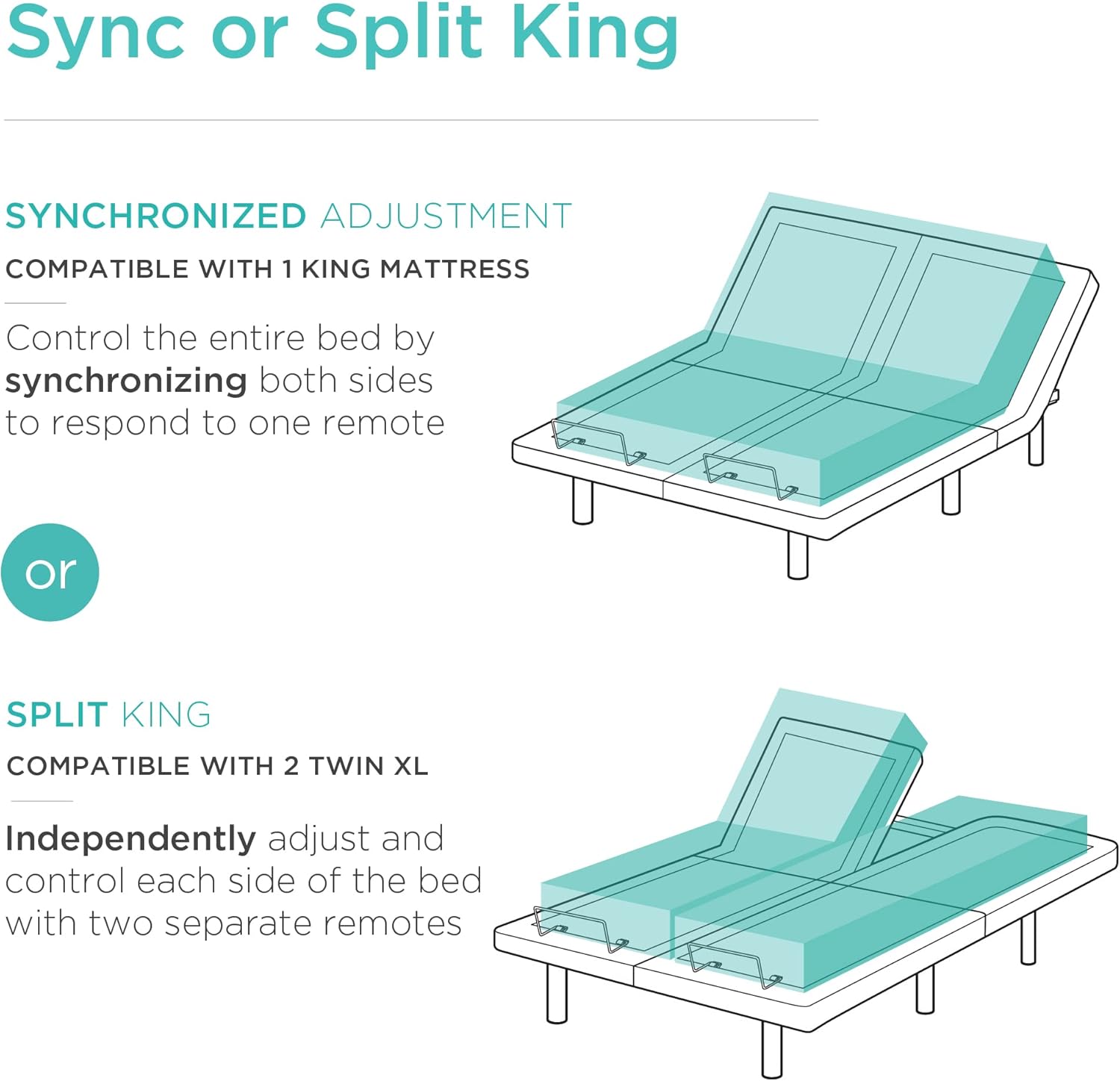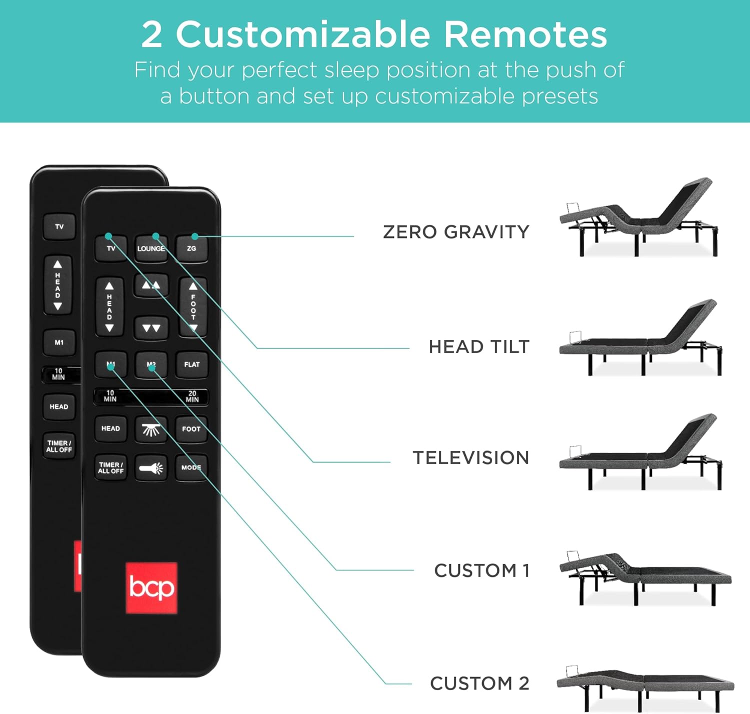 • ADJUSTABLE POSITIONS: Find your ultimate sleeping position; choose from the TV. Head-Tilt. and Zero Gravity preset positions. or add your own customized options; Note: King size variant comes with two adjustable platforms