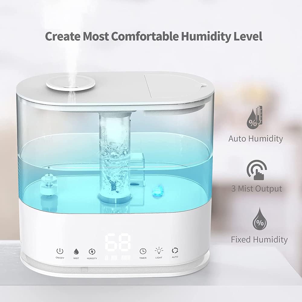 - AUTO HUMIDITY MODE: Maintain a healthy humidity level automatically with a built-in intelligent sensor. It will keep home inside humidity during 40%~60%. Which is the best feeling for body. Our air humidifier for large room works in rooms up to 400 square feet and lasts 45+ straight hours.