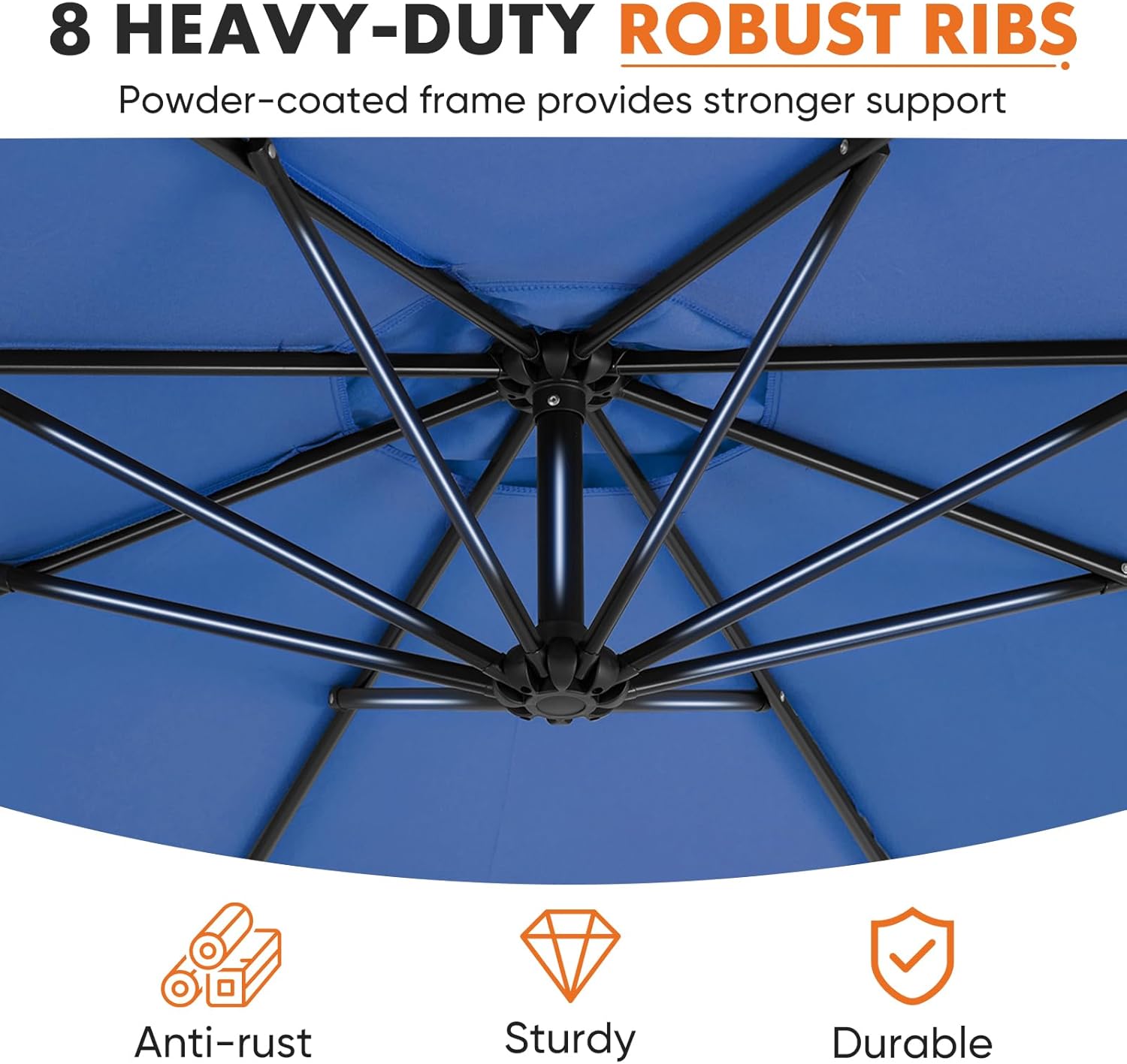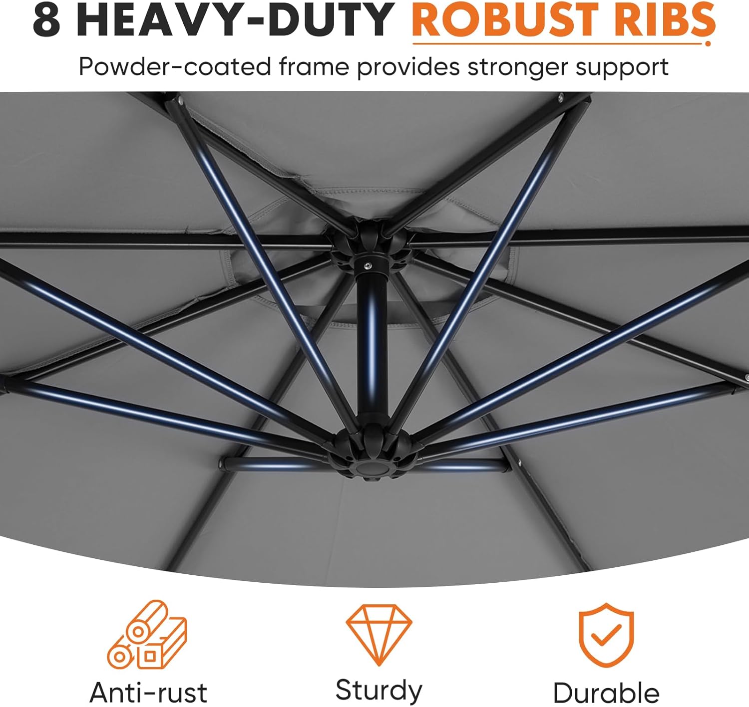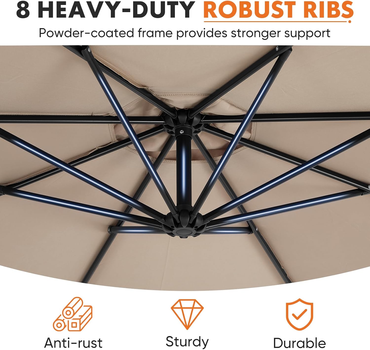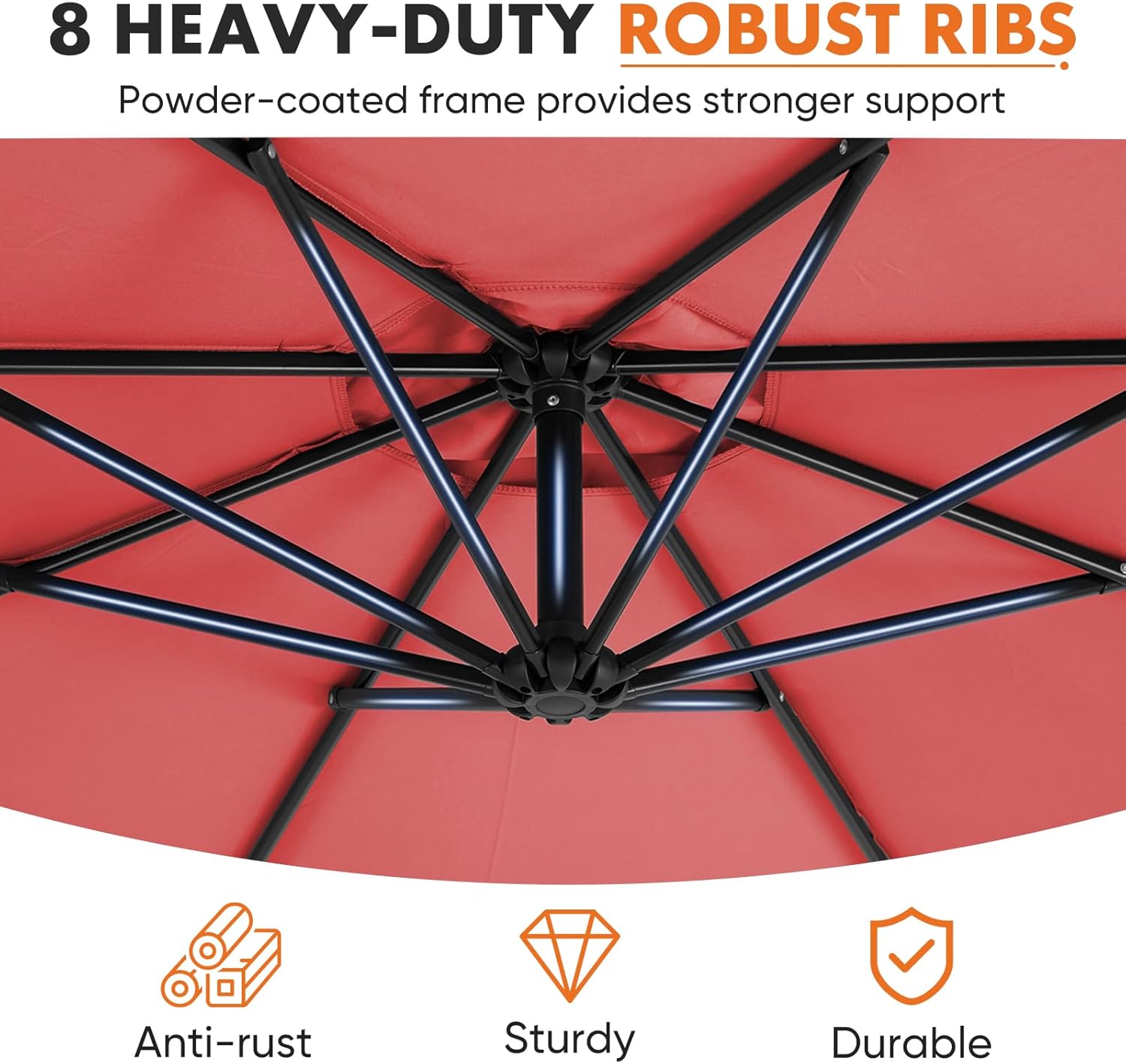 - Durable Frame Structure: Features a rust-resistant metal frame with powder coating and eight ribs for stable support and lasting shade protection.