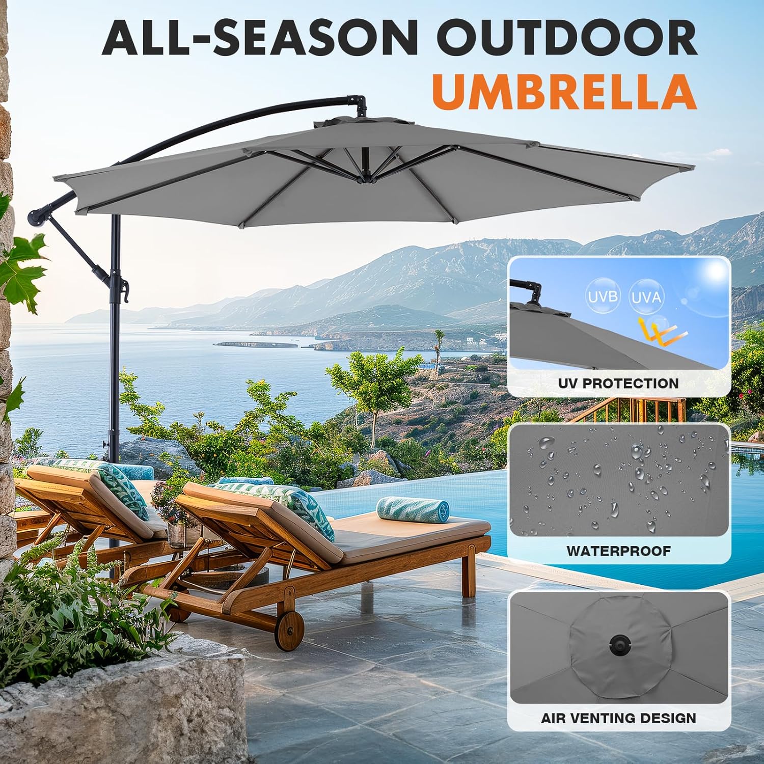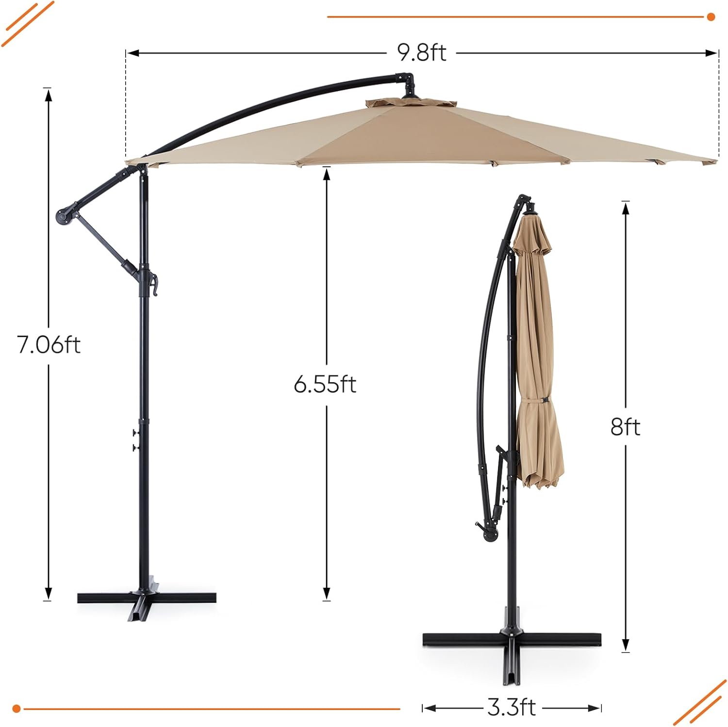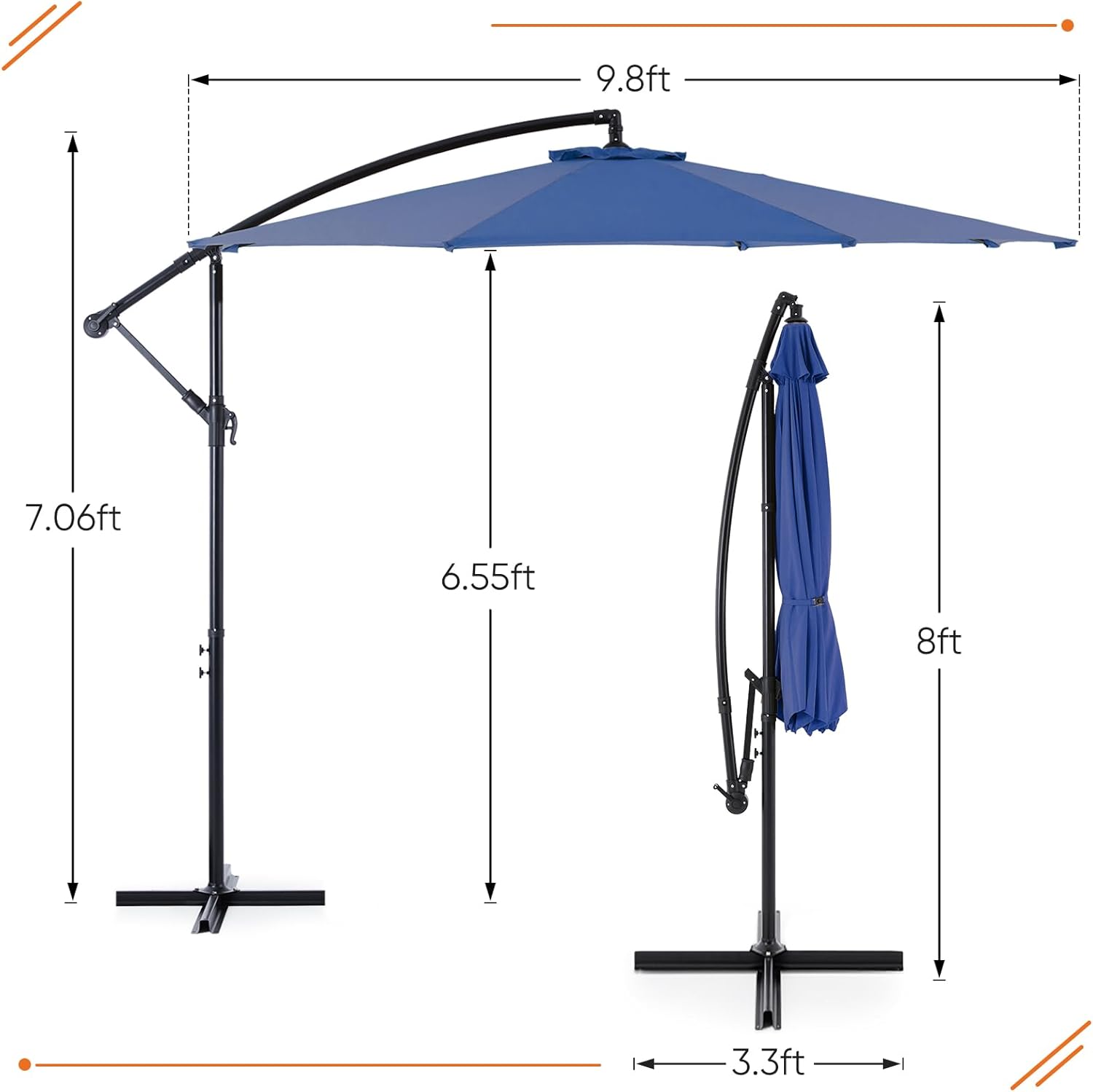 - Premium Canopy Material: Made with high- quality polyester fabric. the cantilever umbrella provides UPF50+sun protection and resists fading over time. Please store the offset umbrella indoors during extreme weather conditions for longevity.