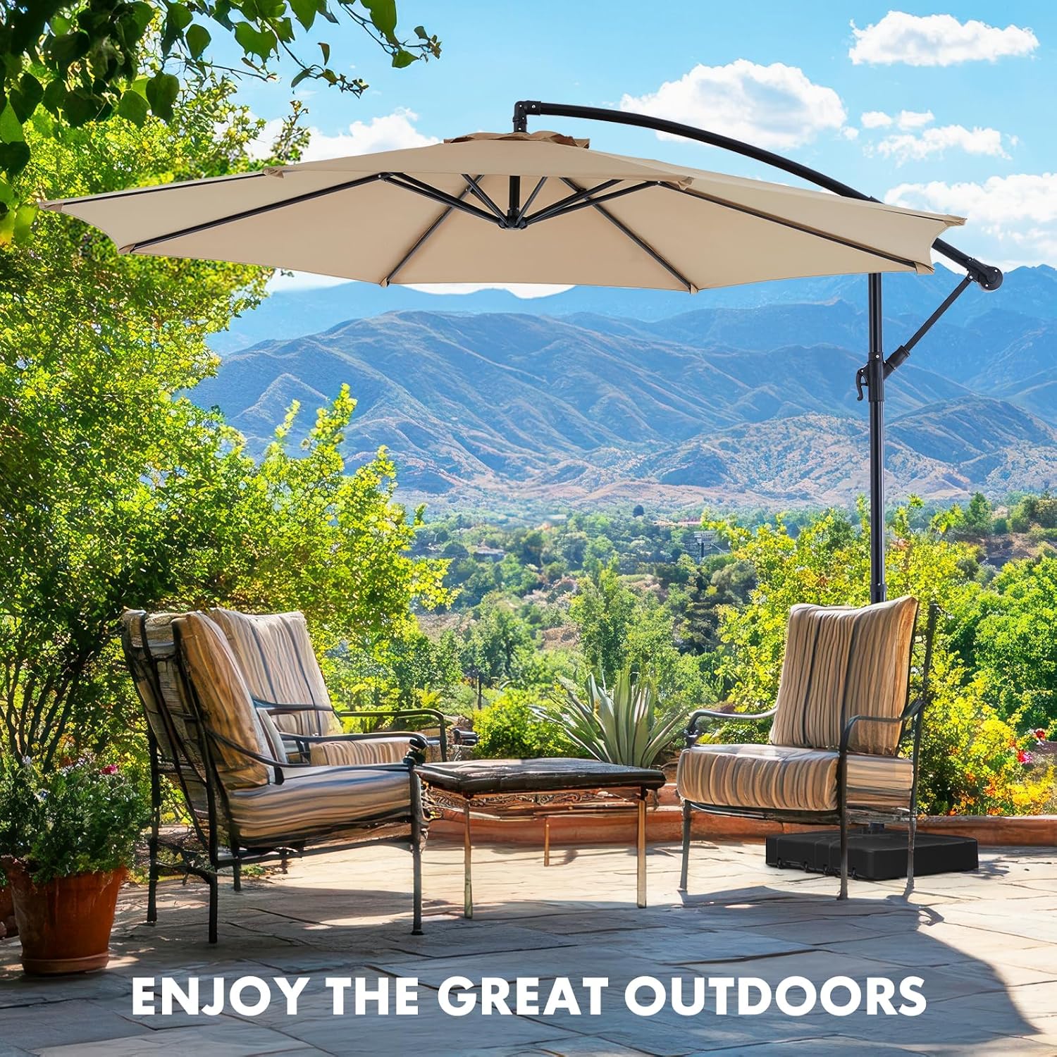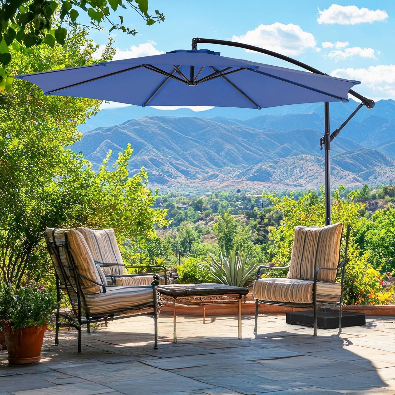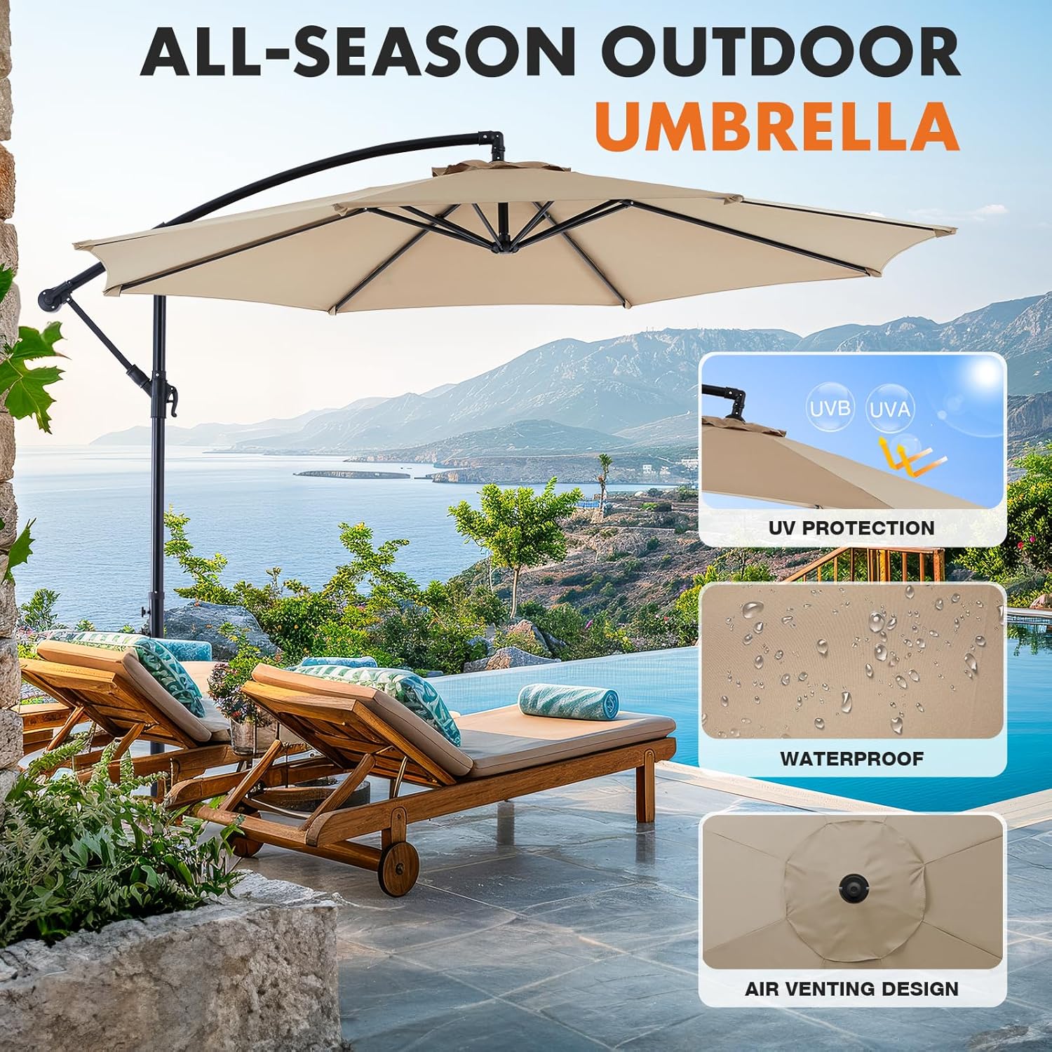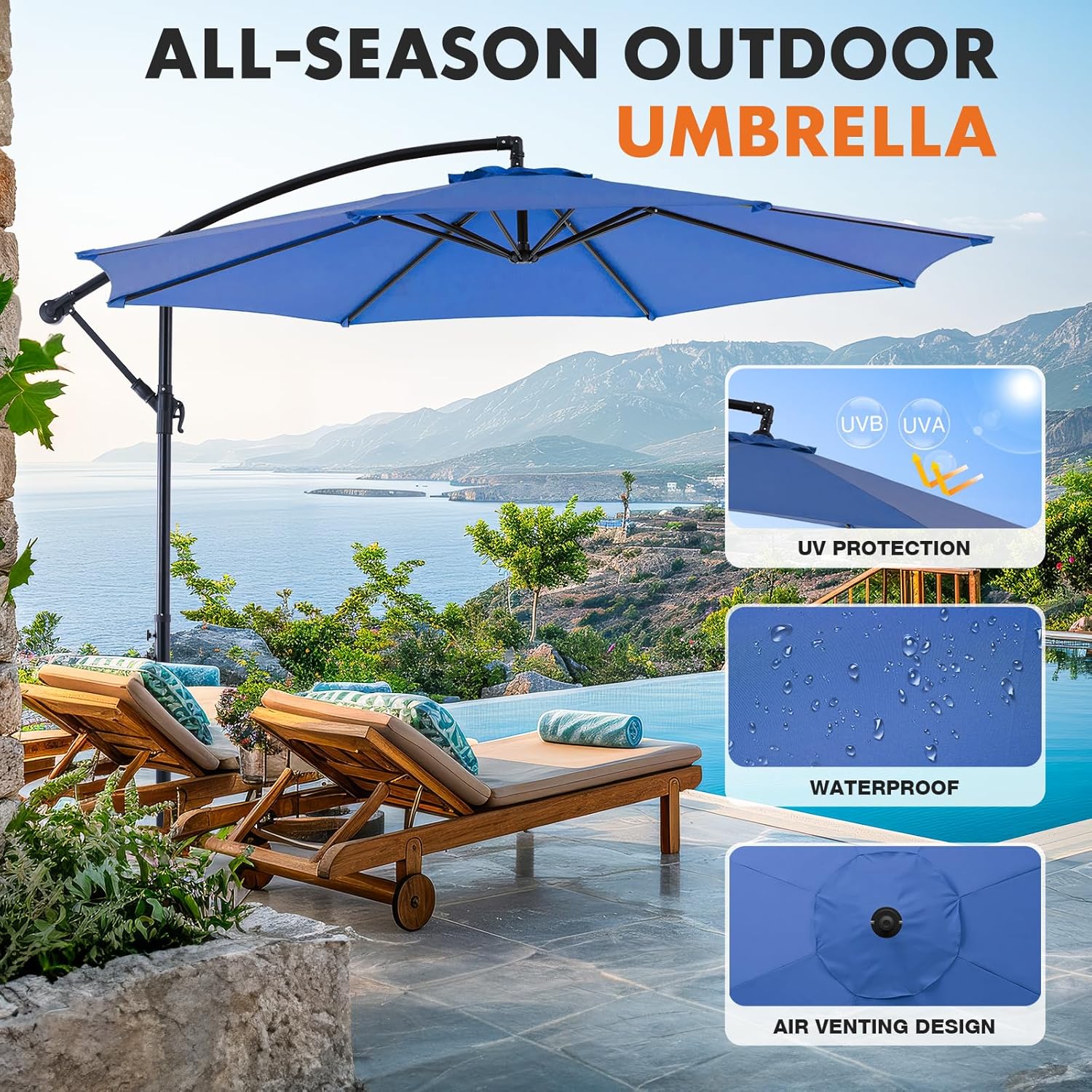 - Premium Canopy Material: Made with high- quality polyester fabric. the cantilever umbrella provides UPF50+sun protection and resists fading over time. Please store the offset umbrella indoors during extreme weather conditions for longevity.