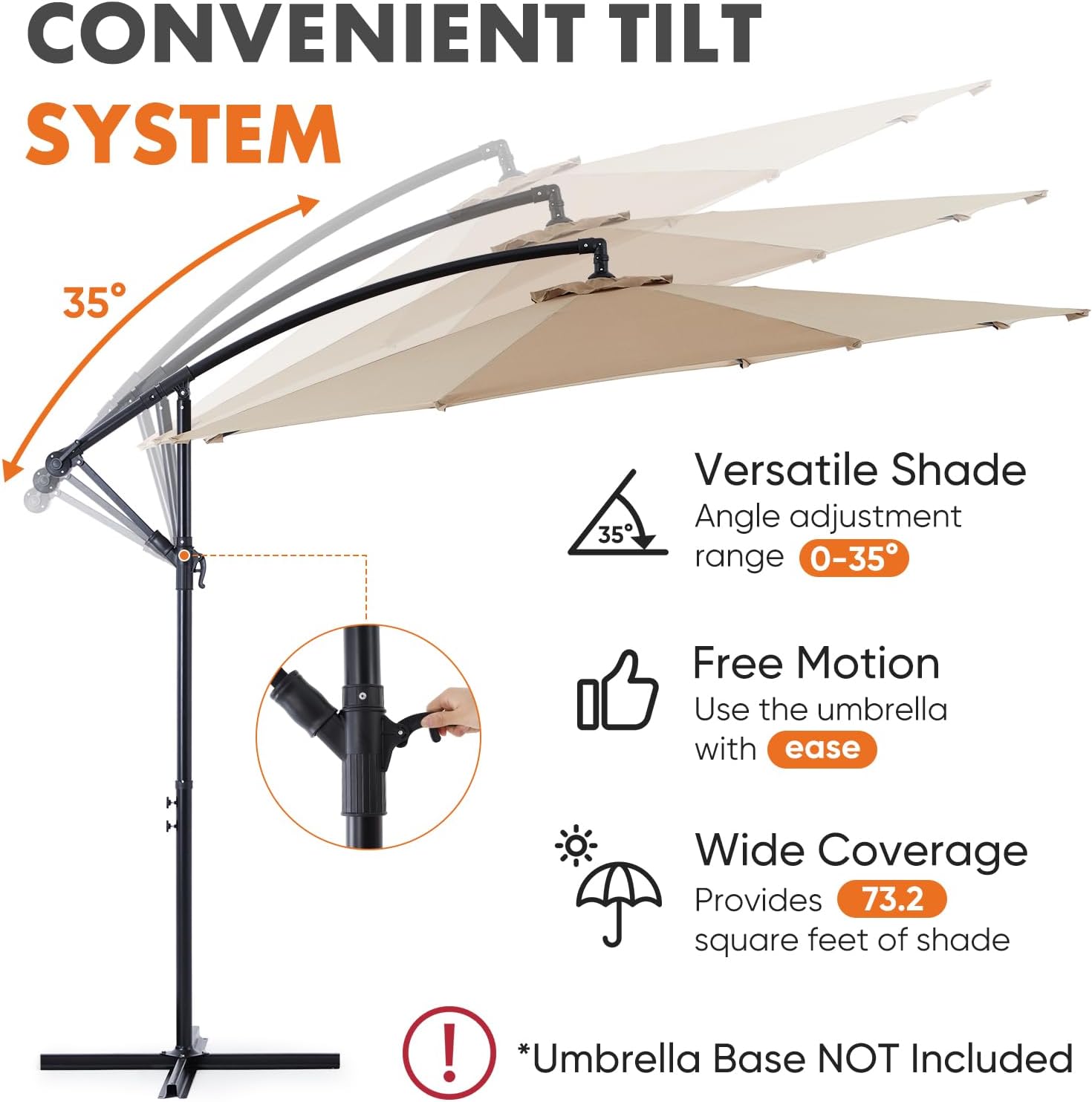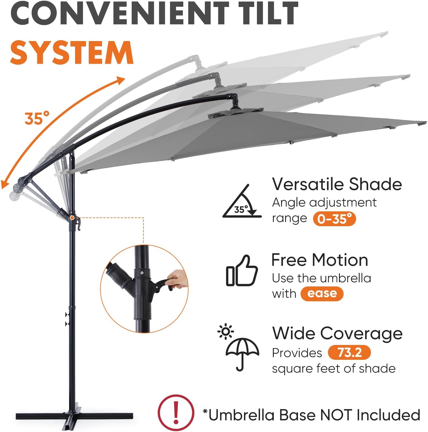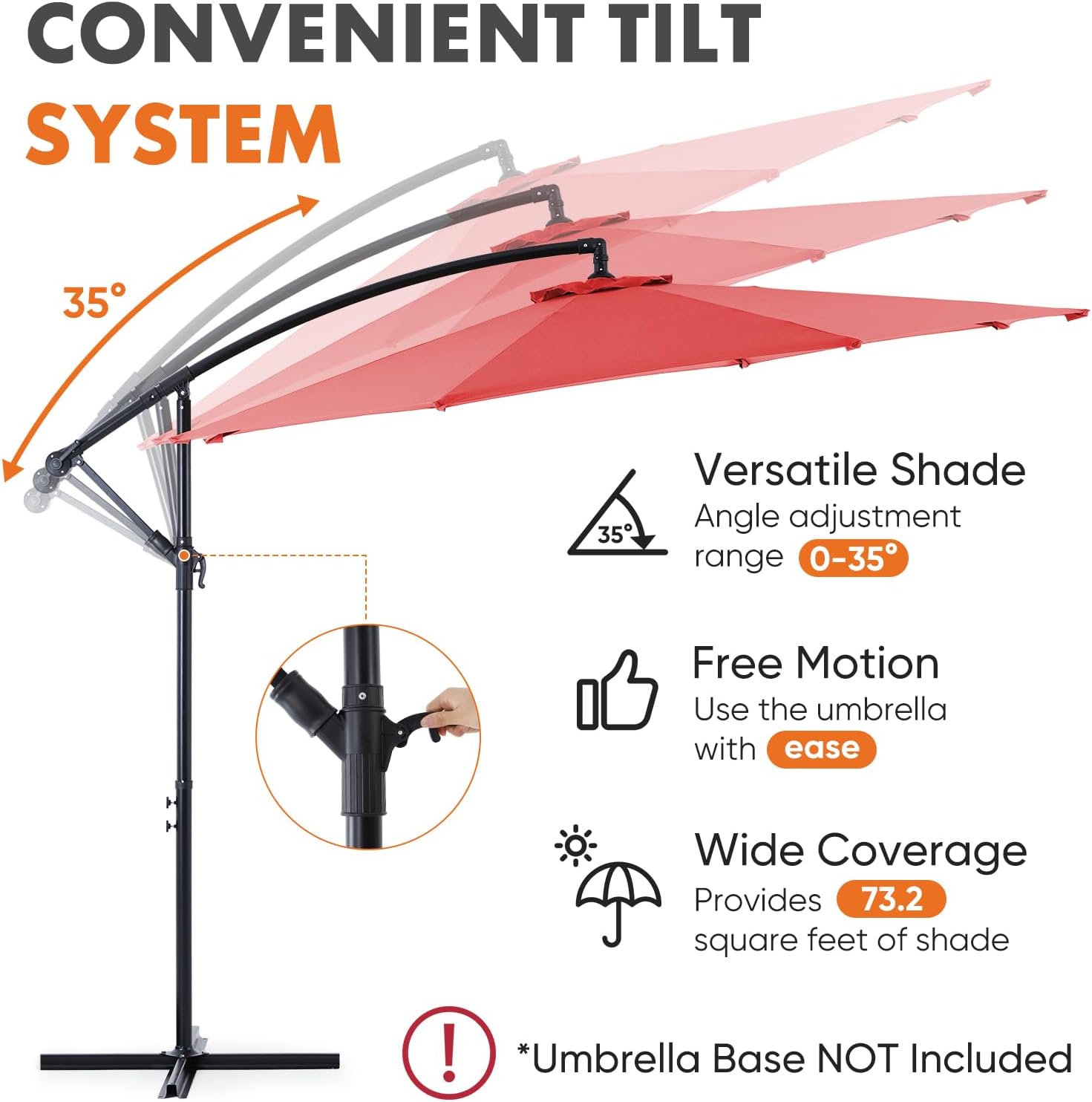 - Easy Tilt and Lift System: The user-friendly crank handle allows smooth operation for opening and closing the patio umbrella. Easily adjust the angle from 0-35 degrees to suit your preferences.