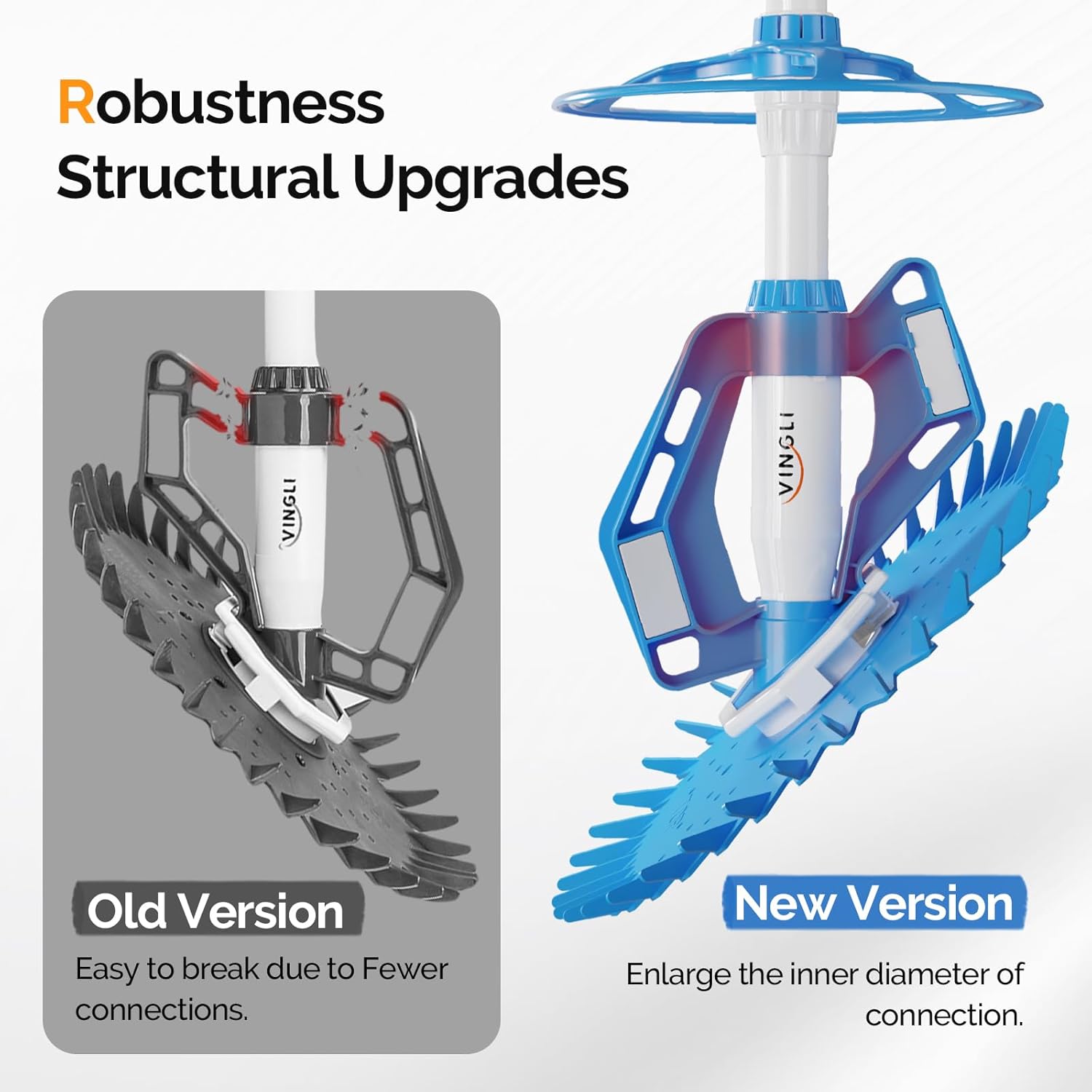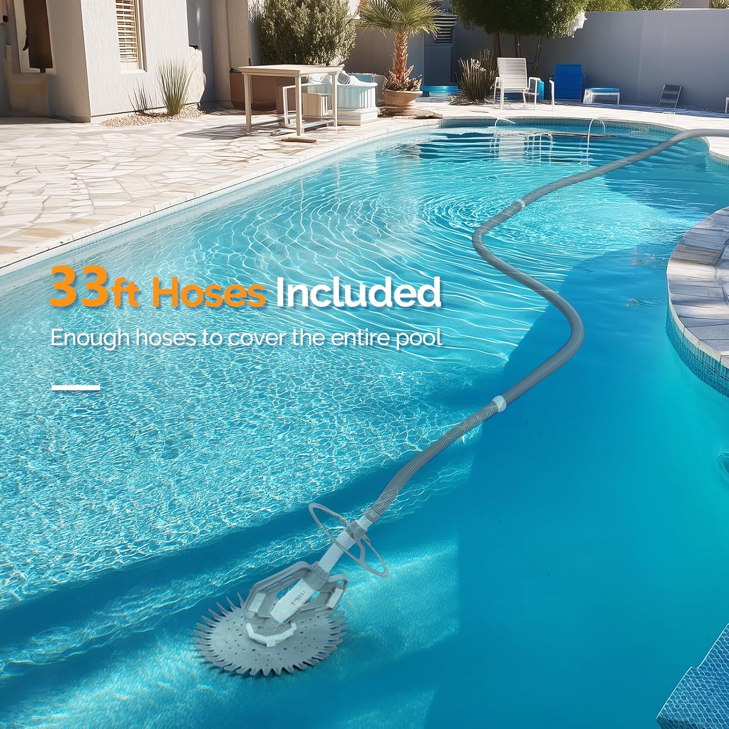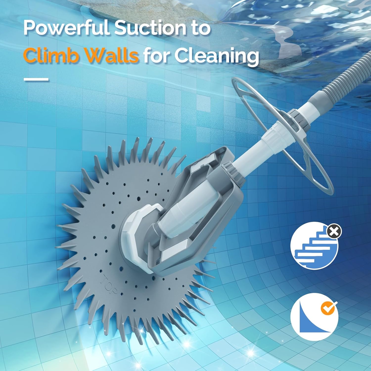 - Great Suction Power and Can't Stuck. This automatic pool cleaner for in-ground pools thoroughly cleans swimming pools including the walls! This pool vacuum canefficiently remove dirt. debris. Wheel Deflector for movement around tight corners.Scuff-resistant Long-Life Hoses eliminate scuffs on all pool surfaces.