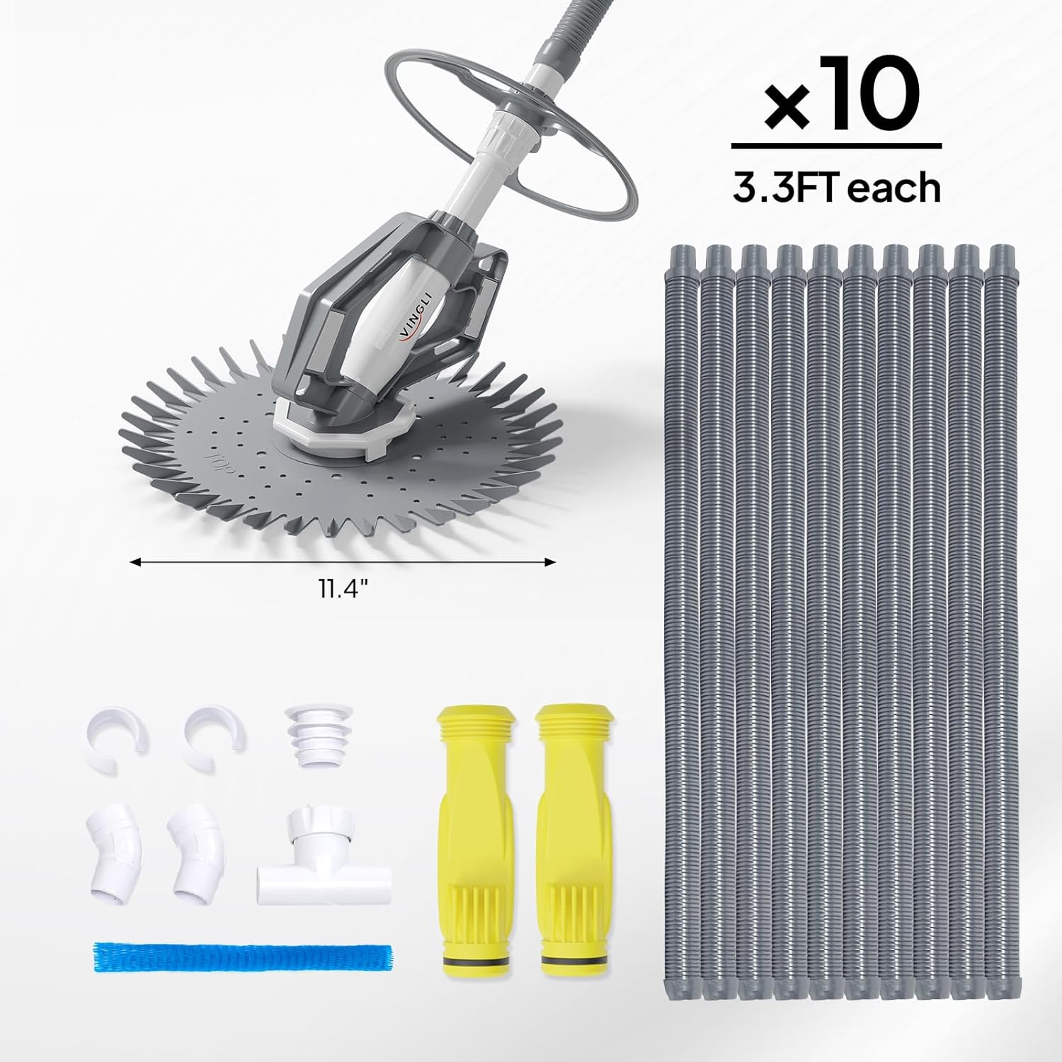 - Free Hoses. Our swimming pool vacuum come with ten 3.3FT durable hoses for replacement.You can attaches this pool sweeper to your existing filtration system.The caliber of the pipe is 1.5"