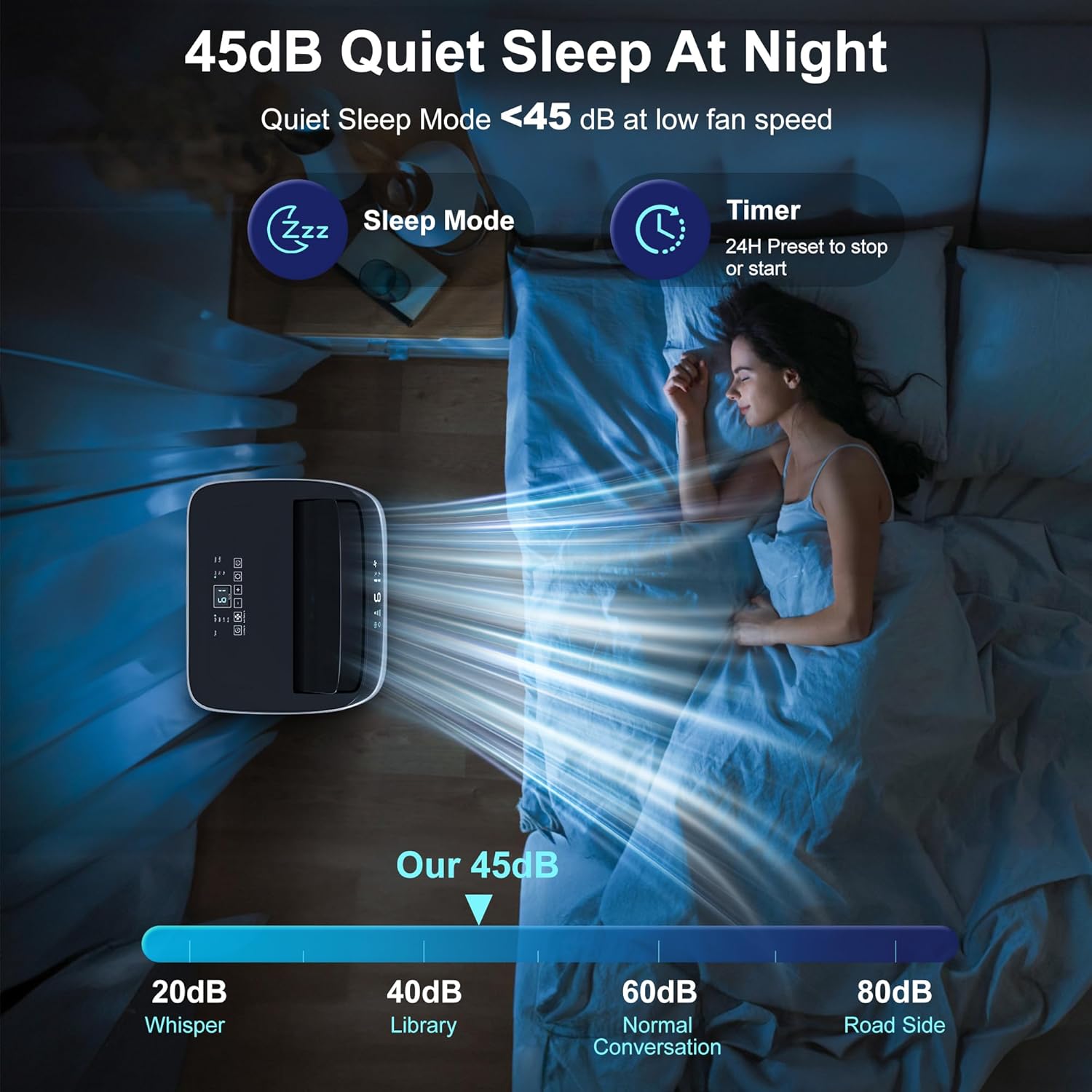 • 【Smart & Sleep Mode with 24H Timer for Enery Saving】 Built-in internal temp-sensor. Smart Mode enables the inverter ac unit run in Cool or Fan mode based on the room temperature. Keep the room at the most comfortable temperature 73F-77F. Sleep Mode will maintain an optimal temperature in low speed. and provide you less than 48dB quiet bedroom. You can also preset to stop the ac unit after 0.5-24 hours. all these funtional modes are money-saving and let you have a suitable temperature for relaxation and good sleep in the wonderful summer.