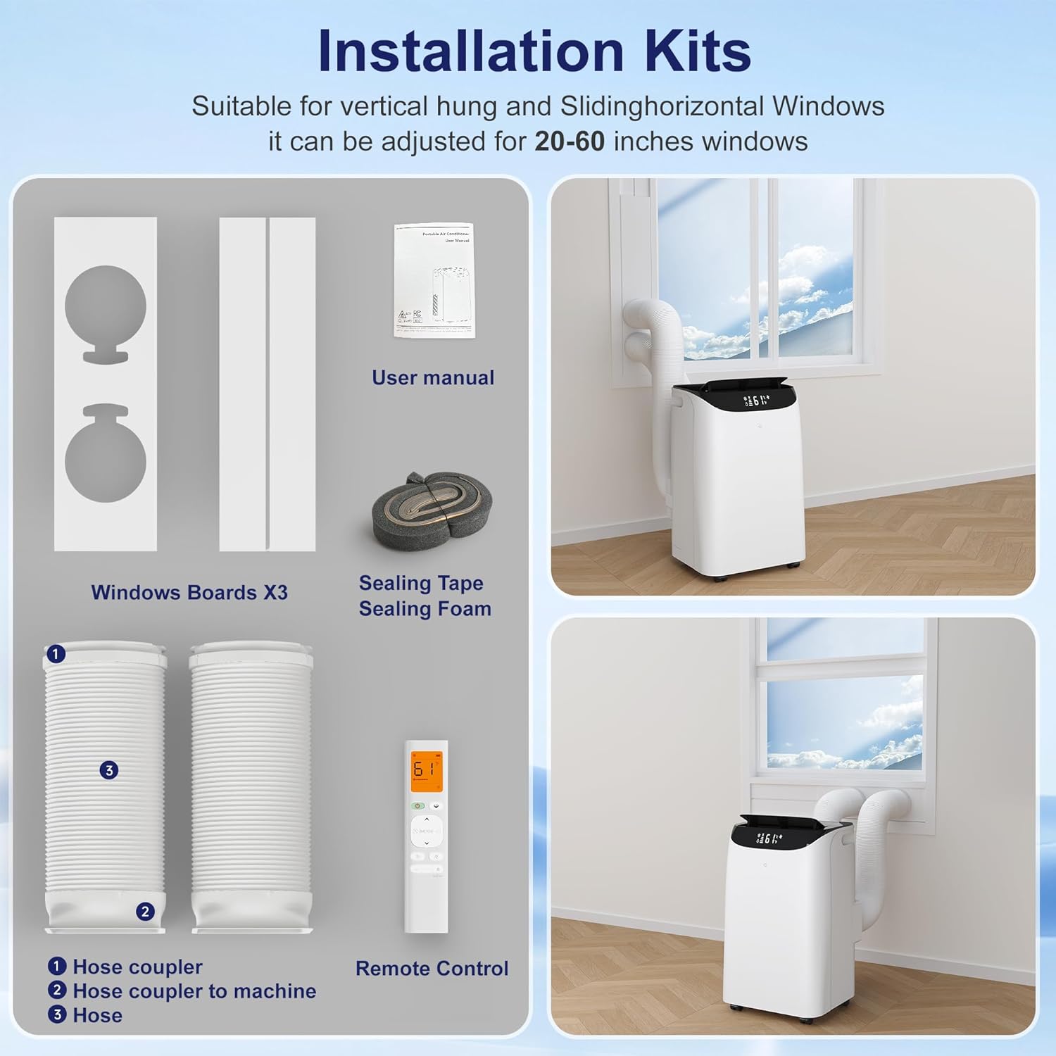 • 【Easy to Move & Install】 Our floor free stand up air conditoning machine comes with four 360° heavy-duty wheels and hidden handles on both sides so you can easily move the machine to any room. Windows sealing kit and exhaust hose are included in the portable ac package to ensure simple installation. and fit most vertical window and horizontal windows. Easy 3 steps to install: First attach the sealing boards to the window. Step 2 insert adapters of the exhaust hose to air conditioner and windows board. Step 3 plug in and enjoy the cooling air.