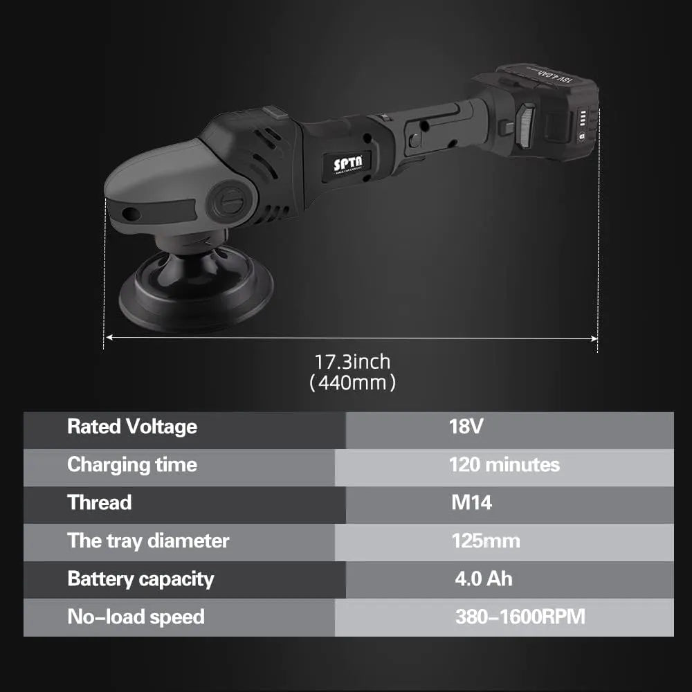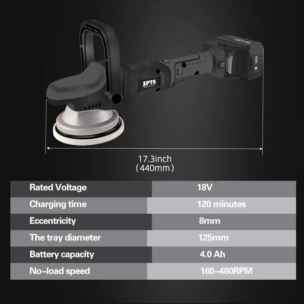 - 7 Variable Speed & Powerful 18V 4.0Ah Battery - SPTA Orbital Car Polisher is equiped with 7 variable speeds allows users to set speed from 2000-4800 orbits per minute for car waxing and buffing. 2Pcs 18V 4.0Ah battery can support above 60 mins working time after full charge for extending working time both indoors or outdoors. It is a standard-sized paint correction tool that has been specially designed to be economical and provide detailing freedom