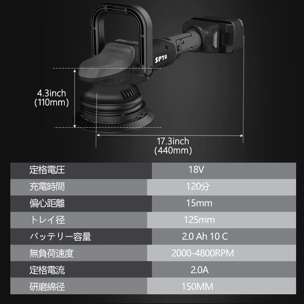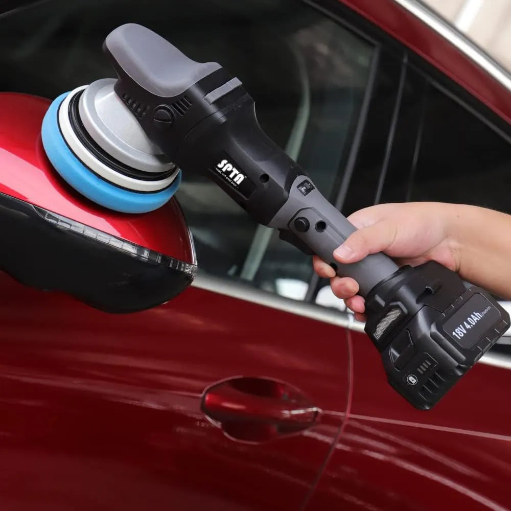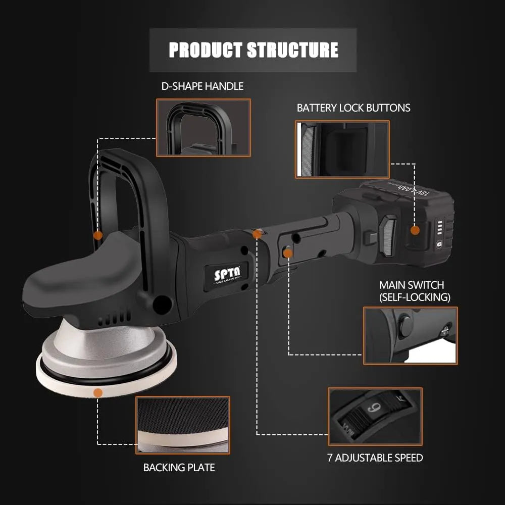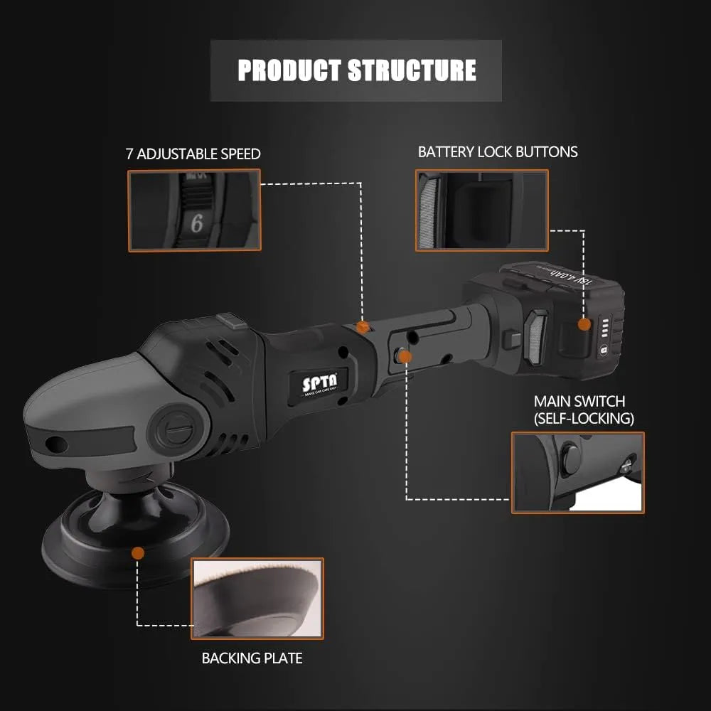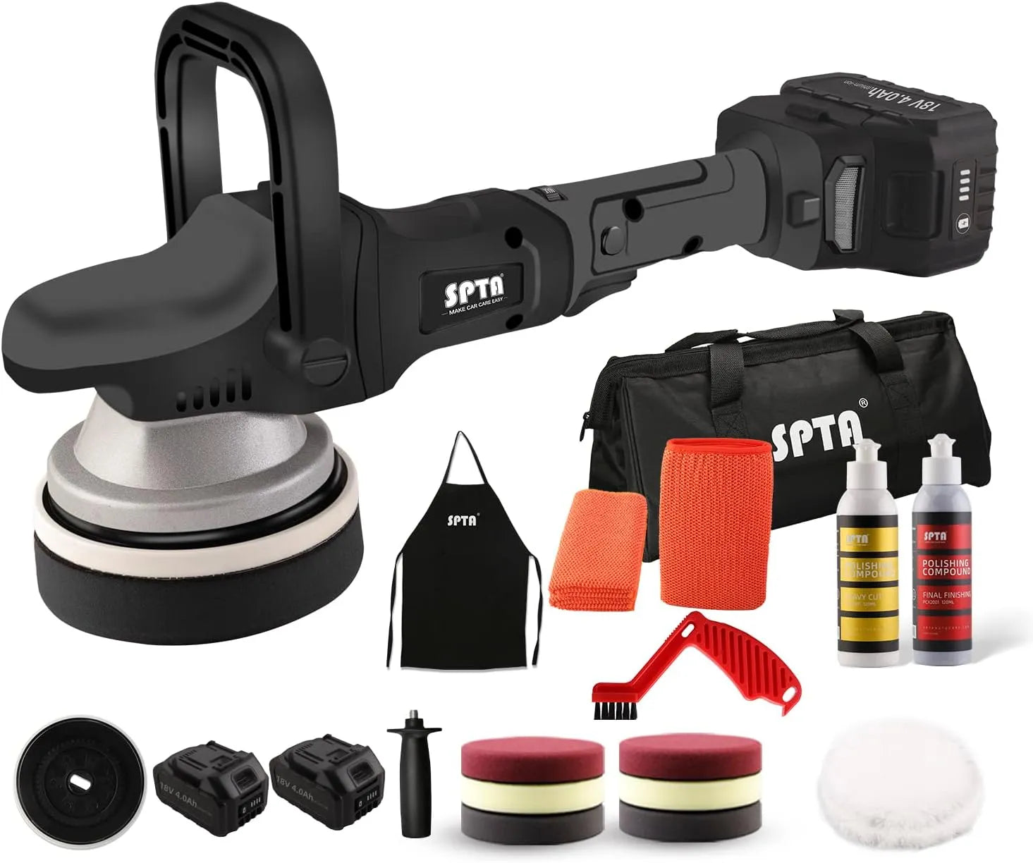 - CORDLESS POLISHER WITH BRUSHLESS MOTOR - The SPTA Cordless Polisher Gives you the freedom to work. high Performance brushless motor with low noise optimizes polish Efficiency. SPTA cordless dual action polisher. come with 2 rechargeable batteries. 6pcs sponge pads. 2pcs wool pad and 2pcs microfiber cloths. allow you to finish the job just by one step.Perfect for polishing and removing swirls. scratches. and defects from any car surfaces.