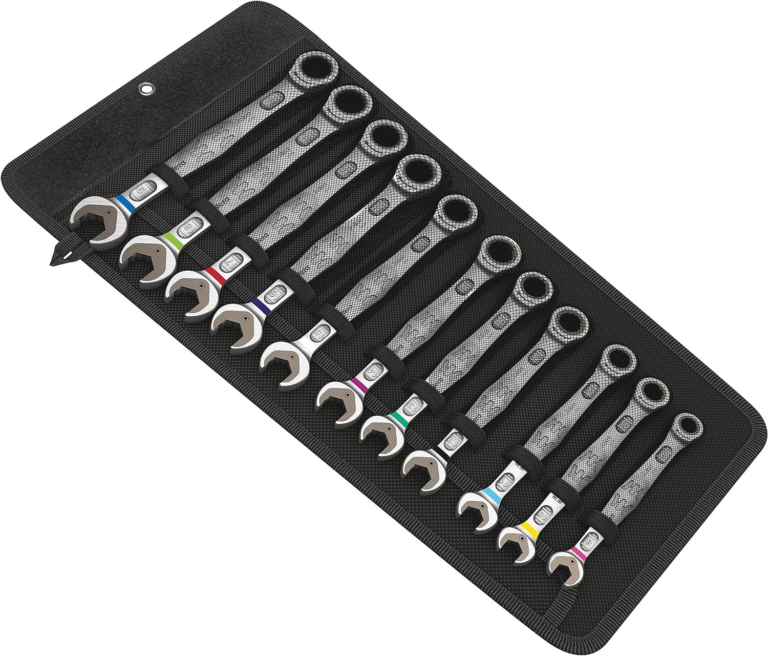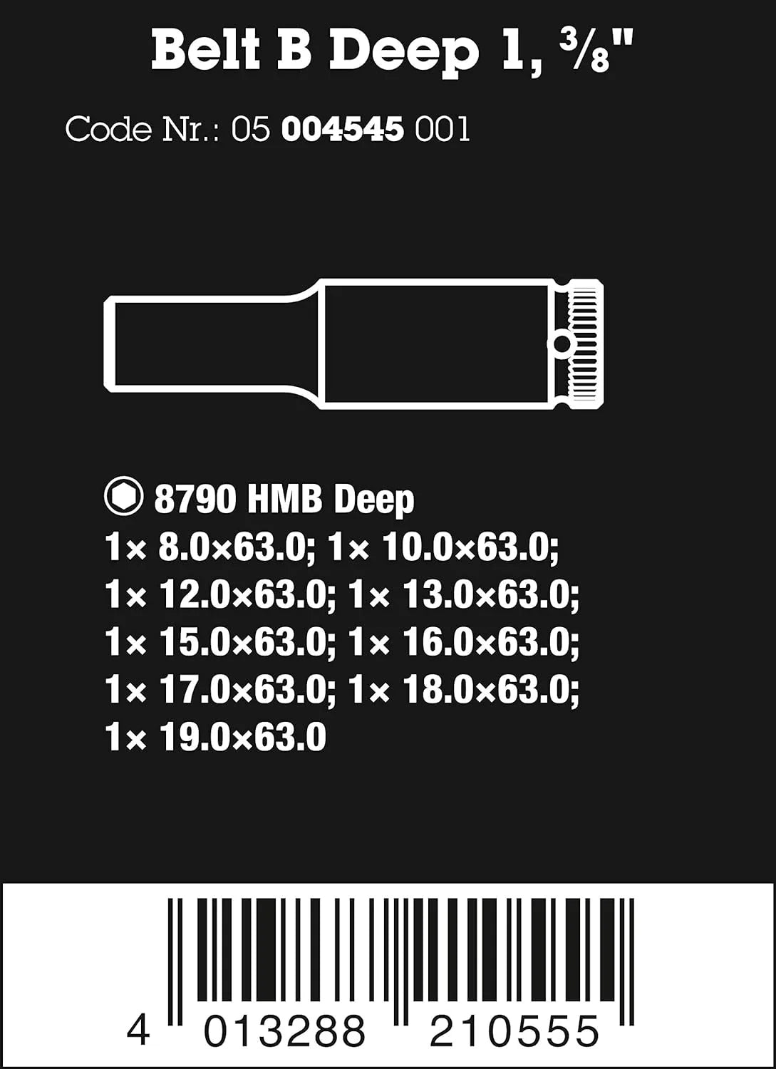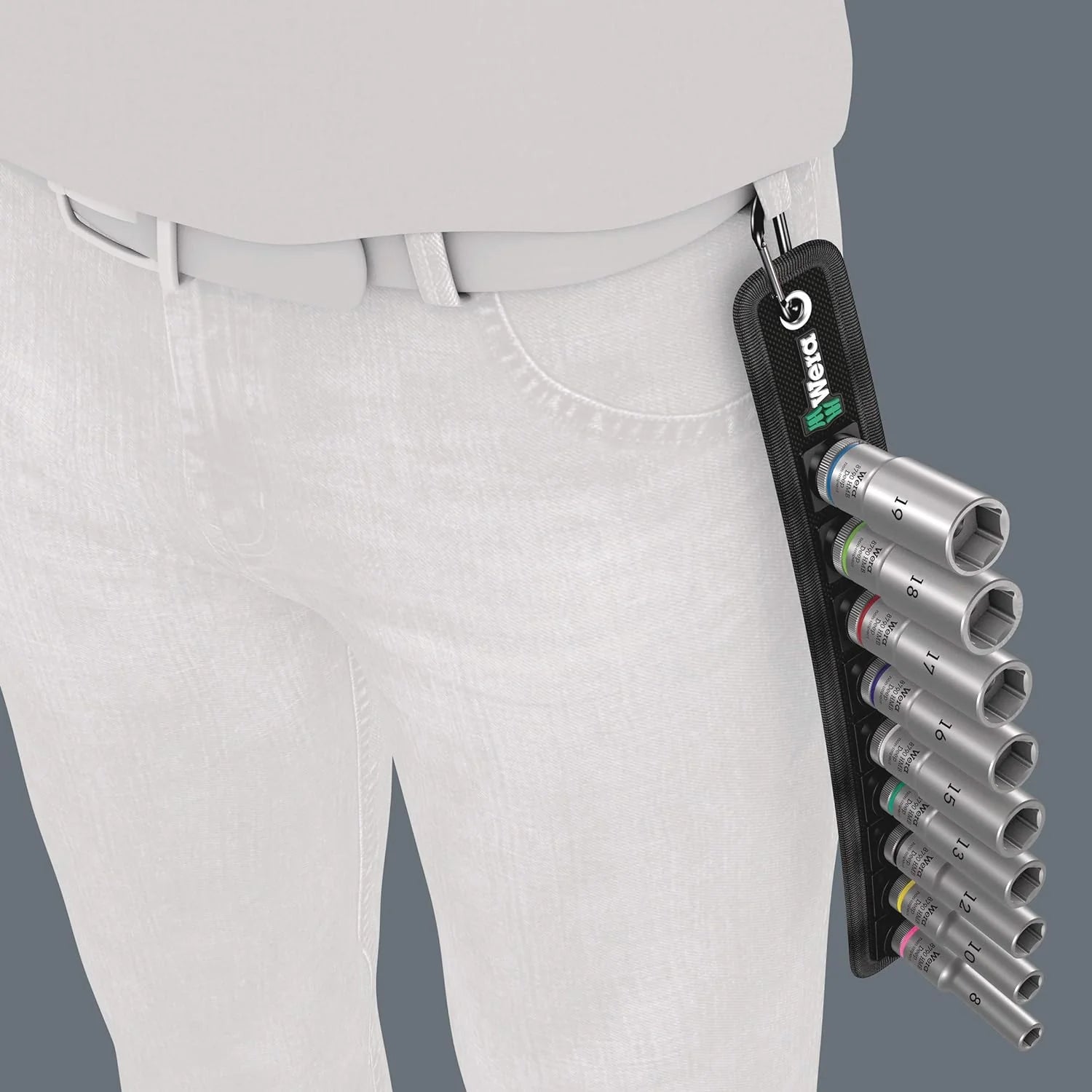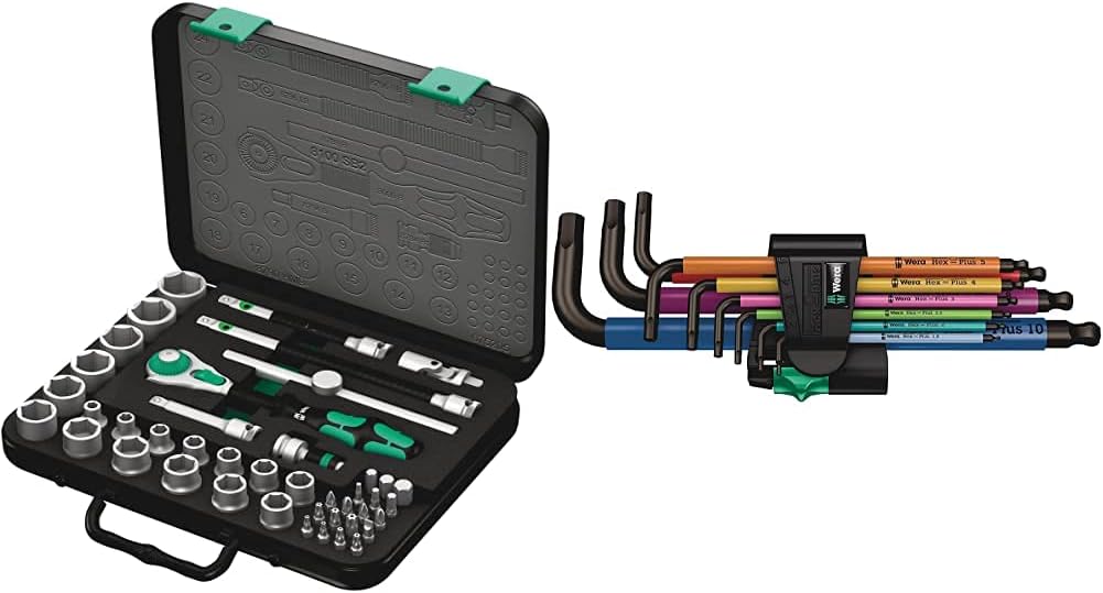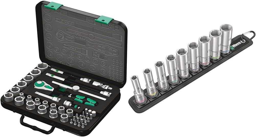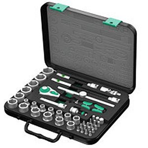 The hard materials used for the handle ensure quick and easy hand repositioning without any danger of the skin 'sticking' to the handle. The softer anti-slip zones enable the low-loss transfer of high torque. For 3/8" square sockets as well as 3/8" adaptors with square drive. equipped with ball lock. Including 18 Zyklop sockets. 2 Zyklop extensions with free-turning sleeve. 1 T-handle. 1 wobble extension. 1 universal joint. 1 adaptor with quick-release chuck. 18 bits. "Take it easy" Tool Finder with colour coding according to sizes.
