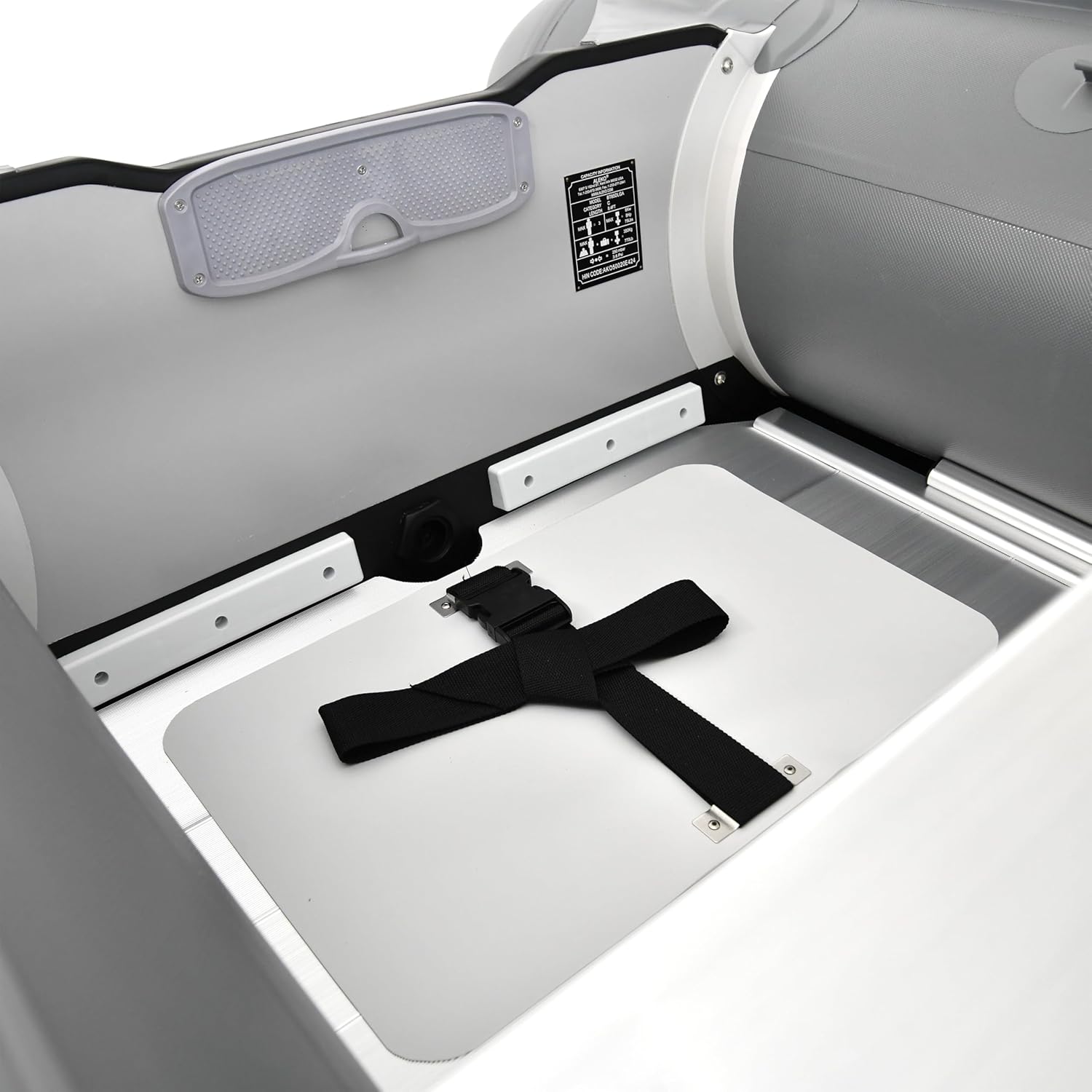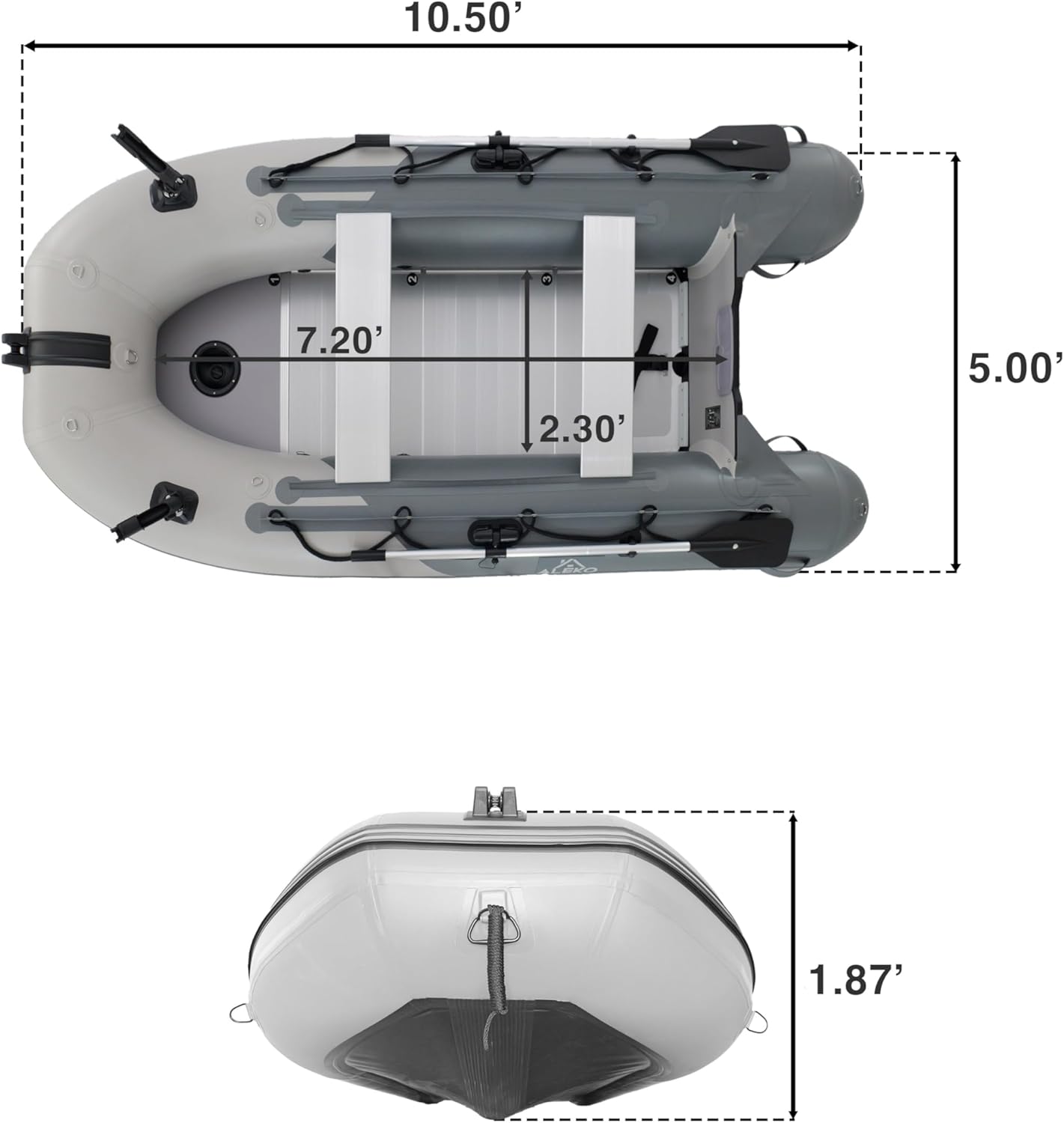- Heavy-Duty PVC & Aluminum Construction: Inflatable Dinghy is constructed from 2000 denier 1.2mm PVC with double-layer PVC on the bottom of the boat. The boat's flooring. bench. and oars are made from aluminum. Motor Capacity: 8 HP; 6 kW