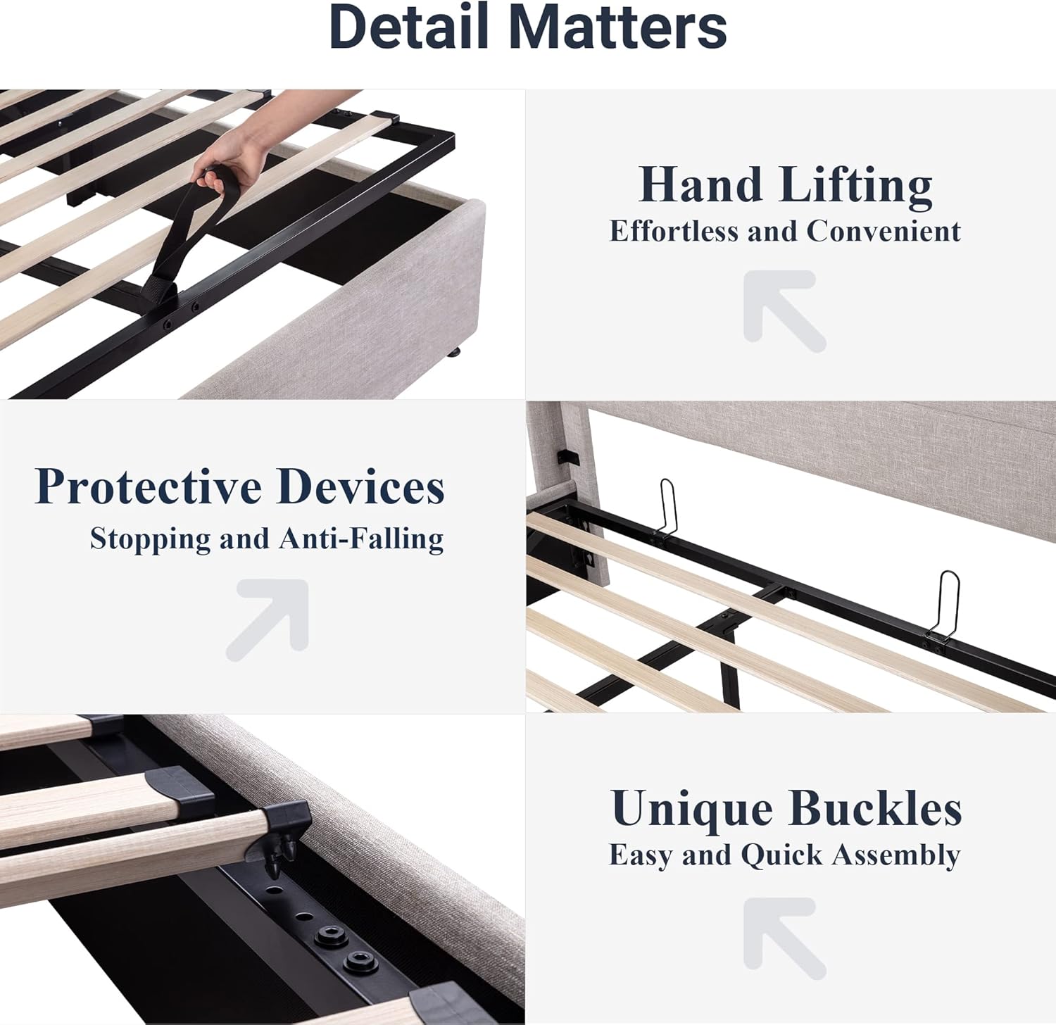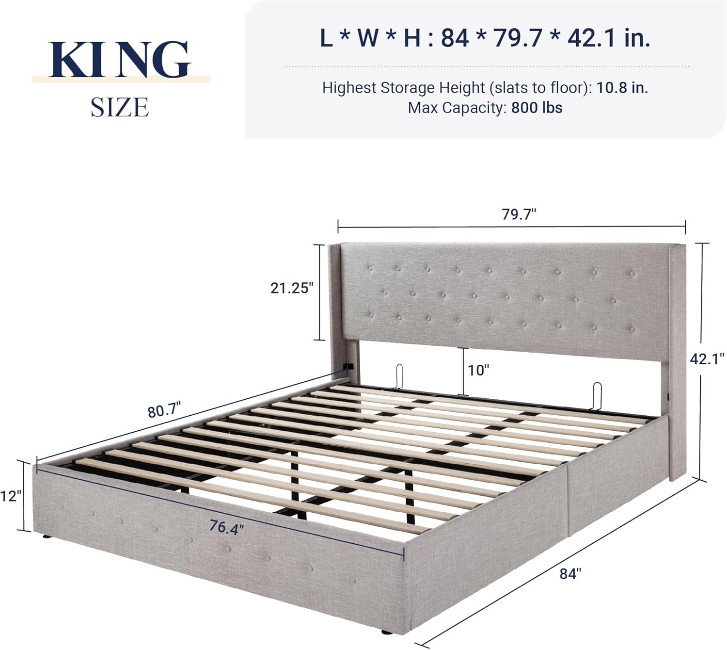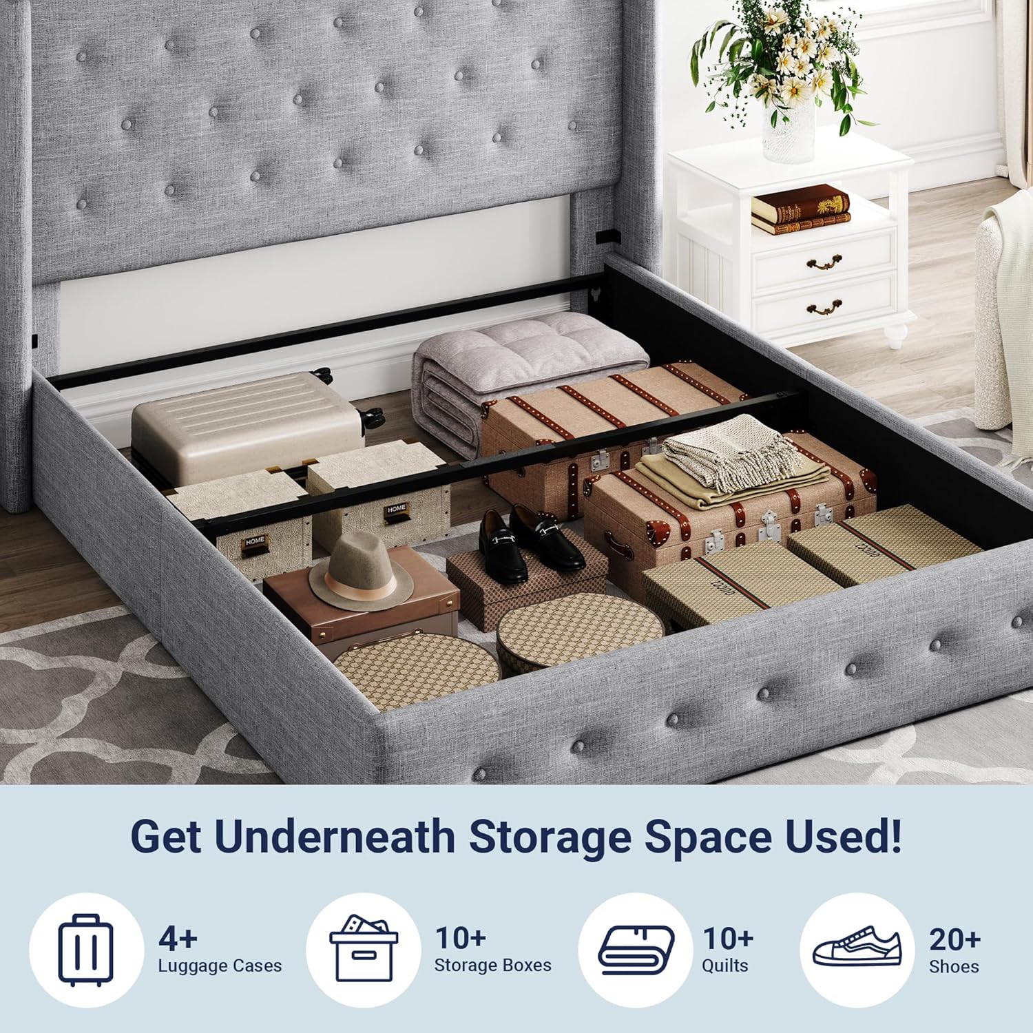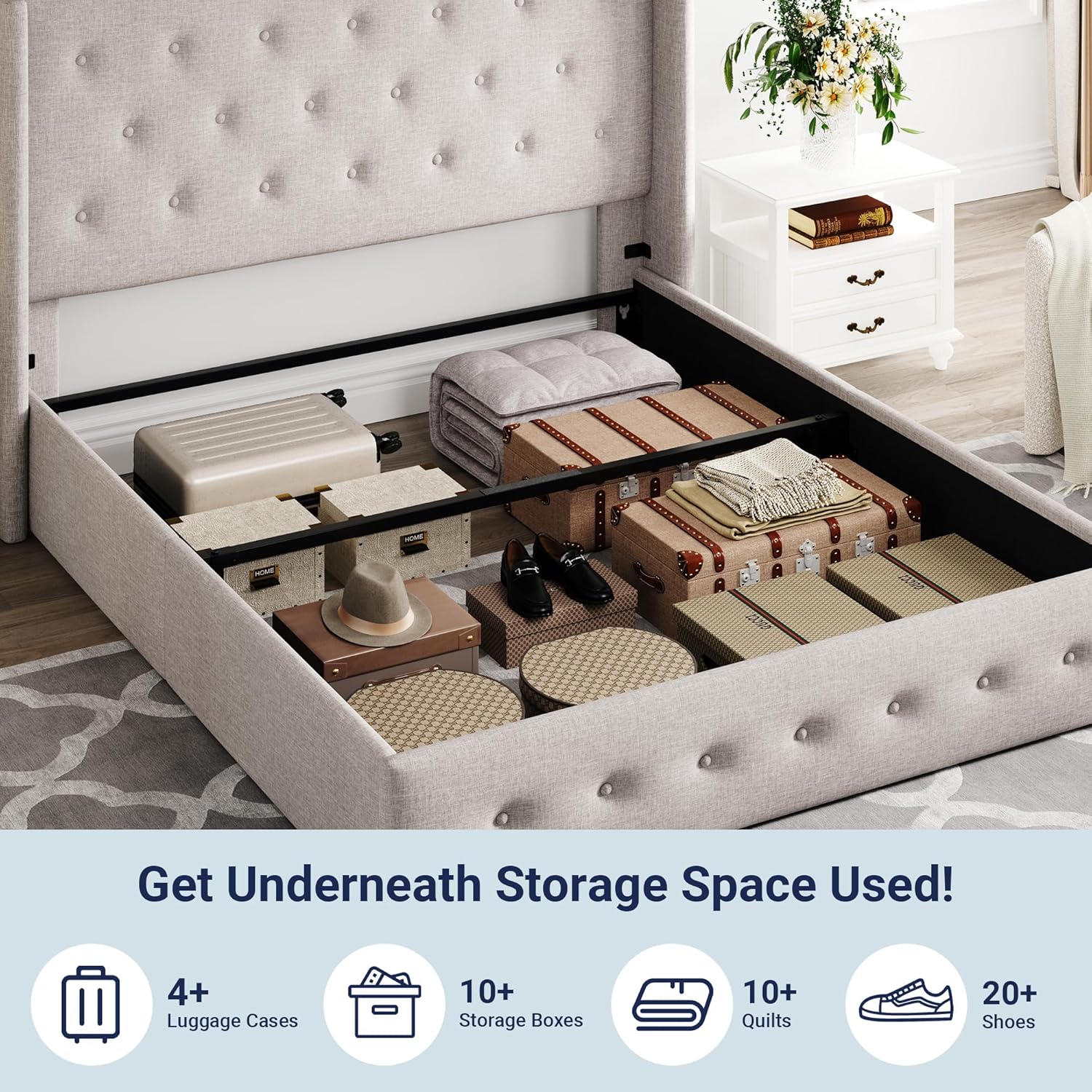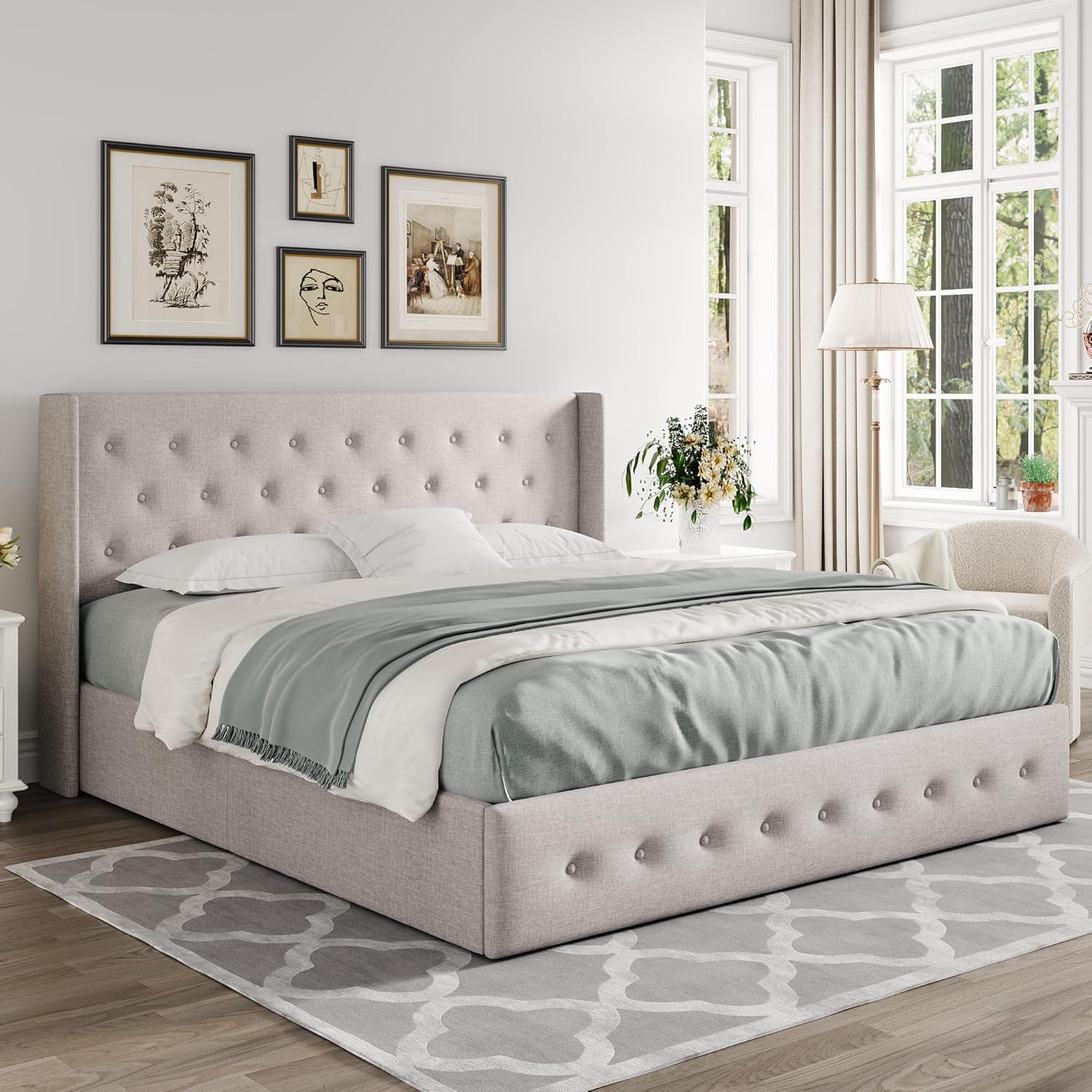 • Allewie Queen Size Lift Up Storage Bed, Modern Wingback Headboard, Hydraulic Support, No Box Spring Needed, Light Beige