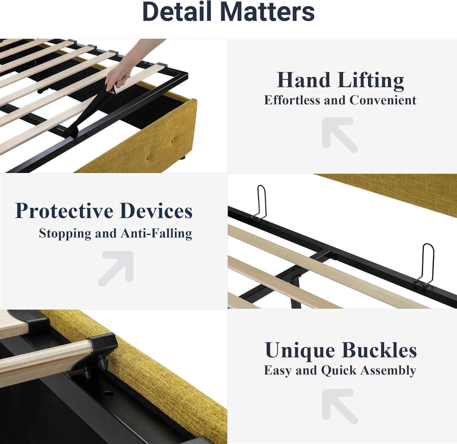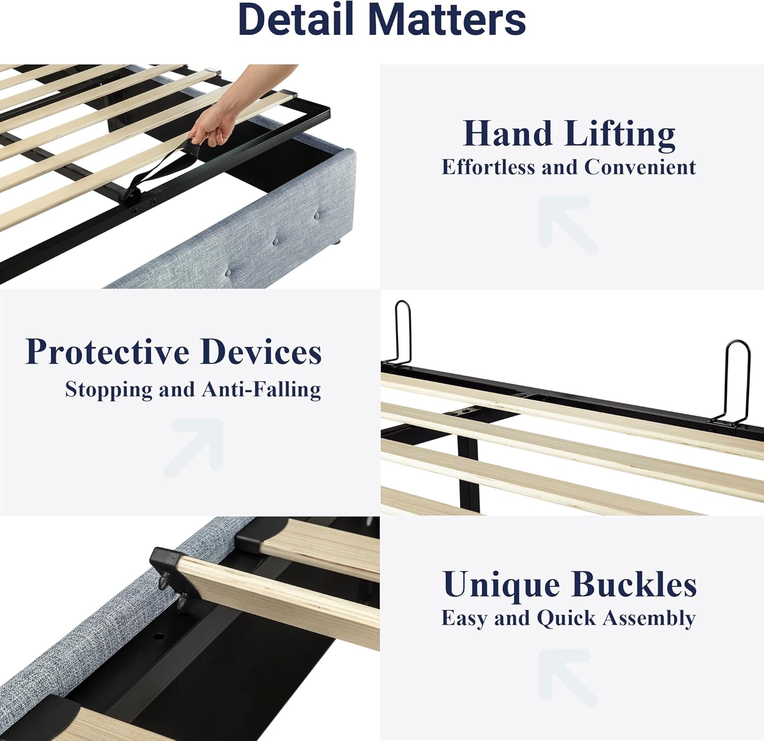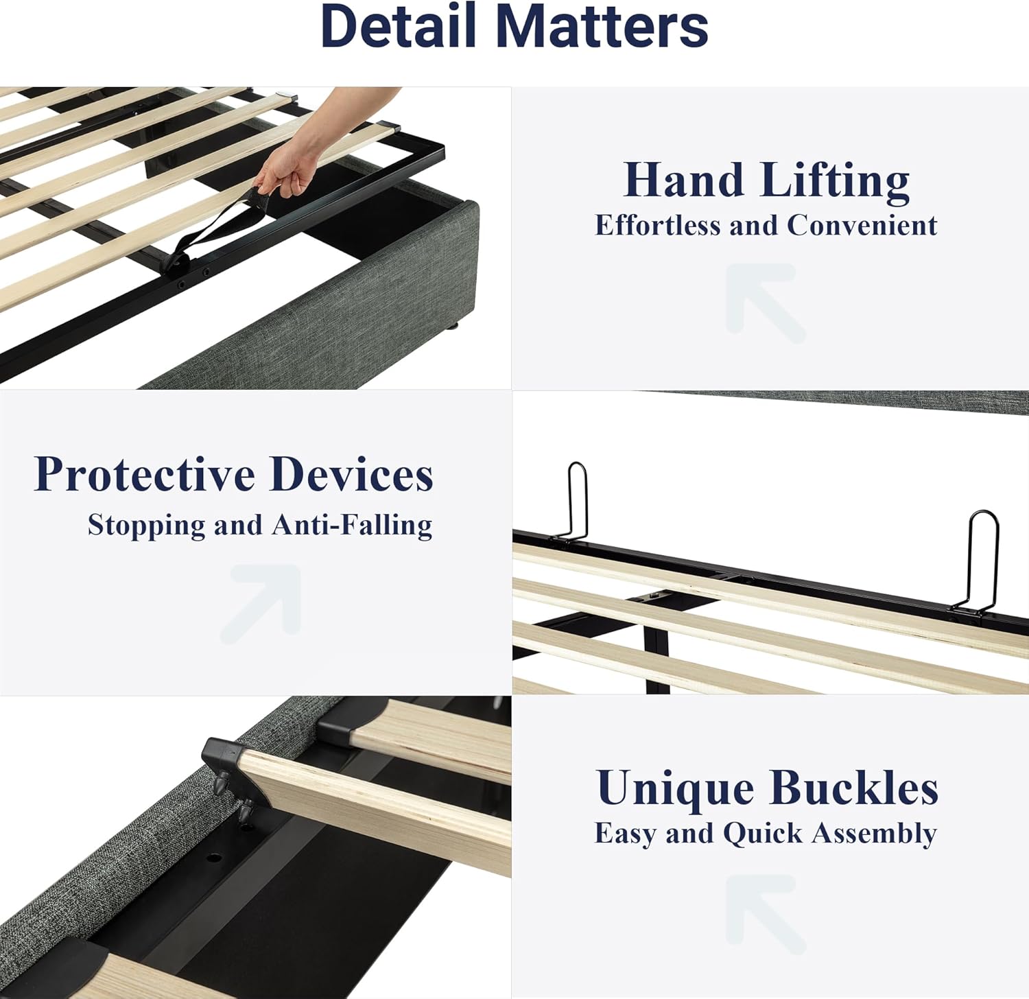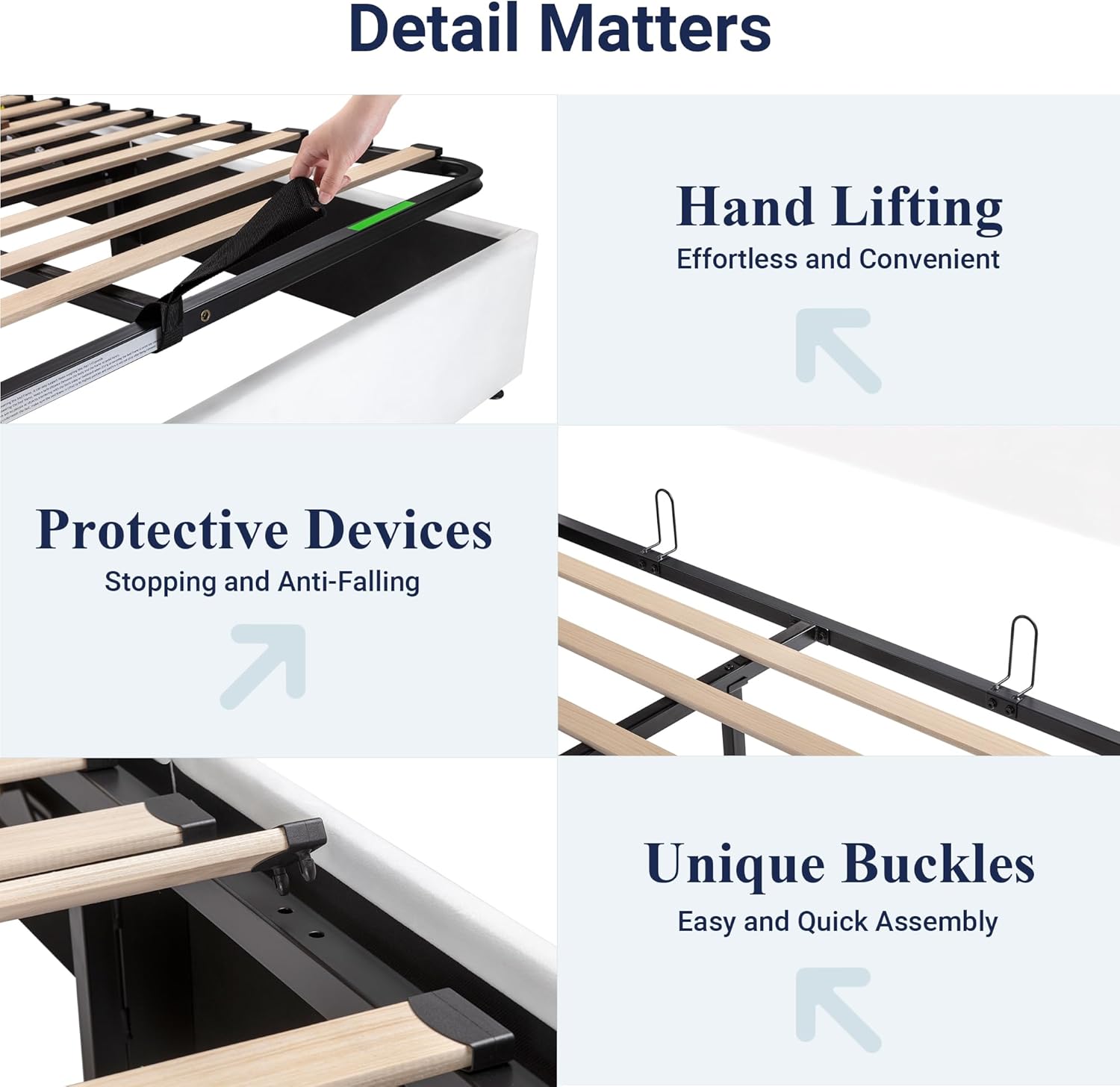 • Space-Saving Storage: With its lifting up storage feature. this bed frame provides ample space to store extra bedding. clothing. shoes. and other items. especially helpful for smaller bedrooms or apartments where storage space is limited