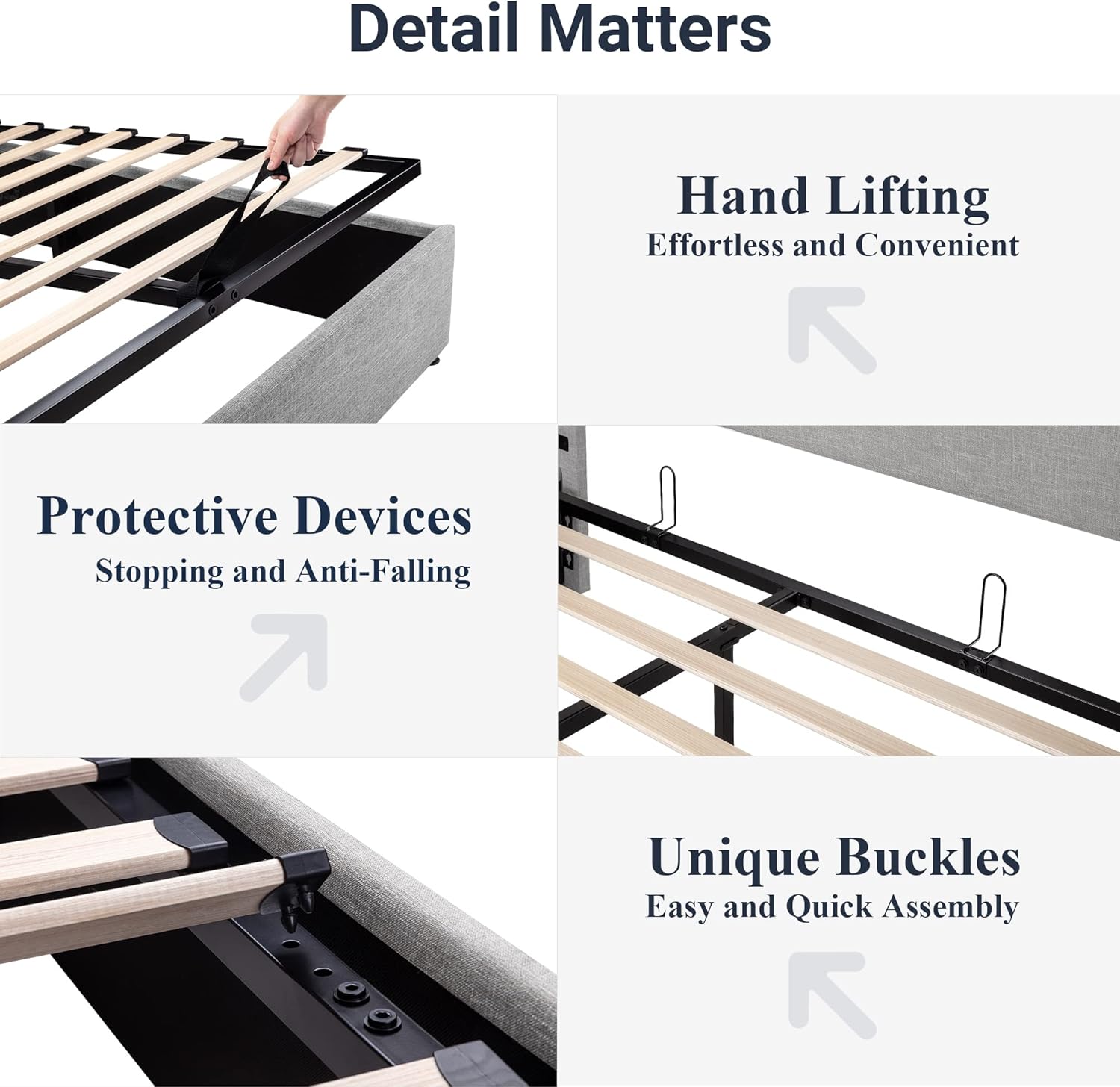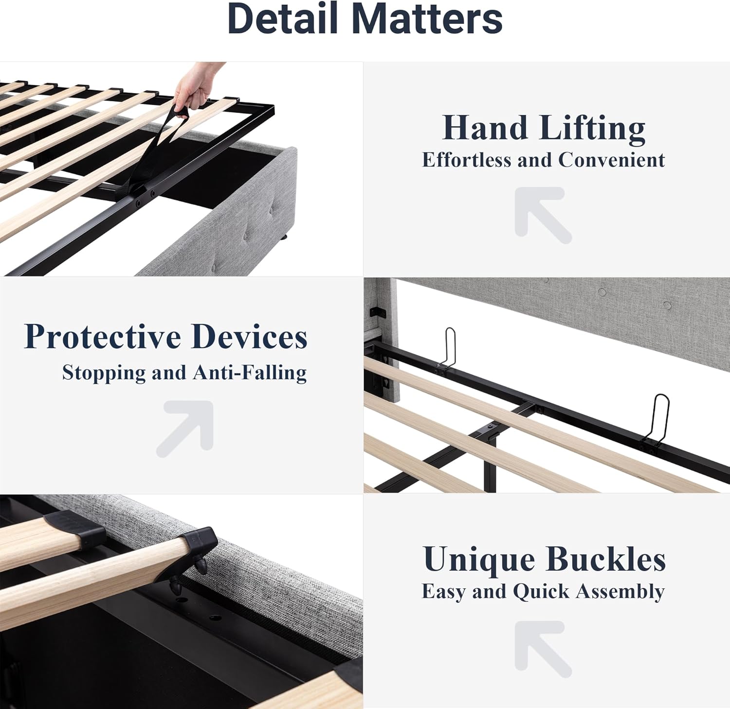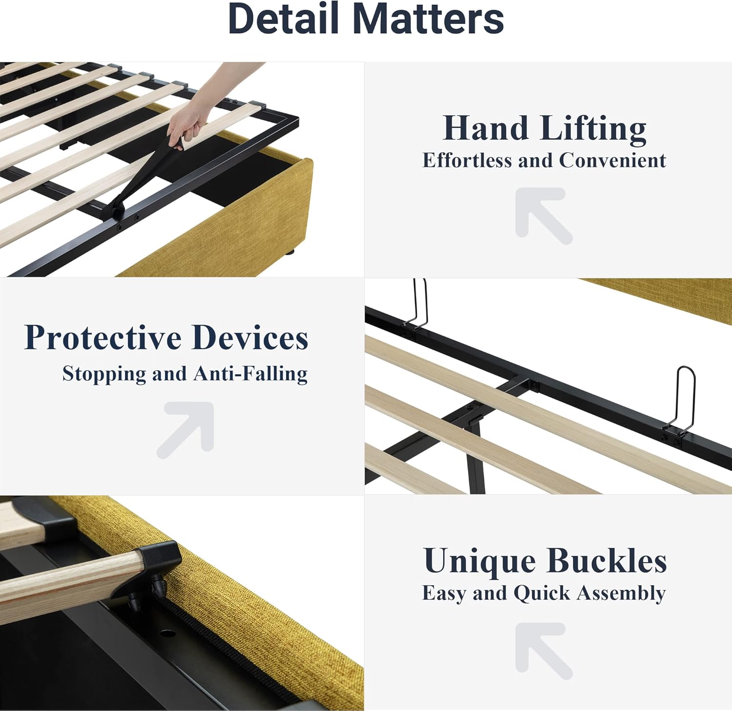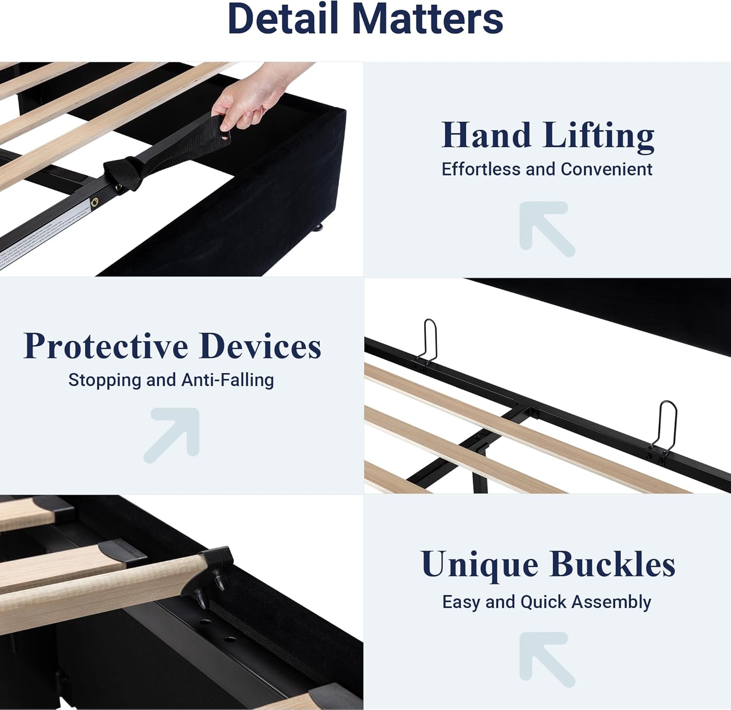 • Space-Saving Storage: With its lifting up storage feature. this bed frame provides ample space to store extra bedding. clothing. shoes. and other items. especially helpful for smaller bedrooms or apartments where storage space is limited