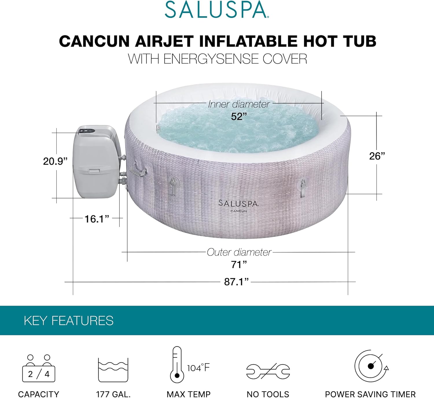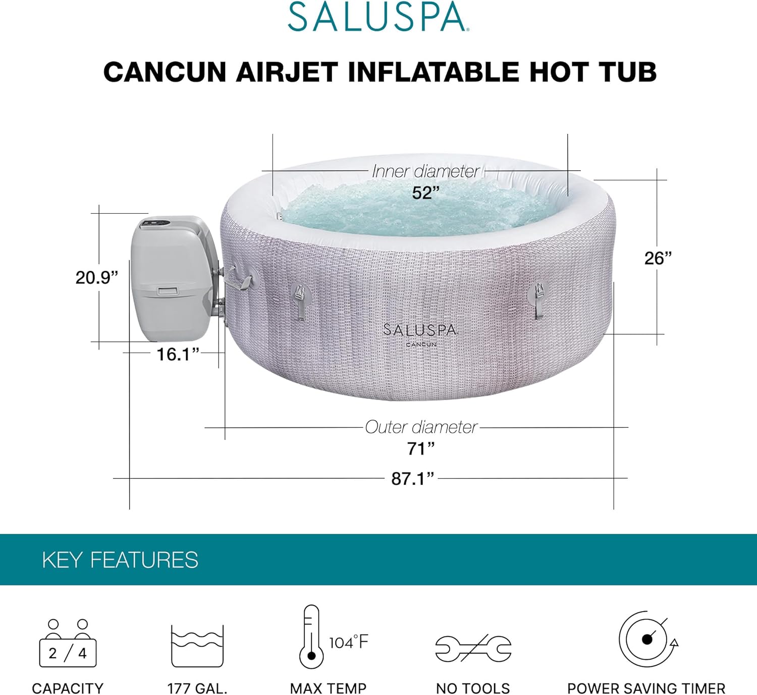 - Portable hot tub measures 71” x 71” x 26” (L x W x H); Water capacity at 80% capacity is 177 gal; This spa cannot be used in temperatures less than 39 degrees F