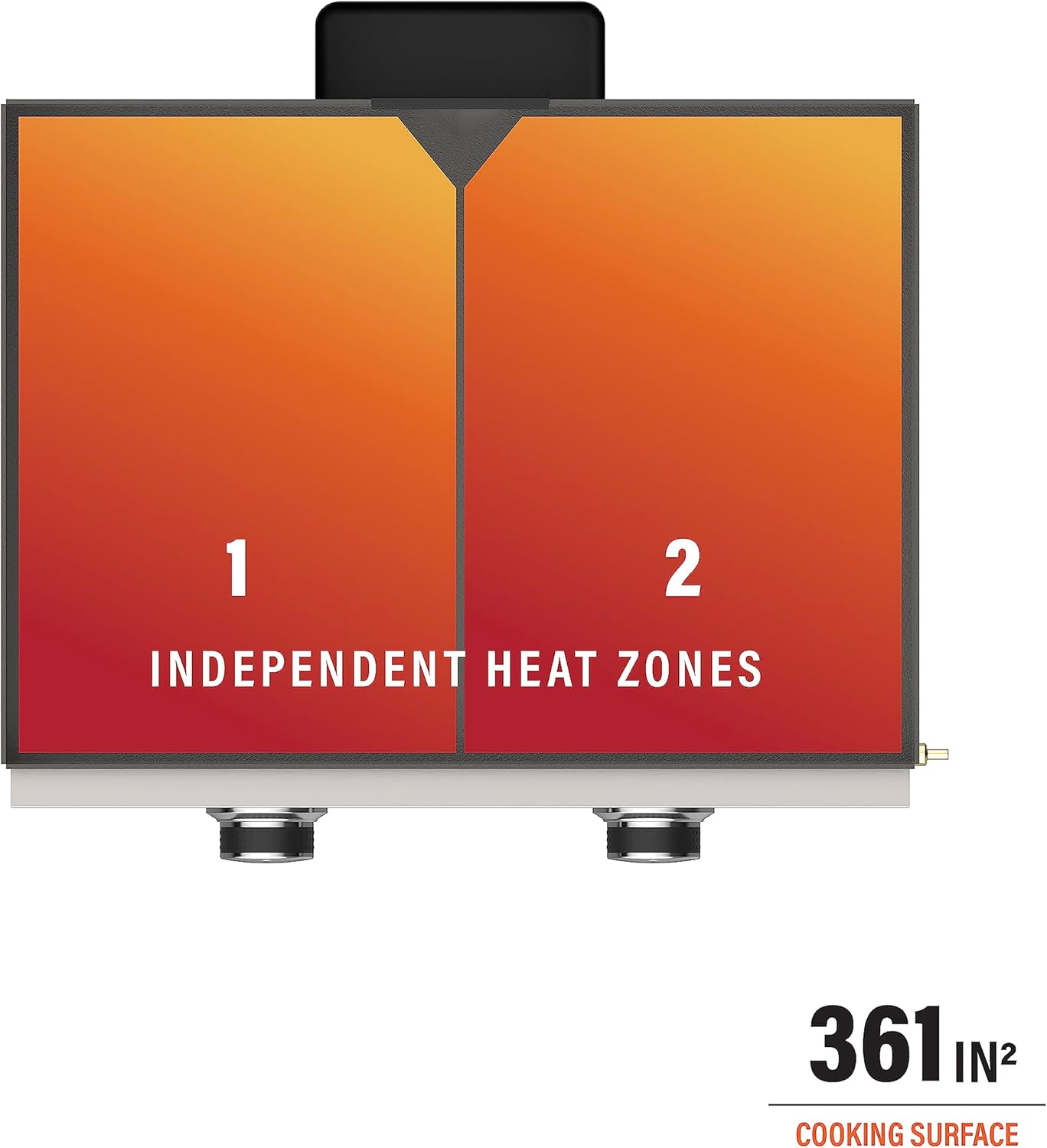- Total Heat Control: Two independently controlled H-shaped burners ensure optimal heat distribution and even cooking on the griddle surface while allowing you to cook multiple foods at different temperatures simultaneously.
