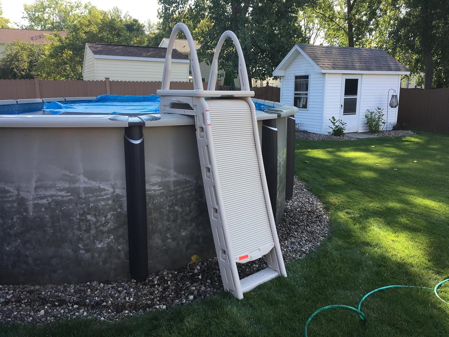 • Confer Plastics 7200 Roll Guard 48" to 56" Adjustable A Frame Safety Ladder for Above Ground Outdoor Patio Swimming Pool Platform Ladder with Step Barrier, Warm Grey…