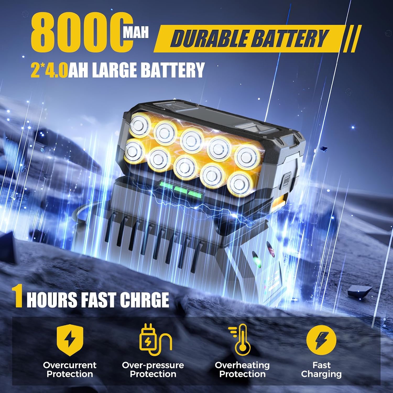 - 2PACK 4.0AH HIGH-CAPACITY BATTERIES: ultra-long battery life design. two batteries in rotation. to ensure that the 1/2" impact gun continuous operation without power. to meet the needs of long-term high-intensity work.
