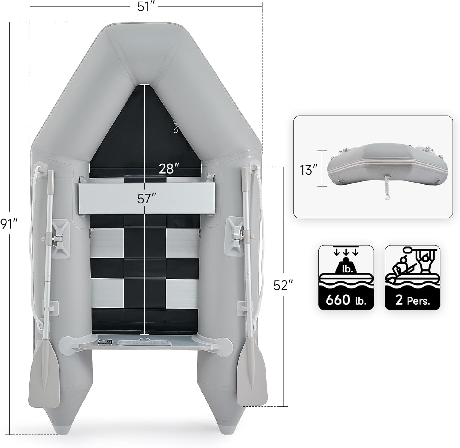 - 2-Person Fun: With a weight capacity of 660 lb. this 91"" x 52"" x 13"" inflatable dinghy comfortably fits two passengers. The corrosion-resistant aluminum alloy floorboard and seat provide added stability and comfort for a smooth ride