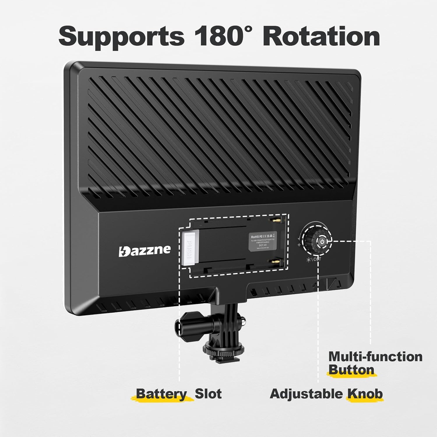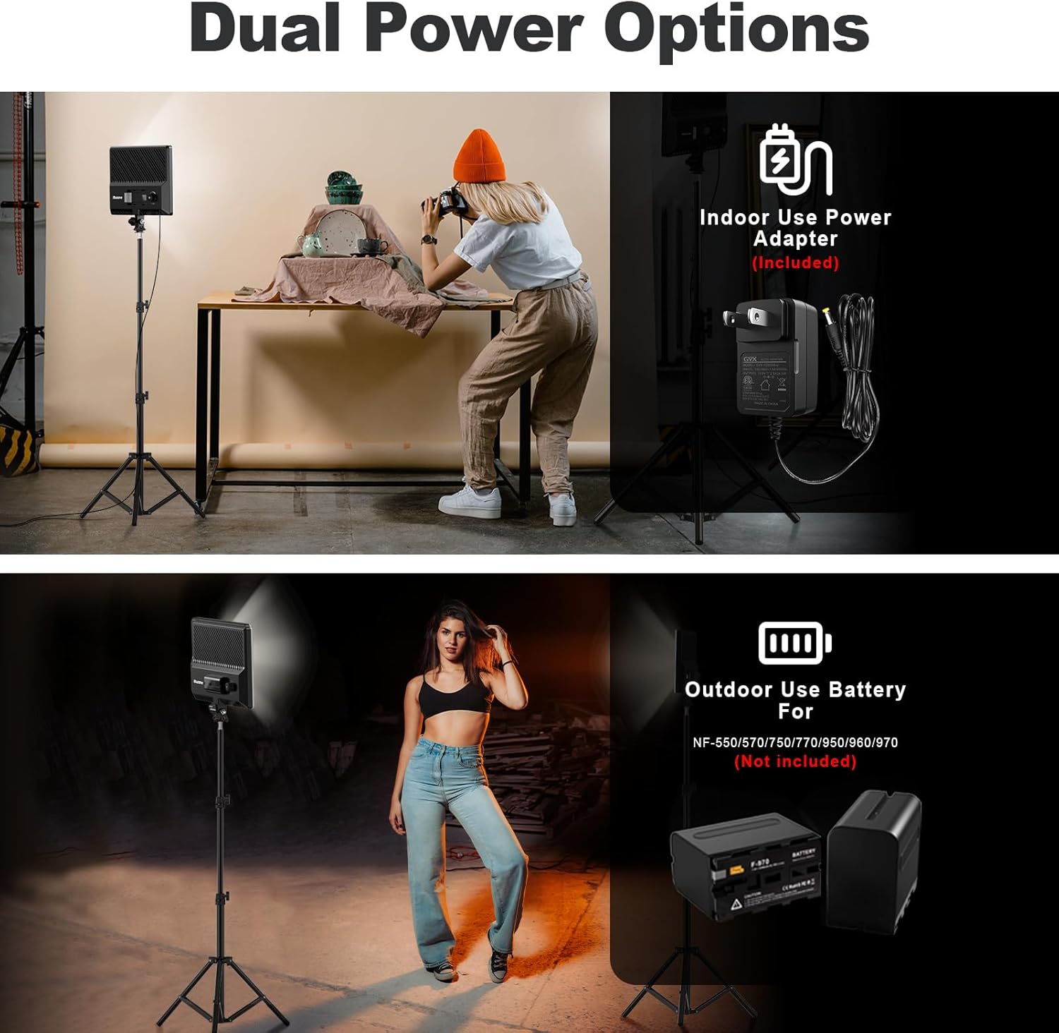 • Dual Power Supply: Plug-in powered mode is for indoor photographies; battery-powered mode for outdoor photographies. Compatible battery: 2pcs of NP-F series battery NOT INCLUDED (NP-F950 and above is recommended)