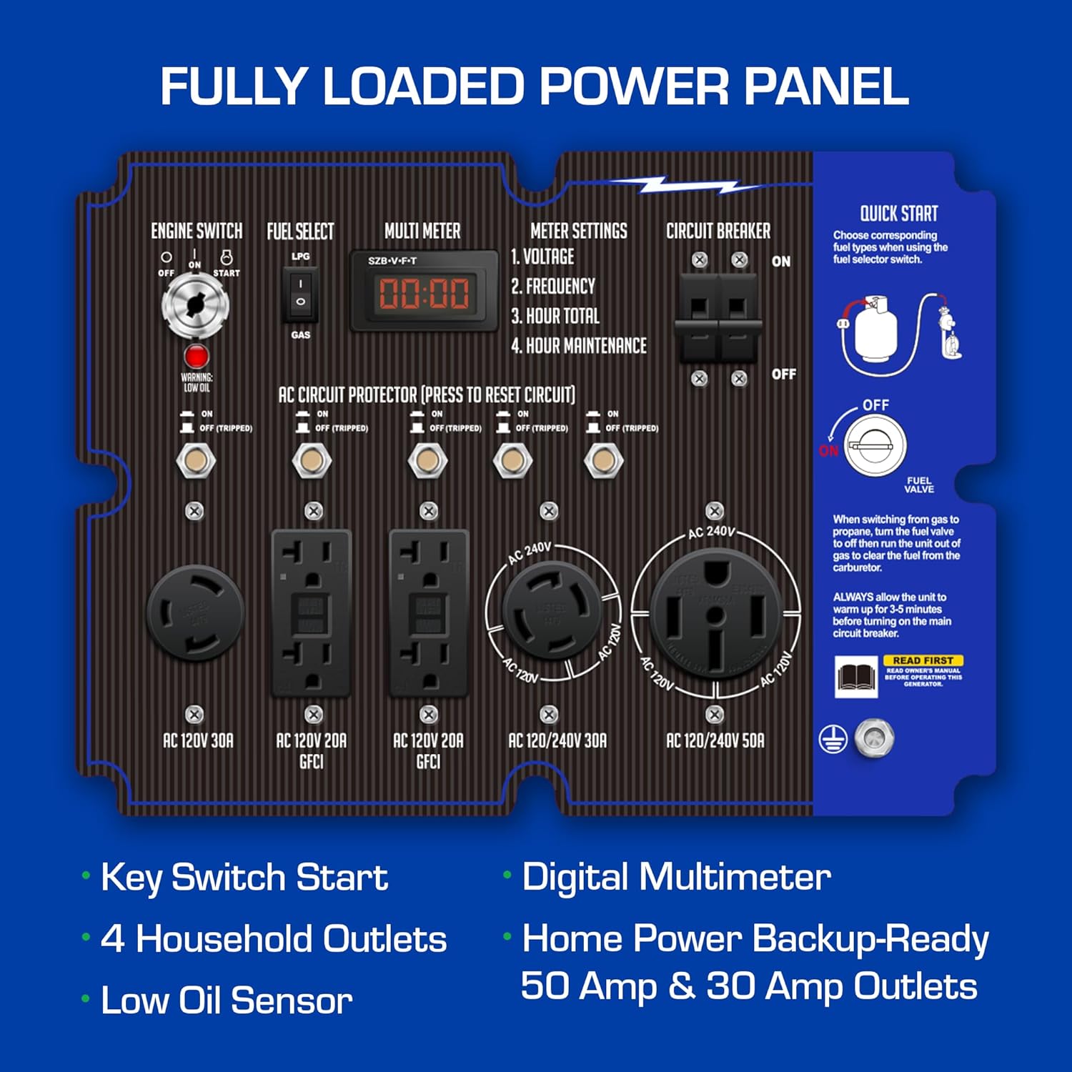 • The XP13000EH comes with a push button start. a front facing interface that allows you to change your fuel type in seconds. and a wide variety of outlets (including a transfer switch-ready 50 amp outlet)