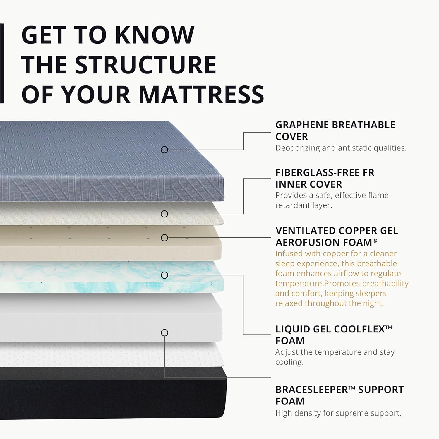- Cooling Fabric Combine with Graphene Technology: In short. this Cool-sensation Cover is designed to regulate your body temperature and keep you comfortable during sleep. Without the negative aspects of fiberglass and other fire-retardant chemicals. the inner cover of the mattress provides a safe. effective flame-retardant layer around our mattresses.