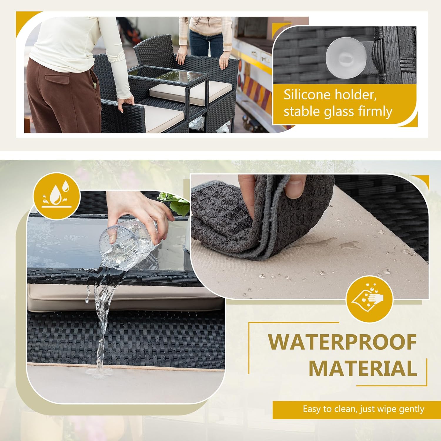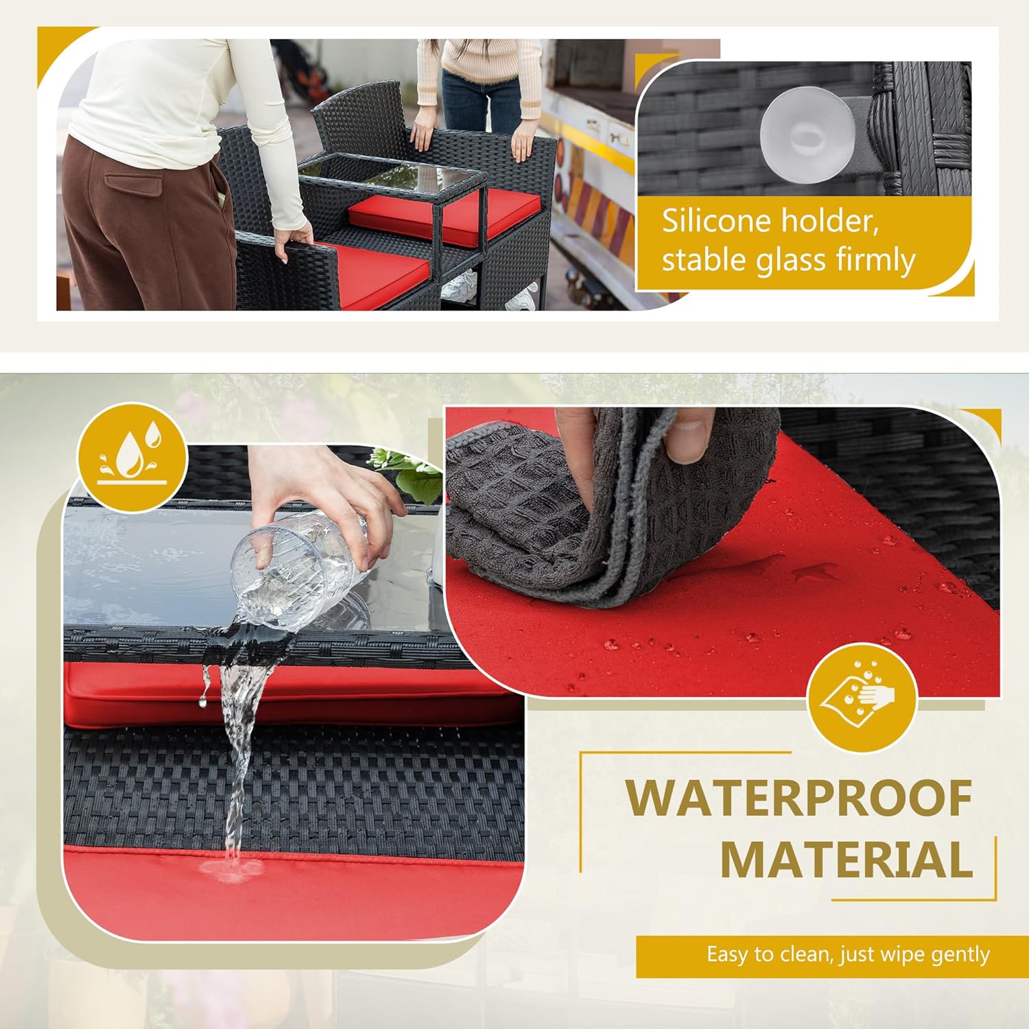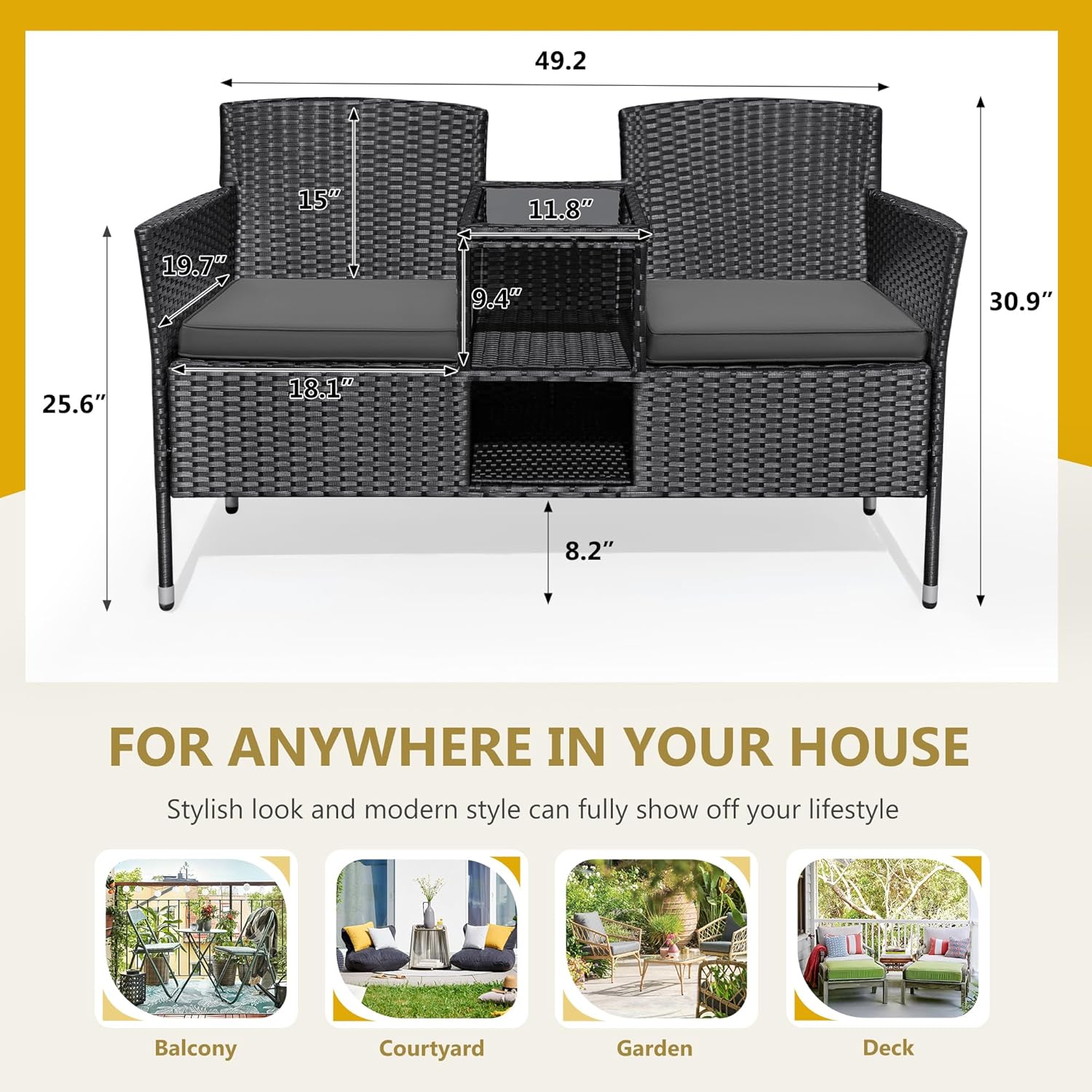 - Built-in Table & Storage: In the middle of the patio loveseat integrated storage compartment and small table. you can put some drinks. snacks. fruits within your reach in the tempered glass top. The small storage space below you can put books. tea cans and etc. This design saves your space and add more convenience.