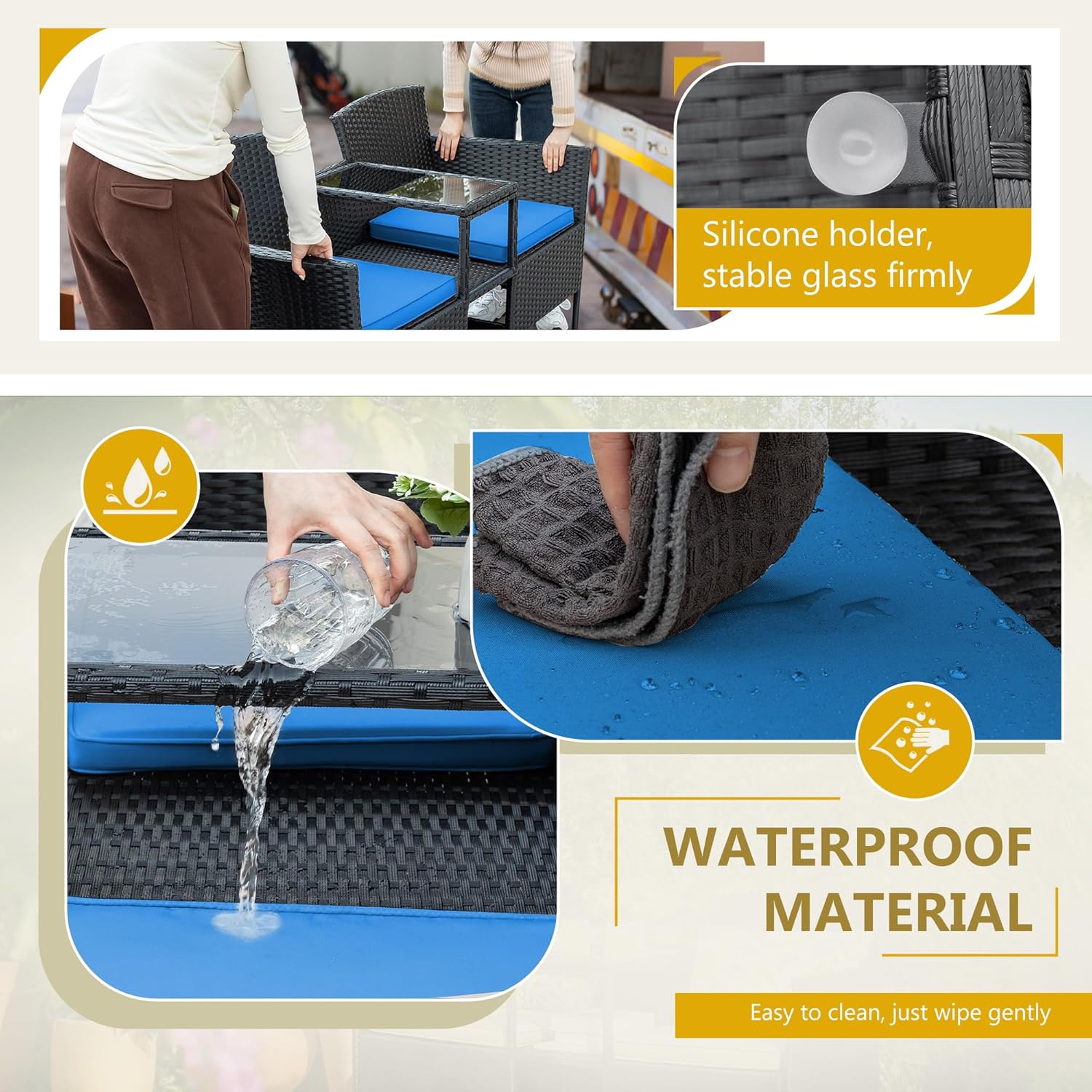 - Padded Soft Cushions: Outdoor loveseat cushion filled with high-density foam and covered with polyester fabric. the soft cushions bring more comfortable when you sit. Cushion cover features water-splash resistant. And the zipper design allows you to easy clean and replace.