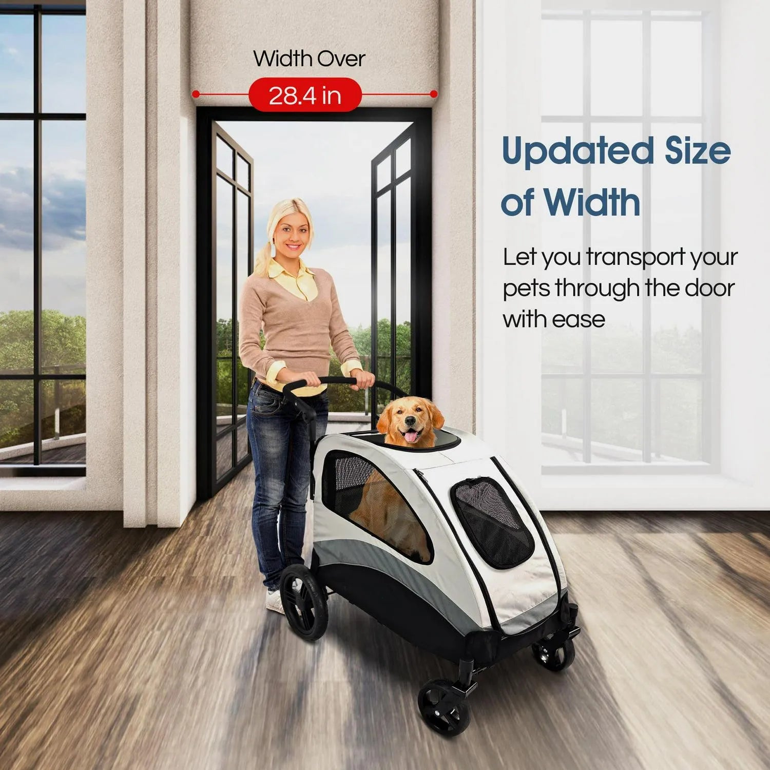 It s one of the few pet strollers for dogs suitable for animals weighing up to 120 pounds. The dual-entry openings make it convenient to load pets of various ages and ability levels through either the front or rear openings. This feature is beneficial when transporting injured or aging pets who may have difficulty turning around in a tight space as they can enter from one side and exit from the other. The spacious interior and high weight-bearing ability make this pet stroller suitable for pushing one large dog or multiple smaller pets together in one stroller. Pets enjoy excellent visibility via panoramic windows and sunroof-style opening that allows them to stick their head out.