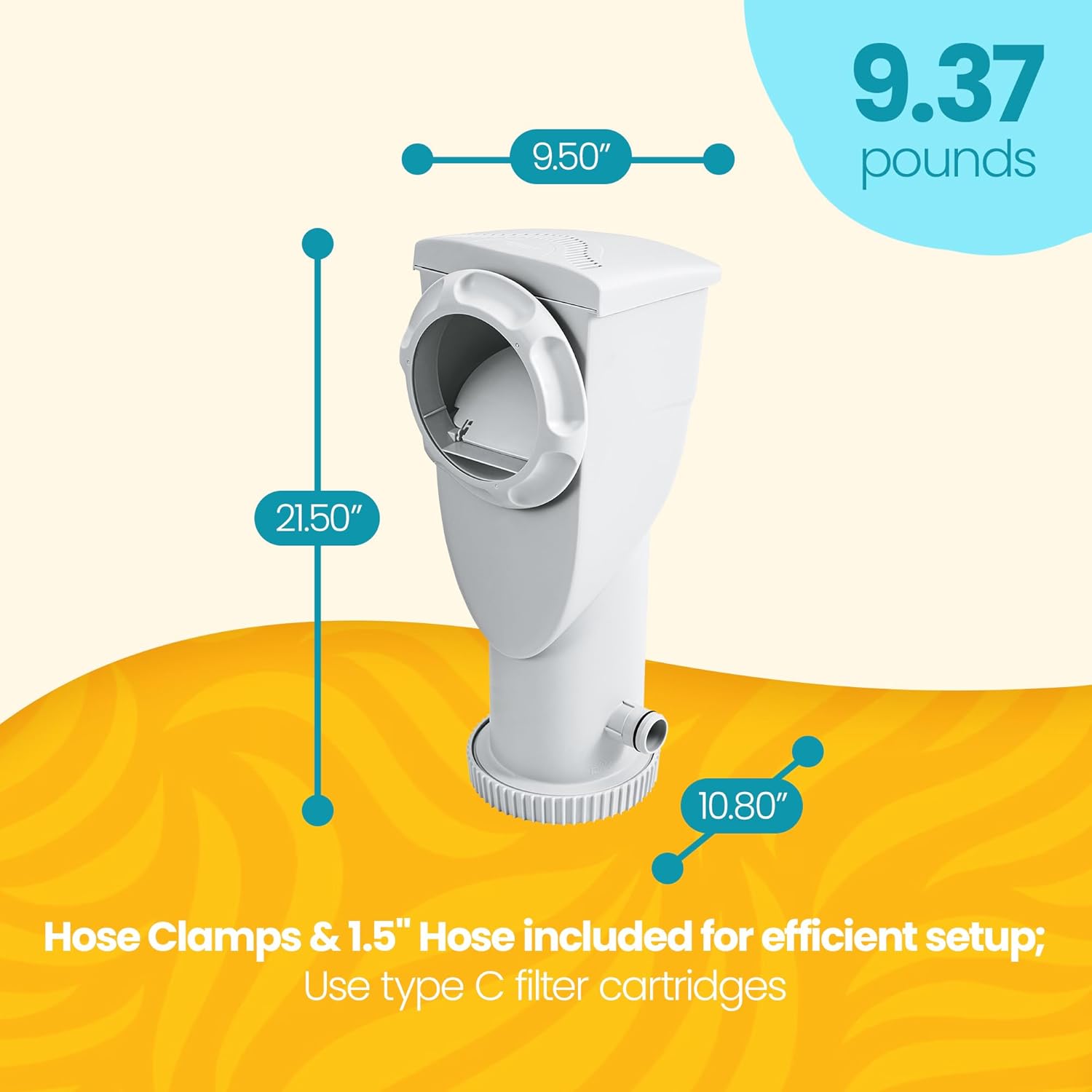 - Features a water flow rate of 1.500 gallons per hour; Includes hose clamps and (1) 1.5-inch hose for efficient setup; Use type C filter cartridges