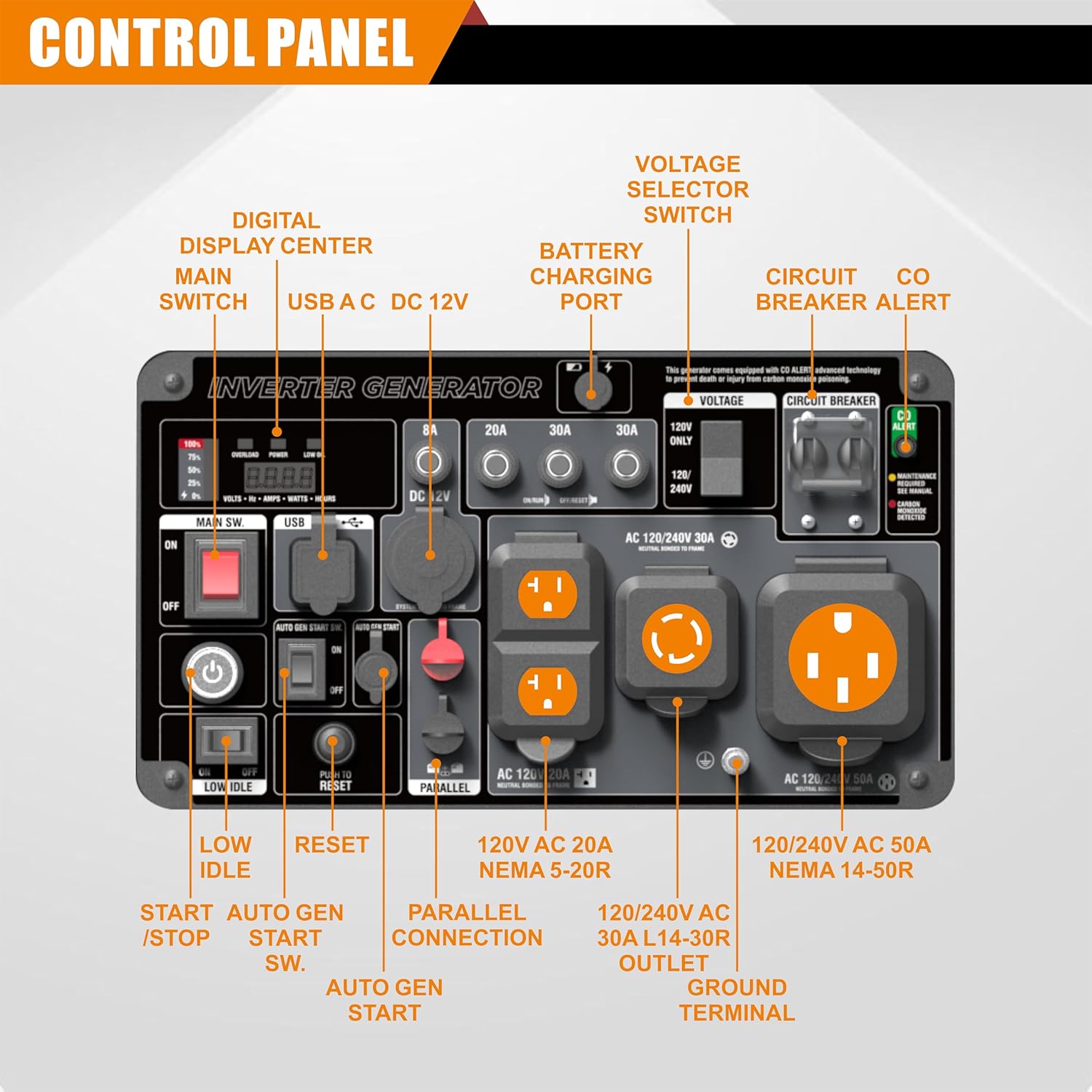 - 【Intelligent Control Panel. 2 wire Start】: The generator's control panel combines multiple functions with cutting-edge technology and user-friendly design. Direct current outputs paired with USB ports meet the charging needs of various digital devices. Multi-functional digital displays provide real-time operational parameters for easy monitoring. Features such as battery charging port. 2 wire automatic start/stop to charge solar batteries. and parallel operation capabilities offer intelligent solutions for complex power scenarios. The CO alarm function ensures safety. while voltage switching accommodates different electrical standards for seamless operation.