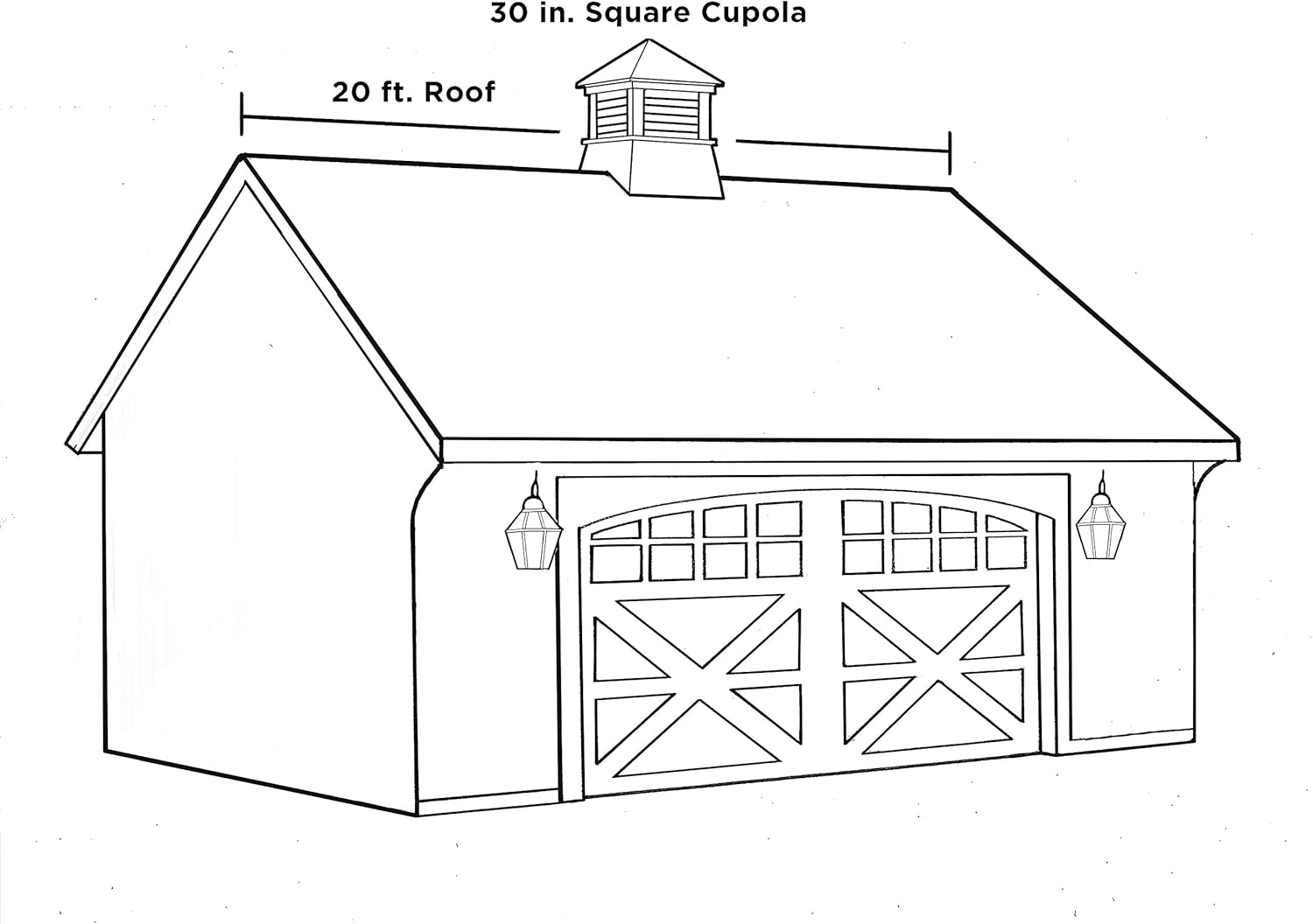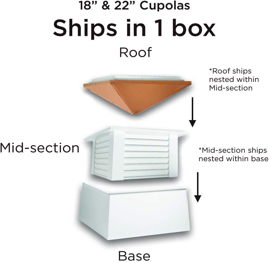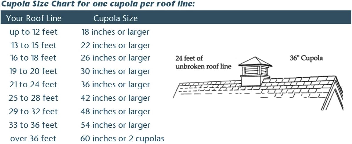 - DIMENSIONS �� Assembled: 26"Sq x 35"H. Square size measured at roofline. Fits up to a 10/12 pitch roof (most roofs). When calculating the size of your cupola. use our steadfast builder's rule of thumb: 1.5 inches of cupola width for every foot of unbroken roofline. See photo for more information.