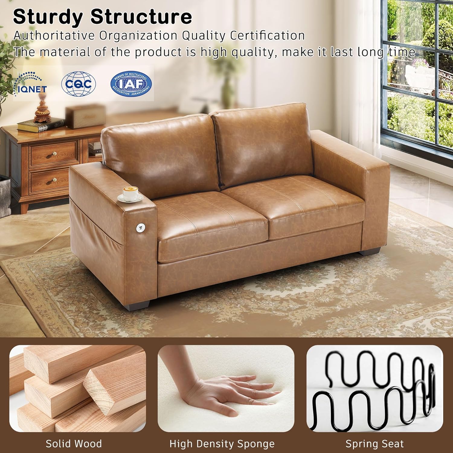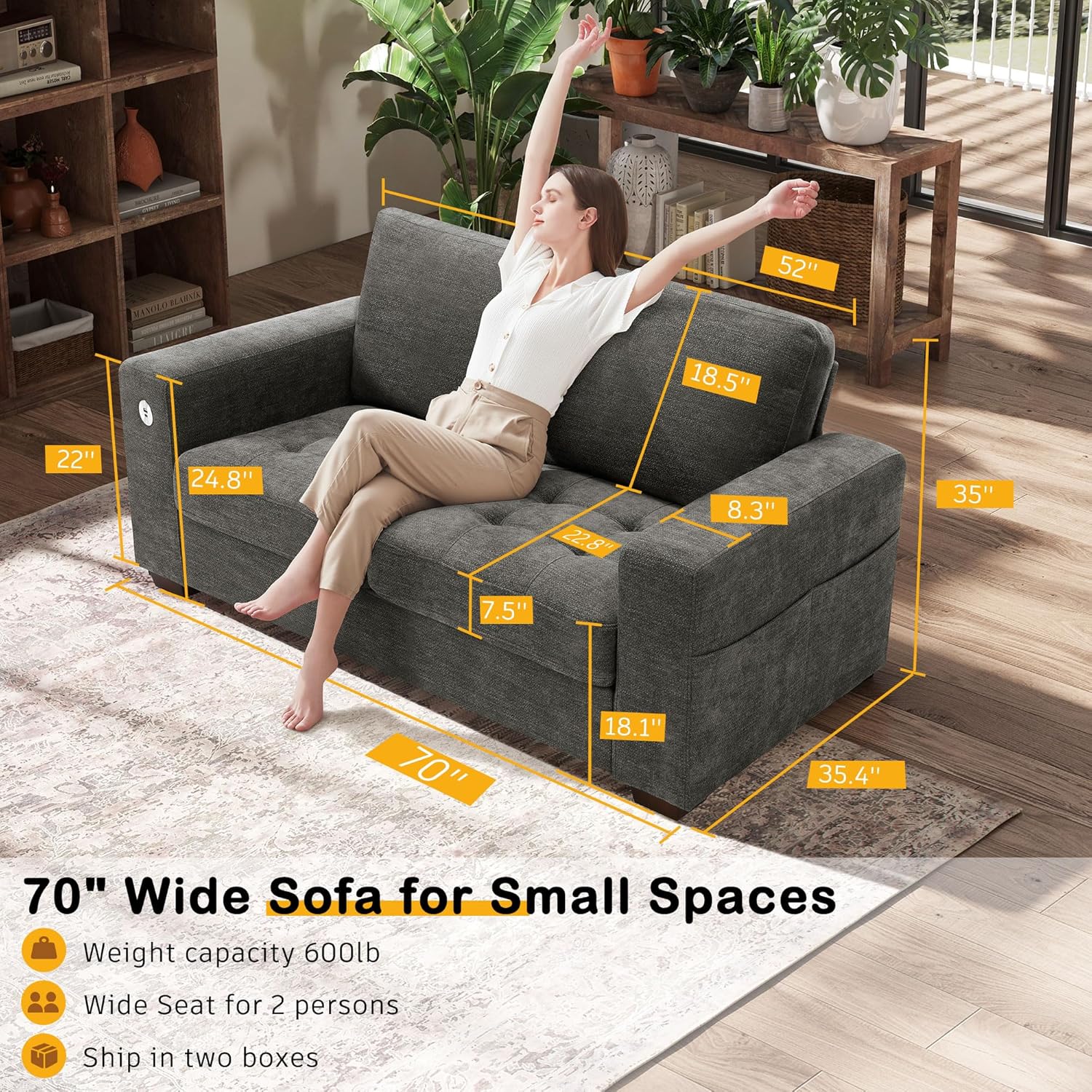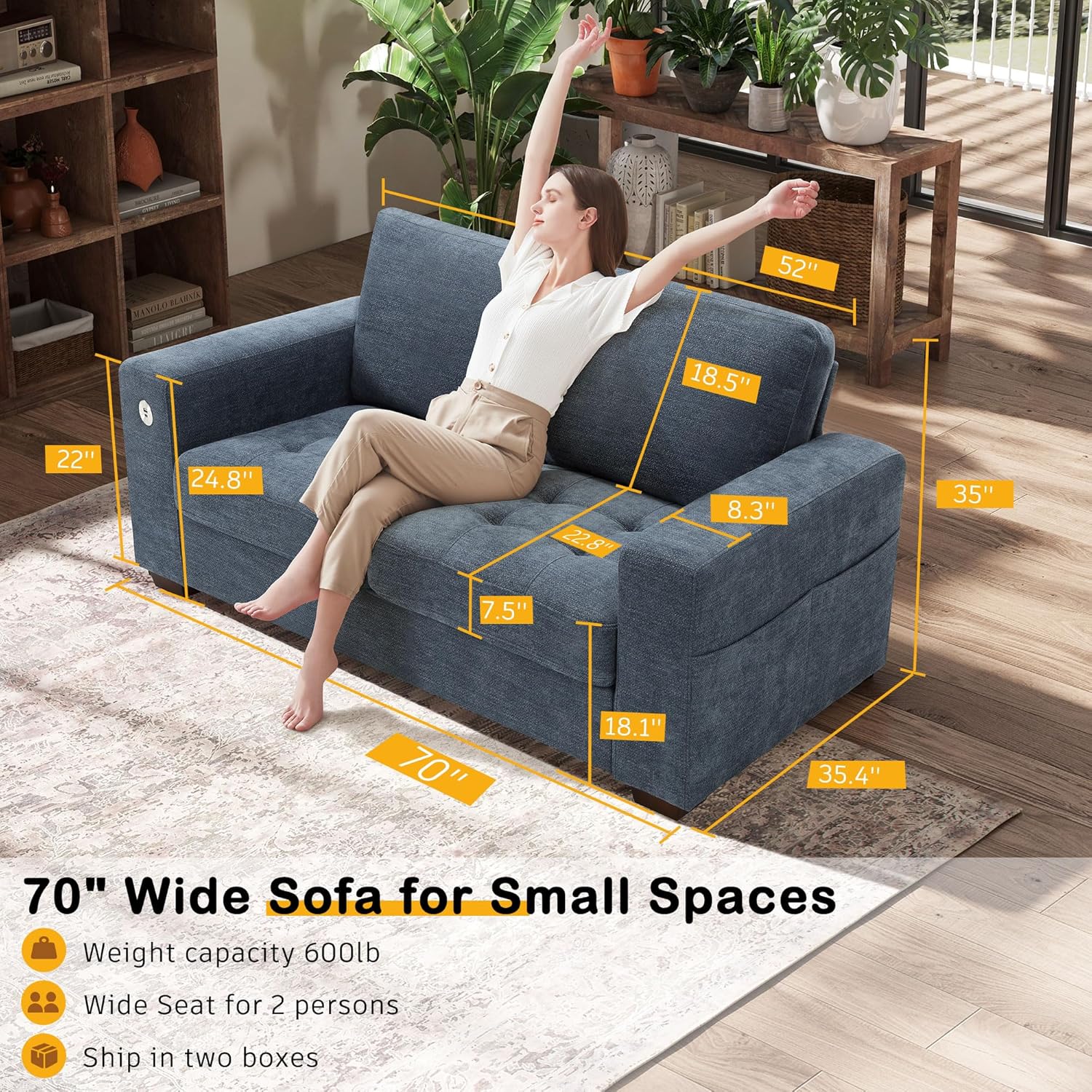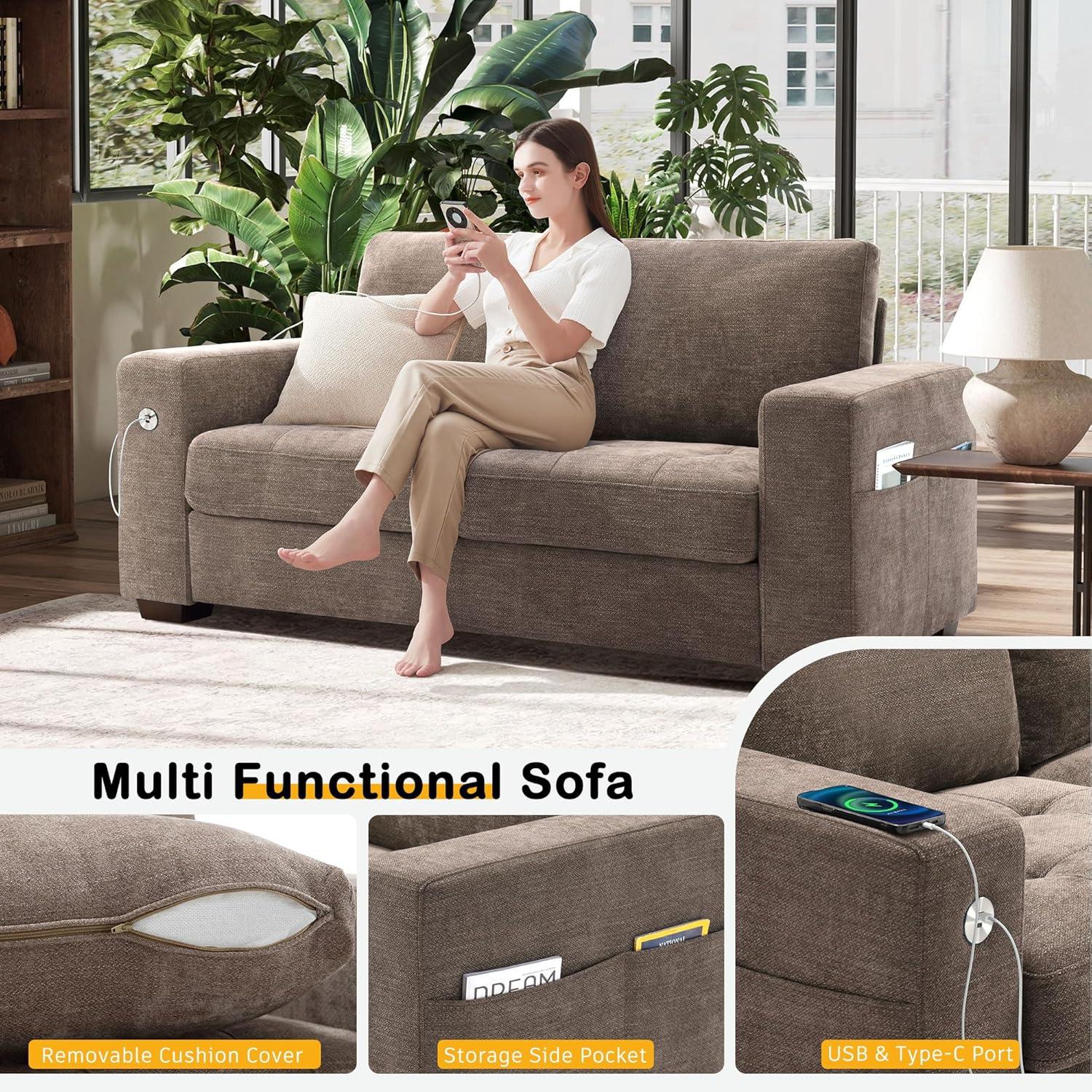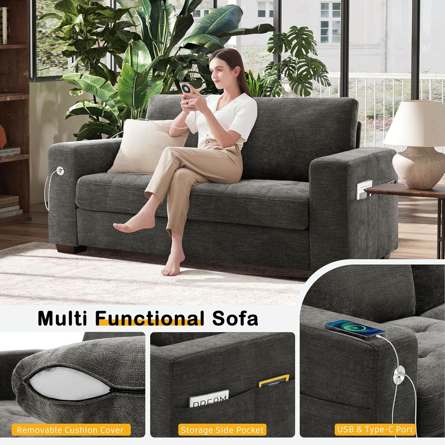 • ��Multi-Functional Couch & Quality Certified ��This couch comes with USB and Type-C ports. so you can easily charge your phone or iPad while you relax. Plus. there are four side pockets to keep your magazines or books close at hand. Our small space sofa is certified for quality by trusted institutions. and the 7.9-inch solid wood armrests along with thick wooden legs provide strong support. holding up to 900 lbs!
