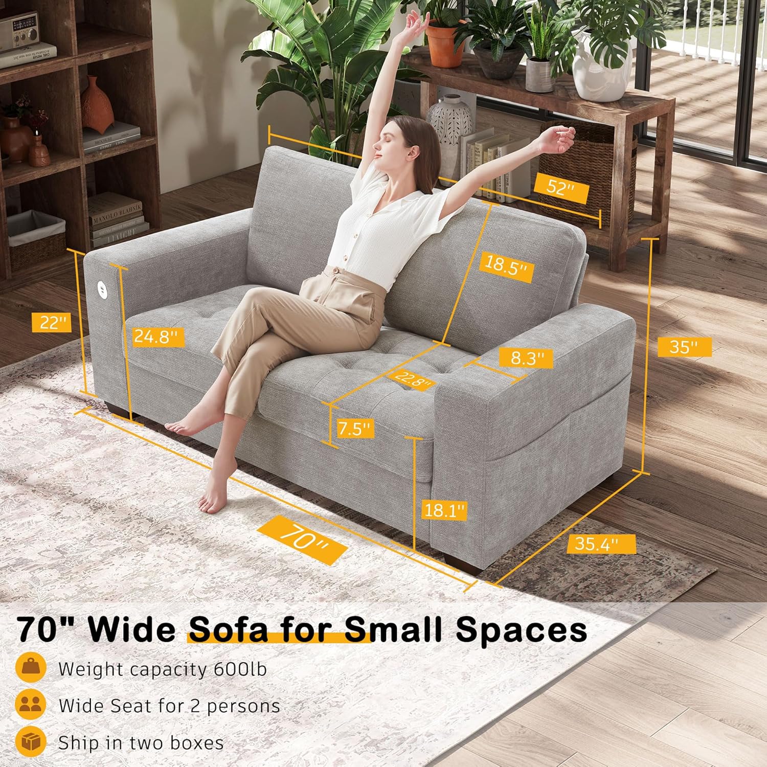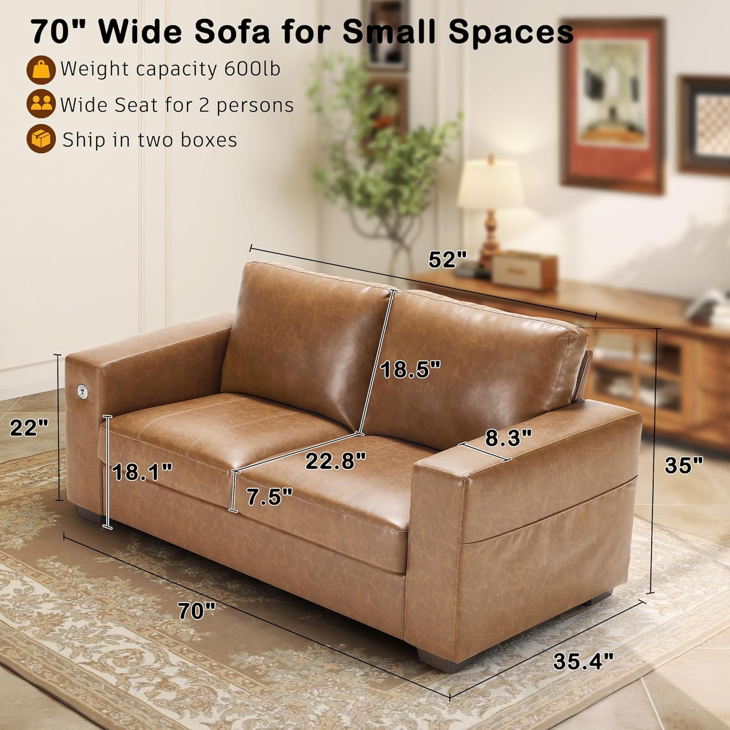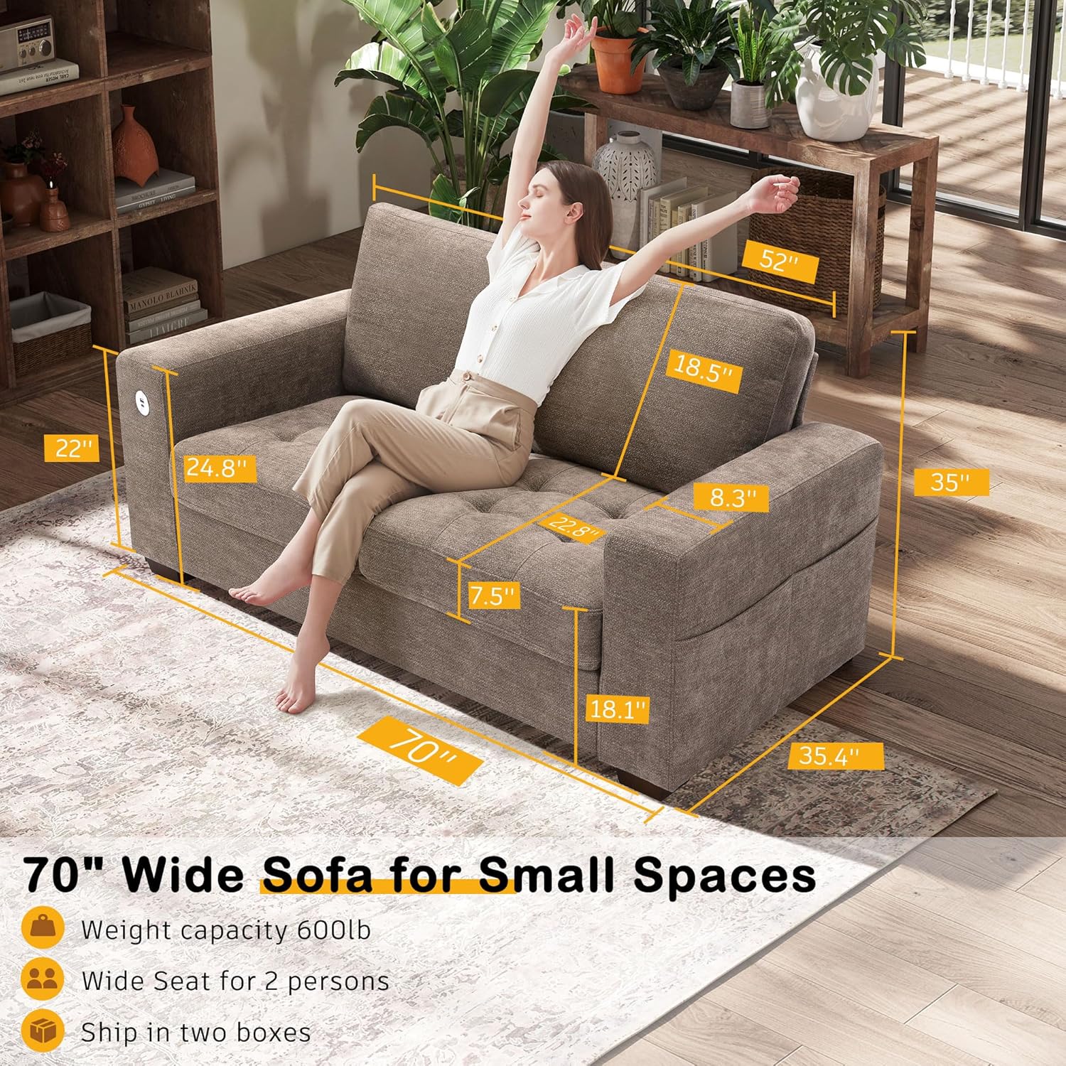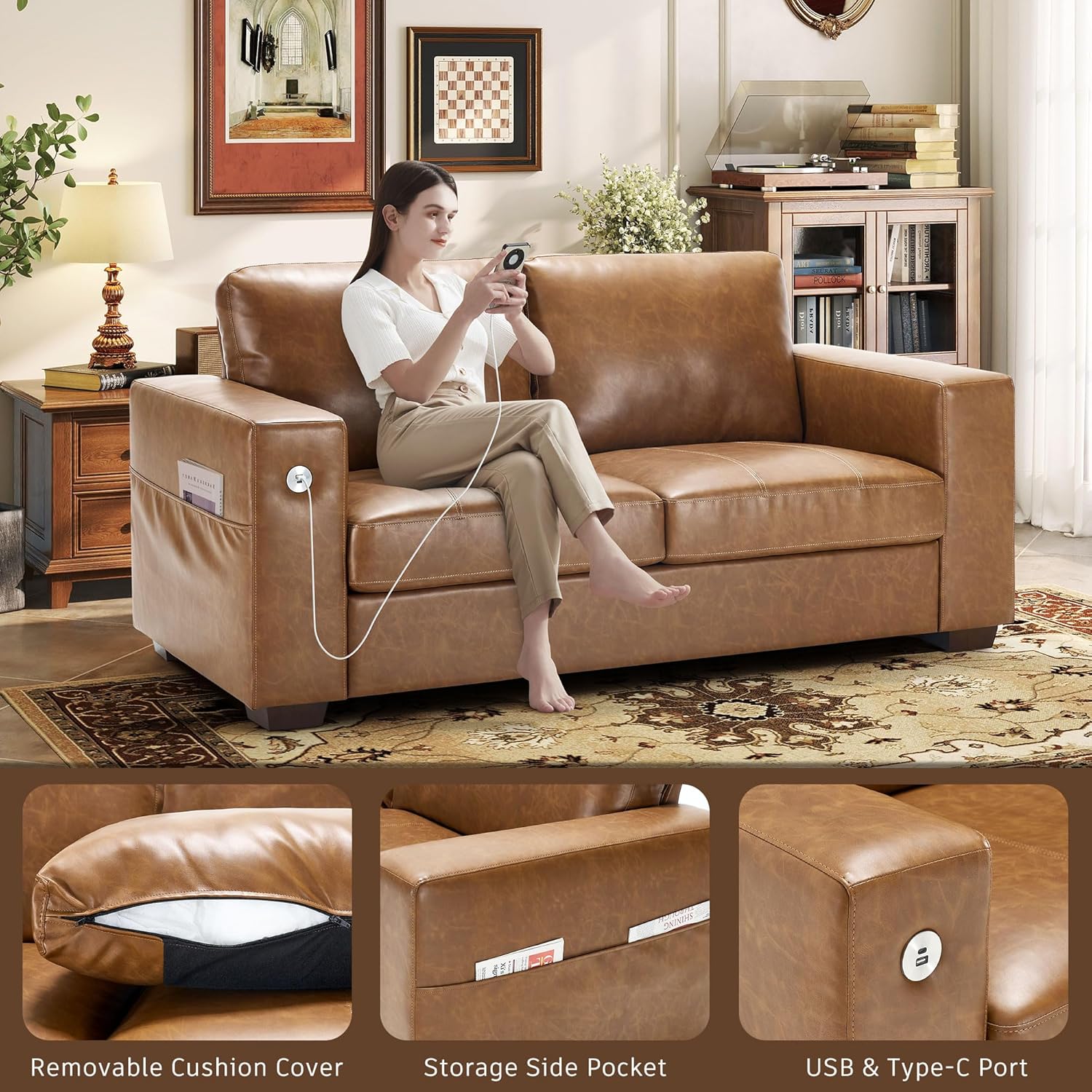 • ��Multi-Functional Couch & Quality Certified ��This couch comes with USB and Type-C ports. so you can easily charge your phone or iPad while you relax. Plus. there are four side pockets to keep your magazines or books close at hand. Our small space sofa is certified for quality by trusted institutions. and the 7.9-inch solid wood armrests along with thick wooden legs provide strong support. holding up to 900 lbs!