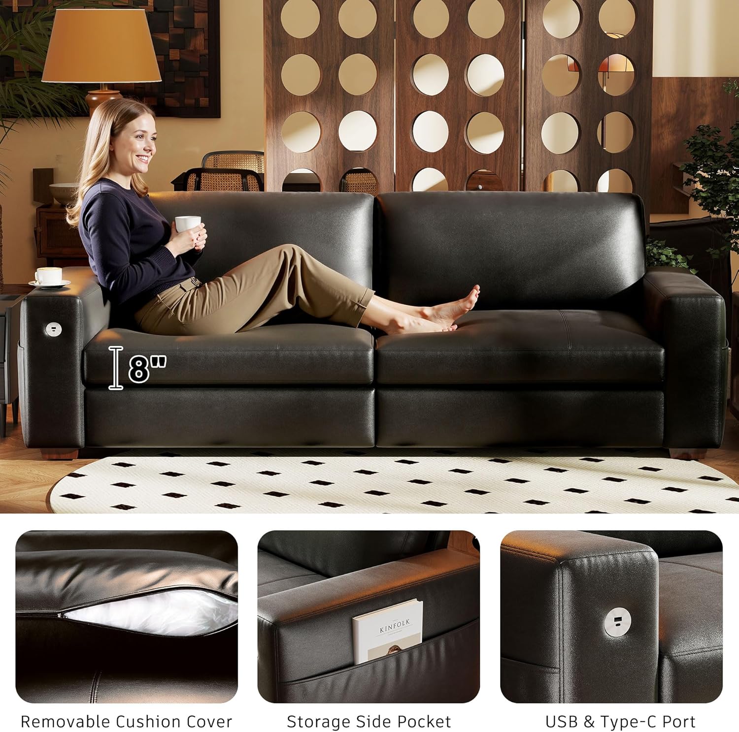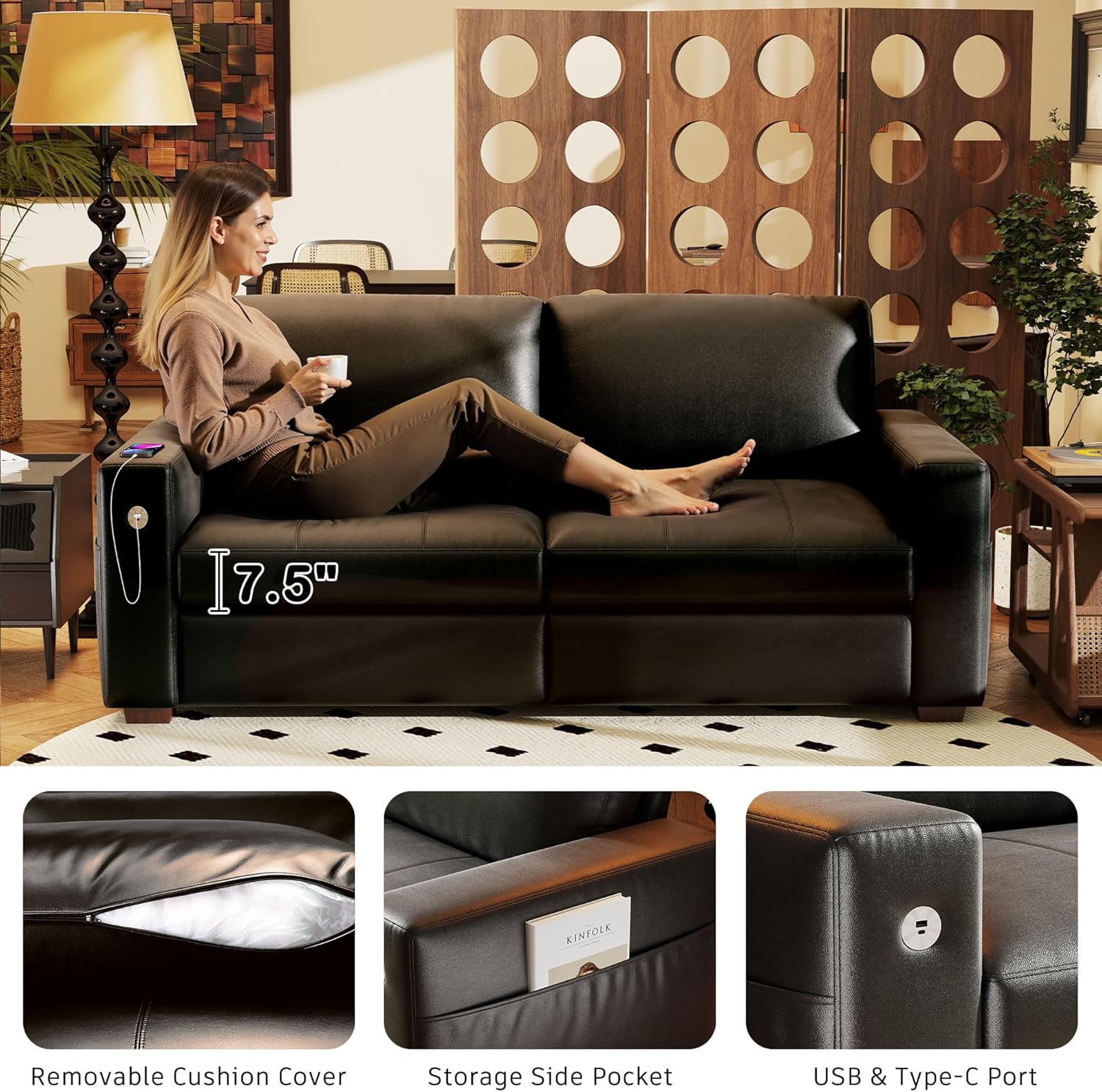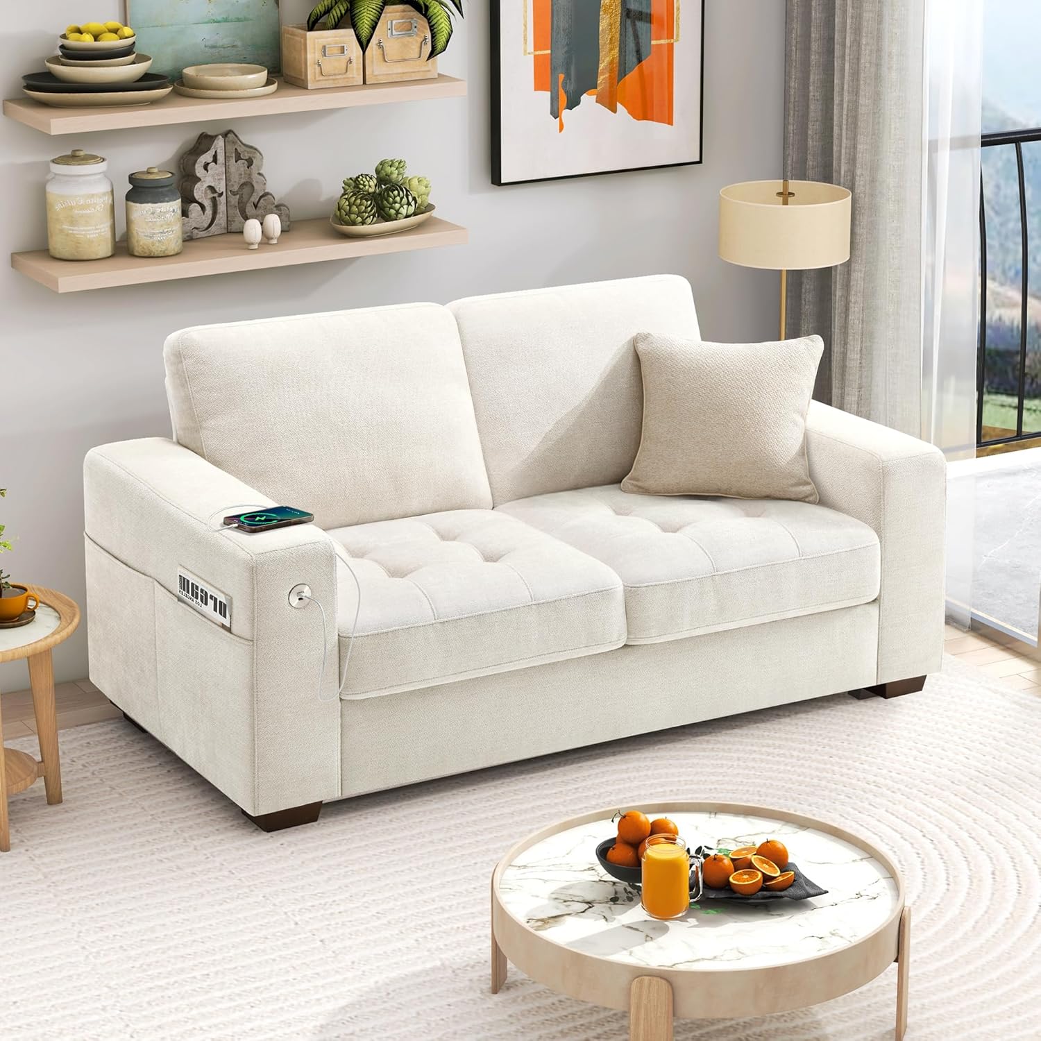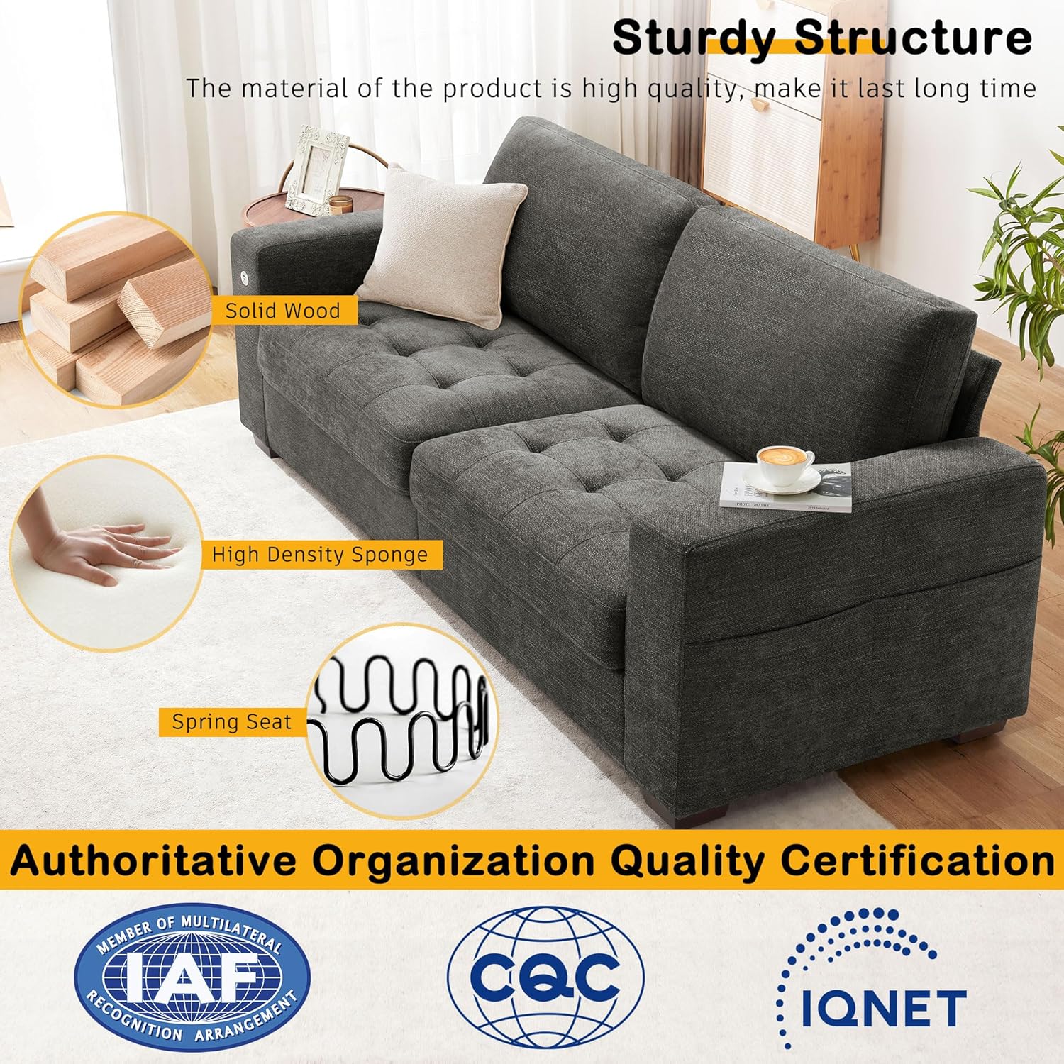 • ��Multi-Functional Couch & Quality Certified ��This couch comes with USB and Type-C ports. so you can easily charge your phone or iPad while you relax. Plus. there are four side pockets to keep your magazines or books close at hand. Our small space sofa is certified for quality by trusted institutions. and the 7.9-inch solid wood armrests along with thick wooden legs provide strong support. holding up to 900 lbs!