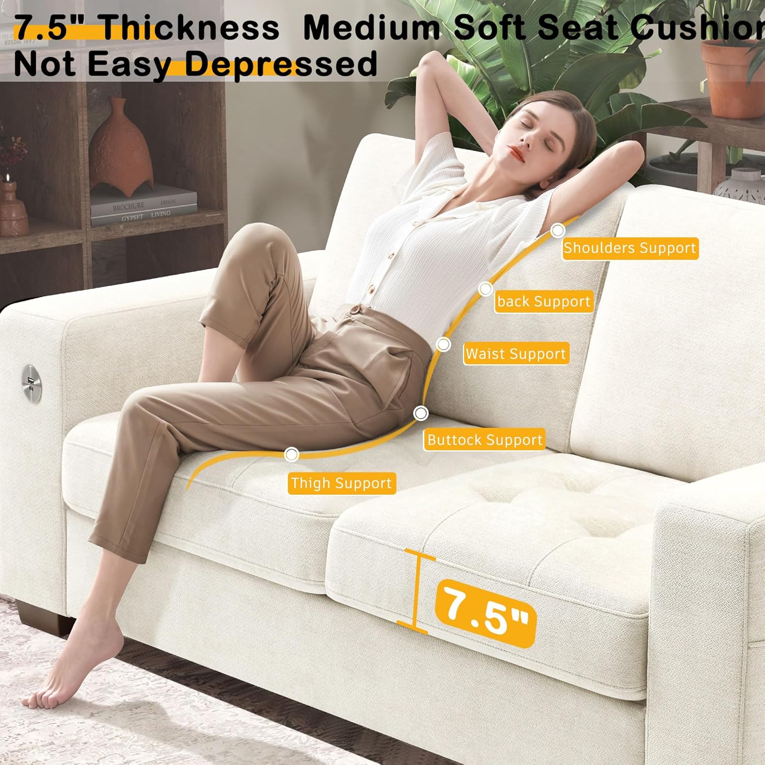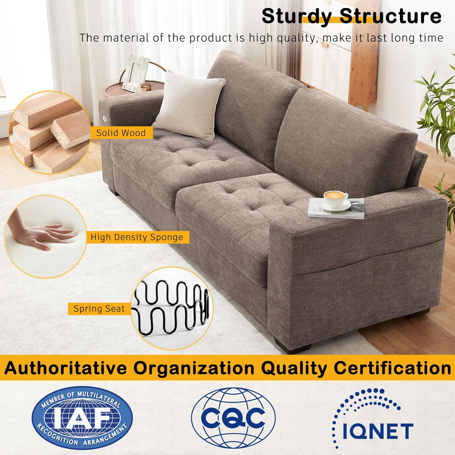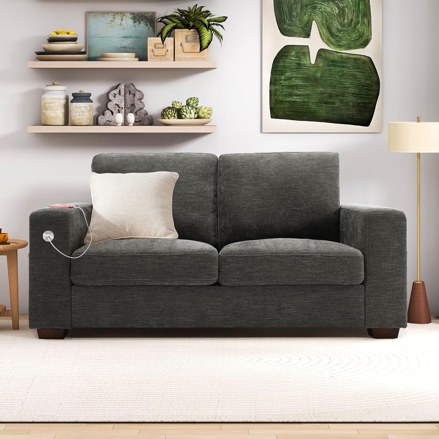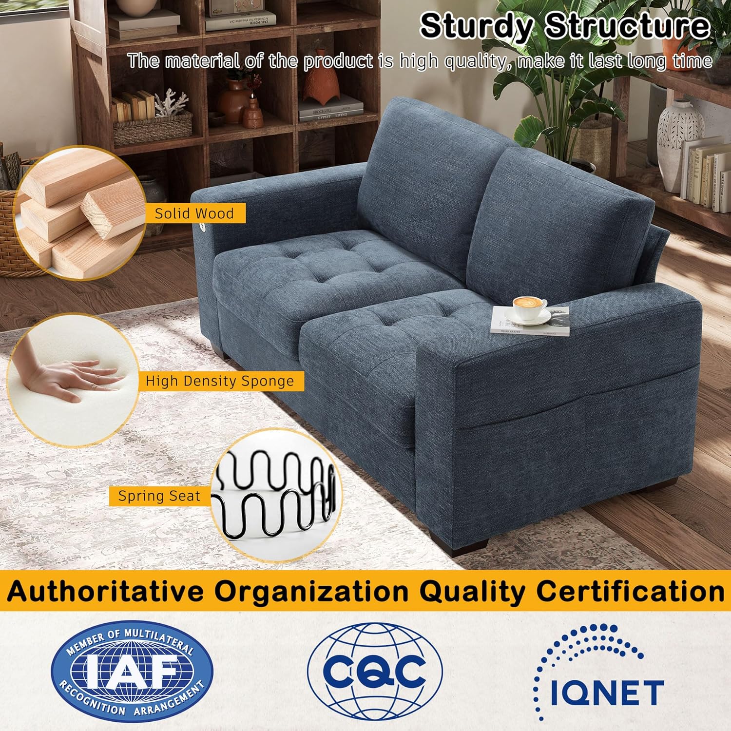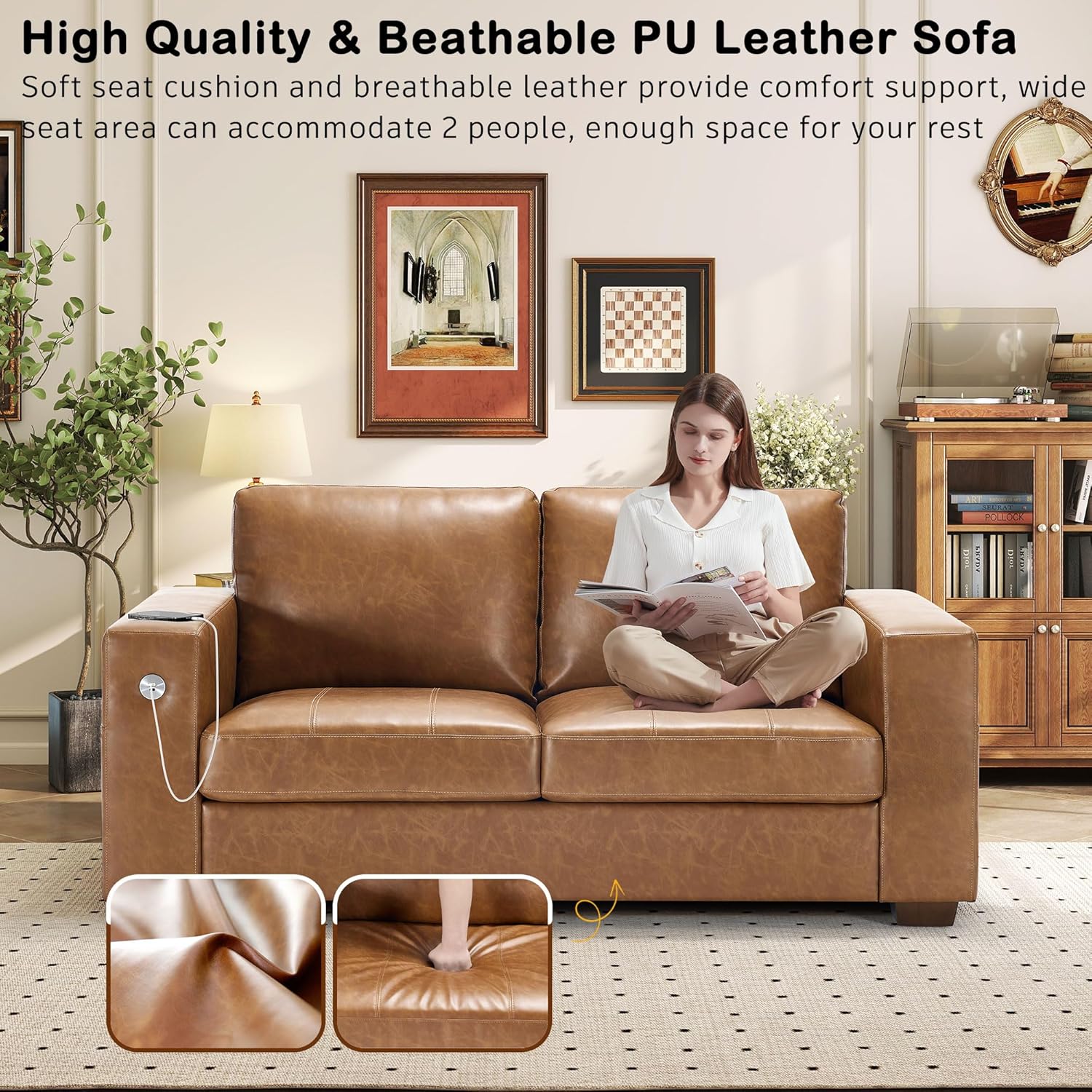 • ��Multi-Functional Couch & Quality Certified ��This couch comes with USB and Type-C ports. so you can easily charge your phone or iPad while you relax. Plus. there are four side pockets to keep your magazines or books close at hand. Our small space sofa is certified for quality by trusted institutions. and the 7.9-inch solid wood armrests along with thick wooden legs provide strong support. holding up to 900 lbs!