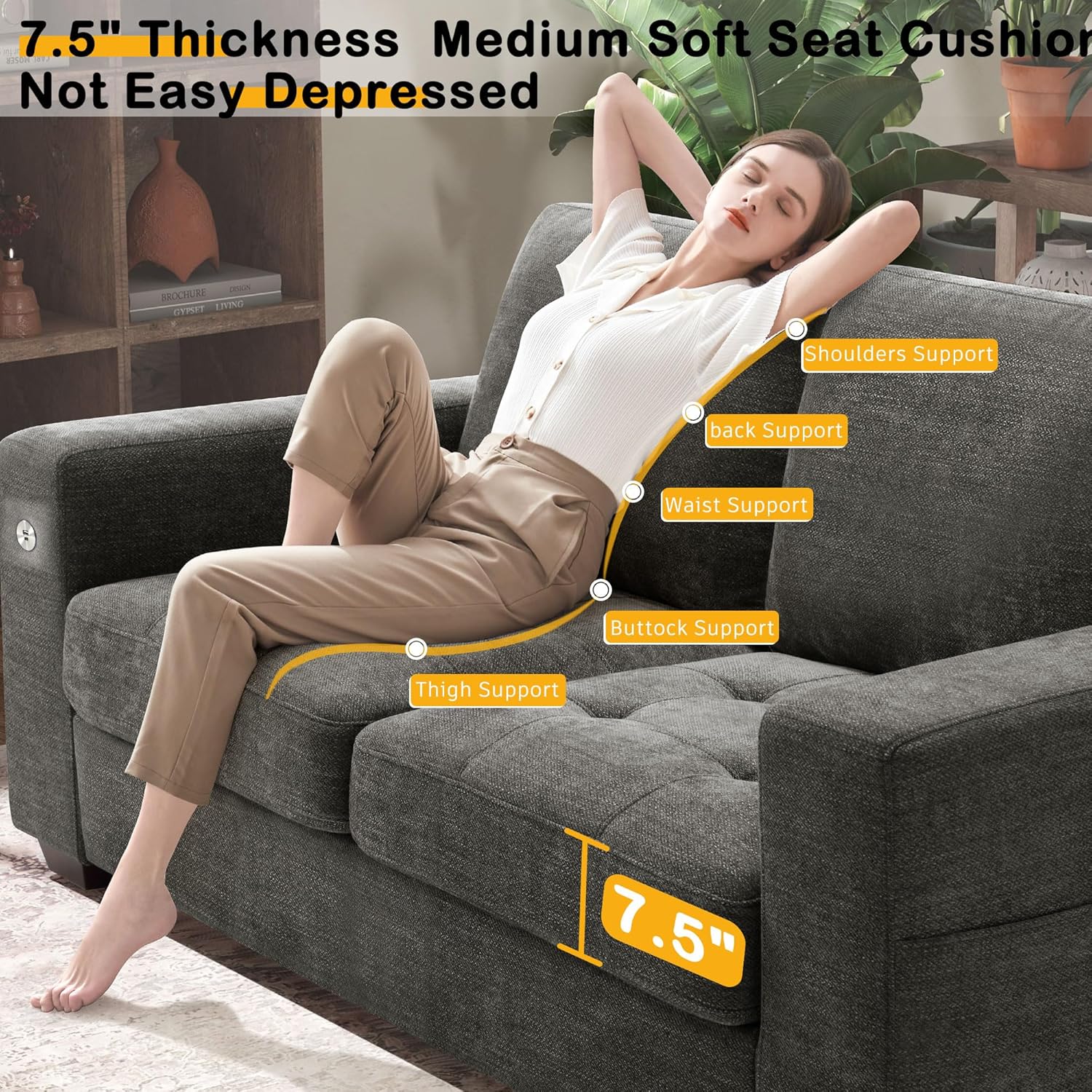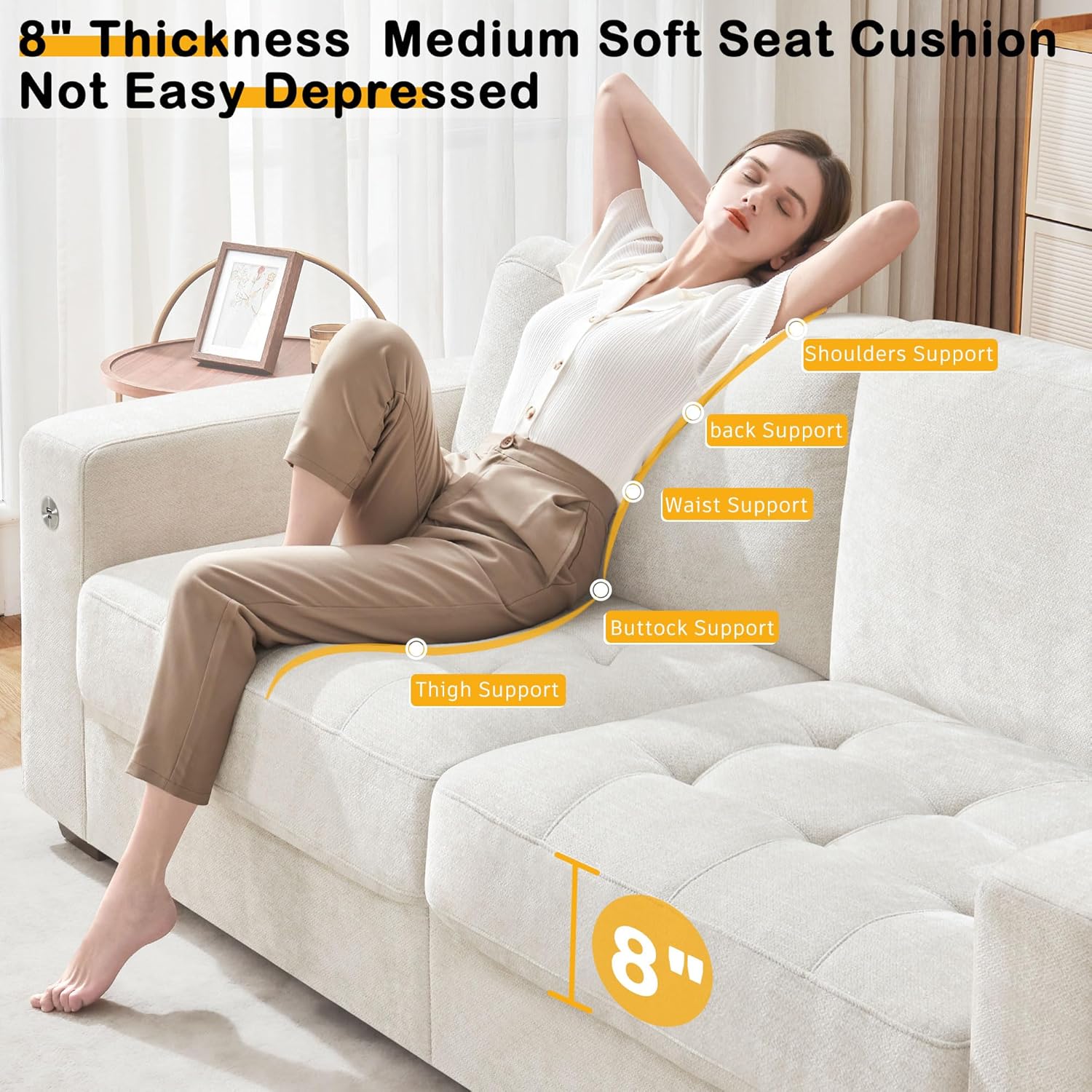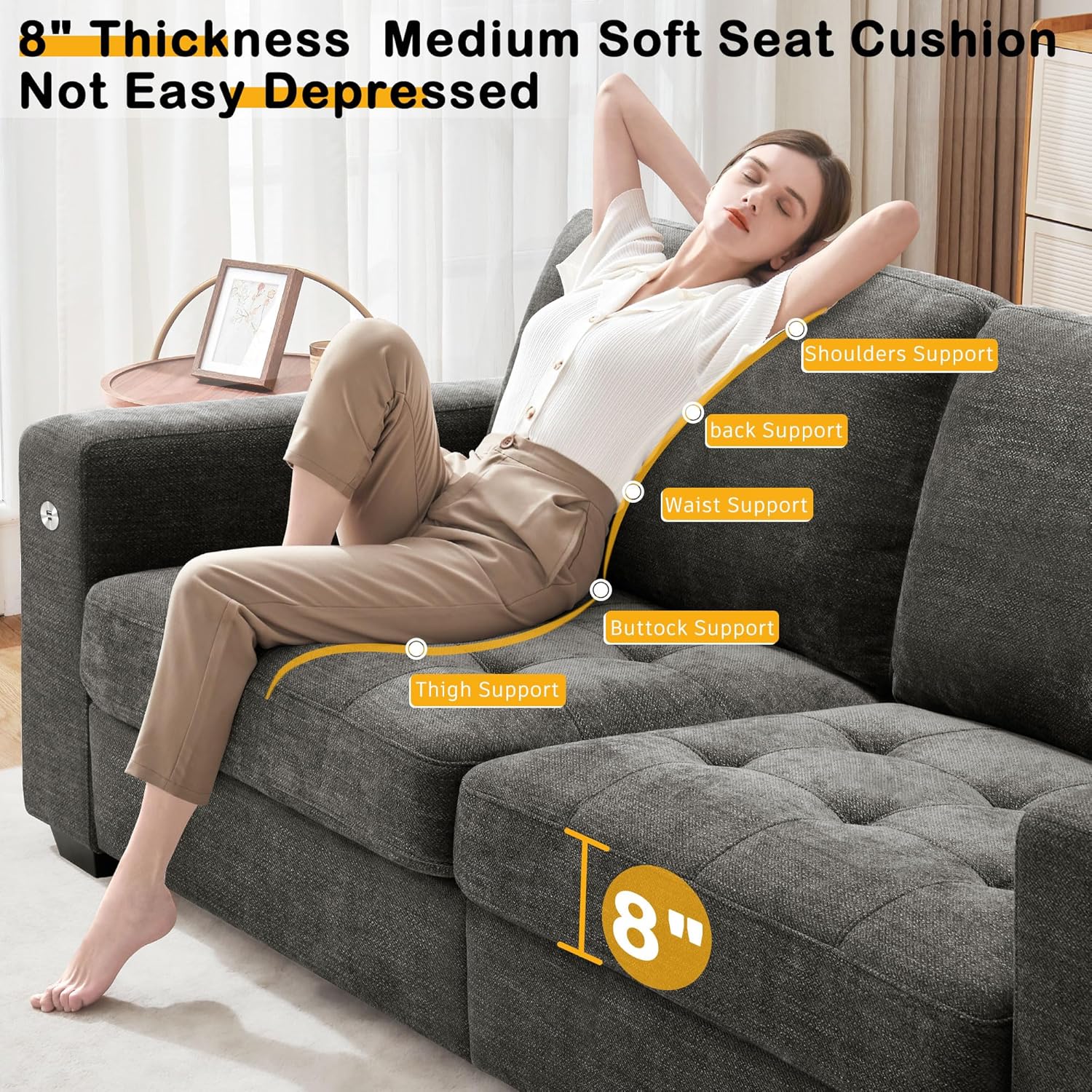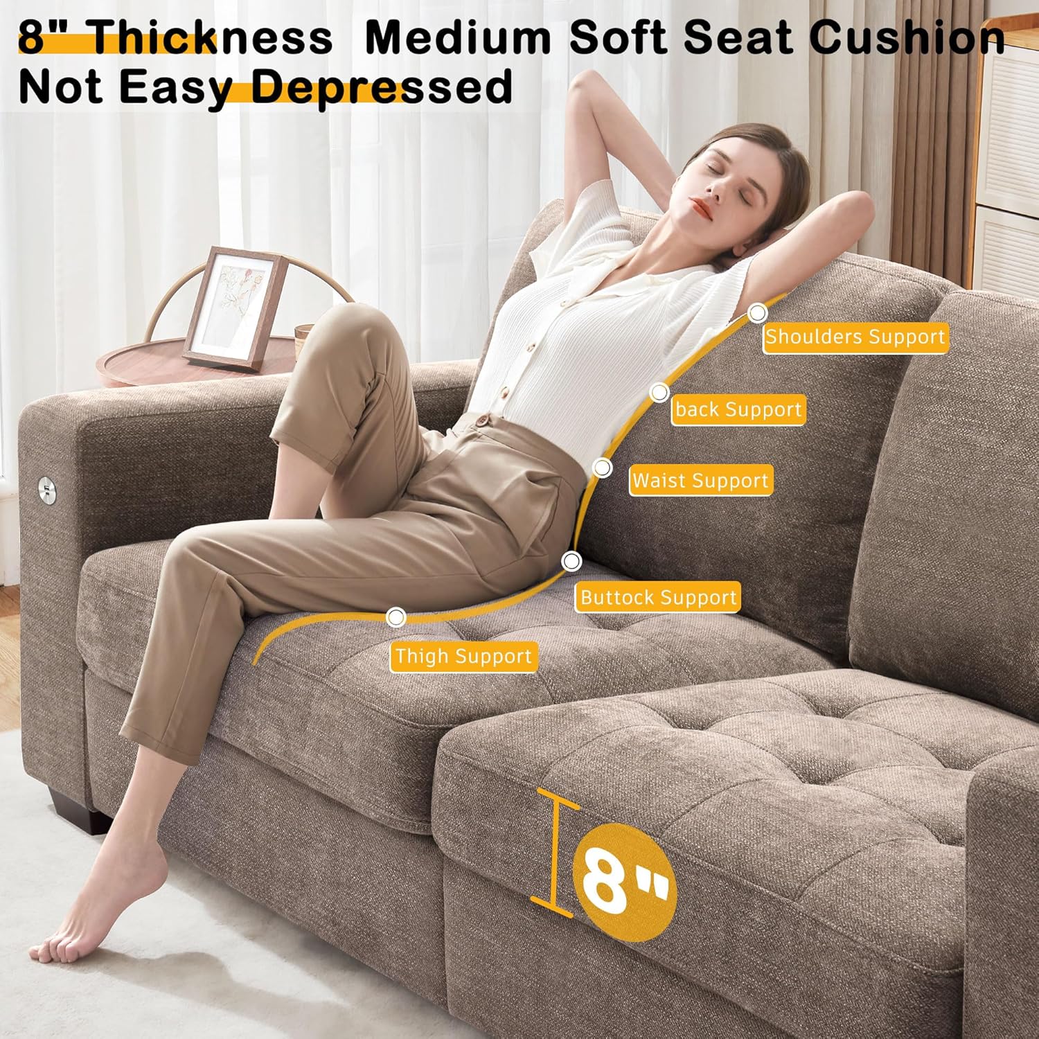 • ��Thick Seat Cushion & High-Resilience Sponge��Our sofa for living romm has a 8 inch medium-firm seat cushion made of high-resilience sponge. so it won't get depressed even after long use. The fluffy back cushion gives you soft support for extra comfort.