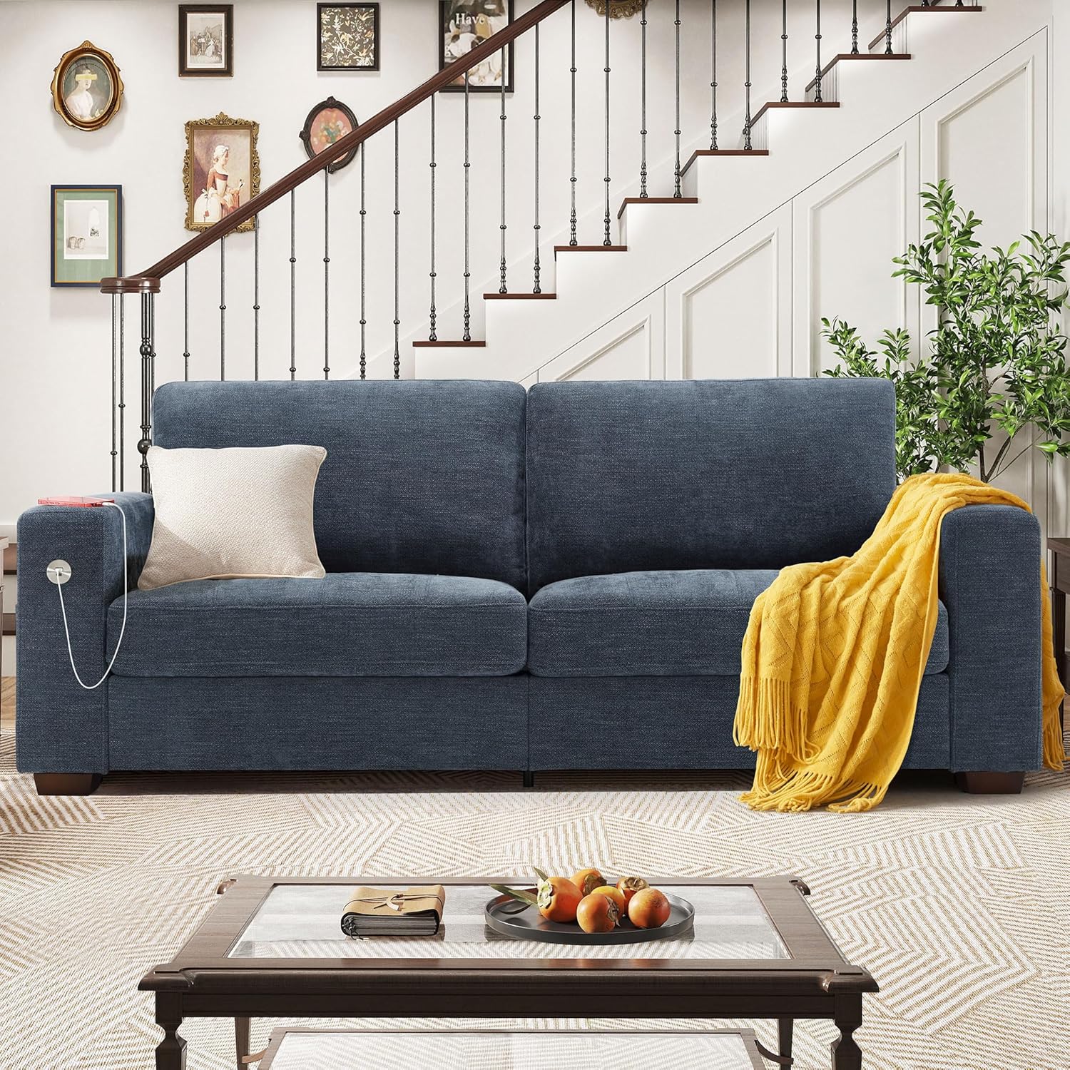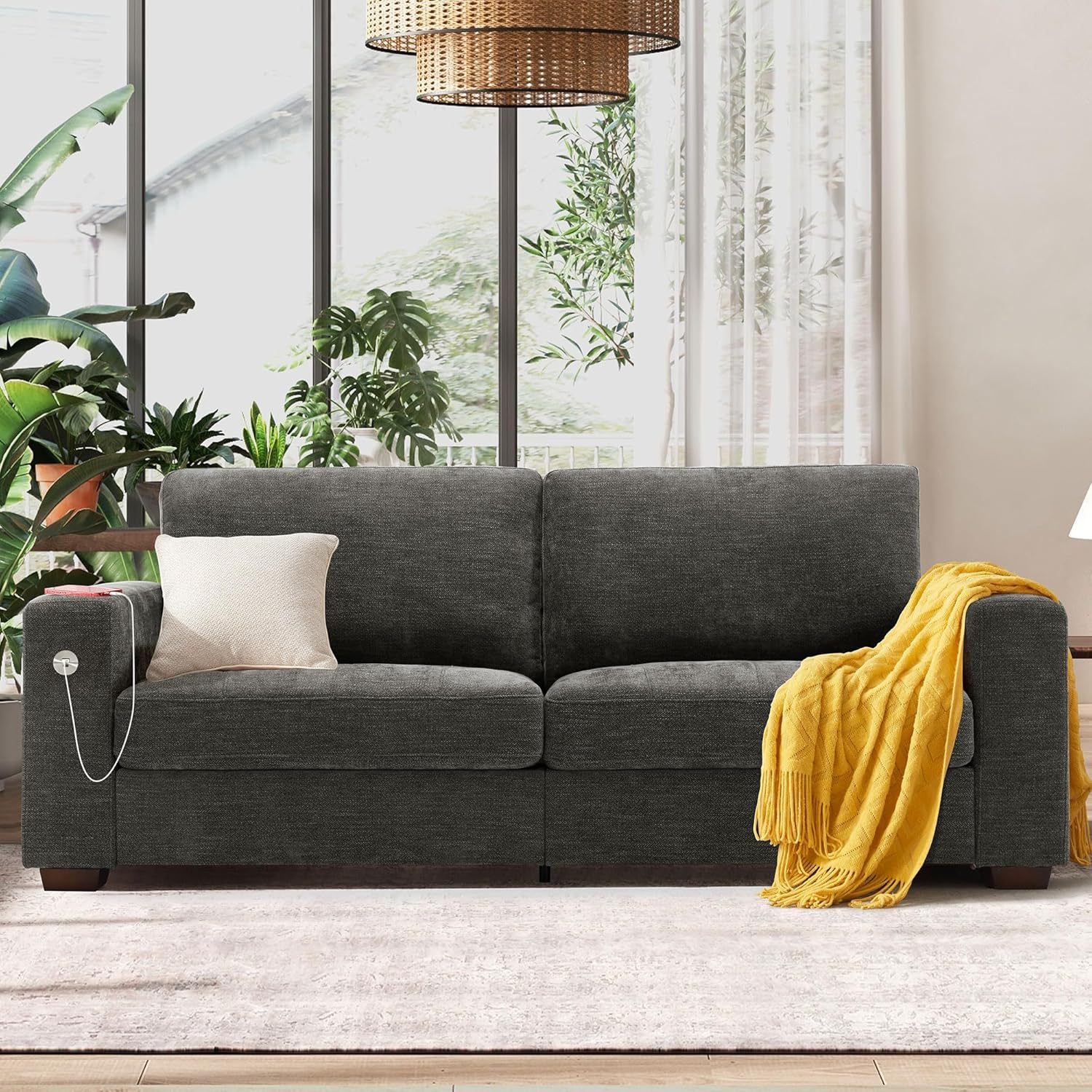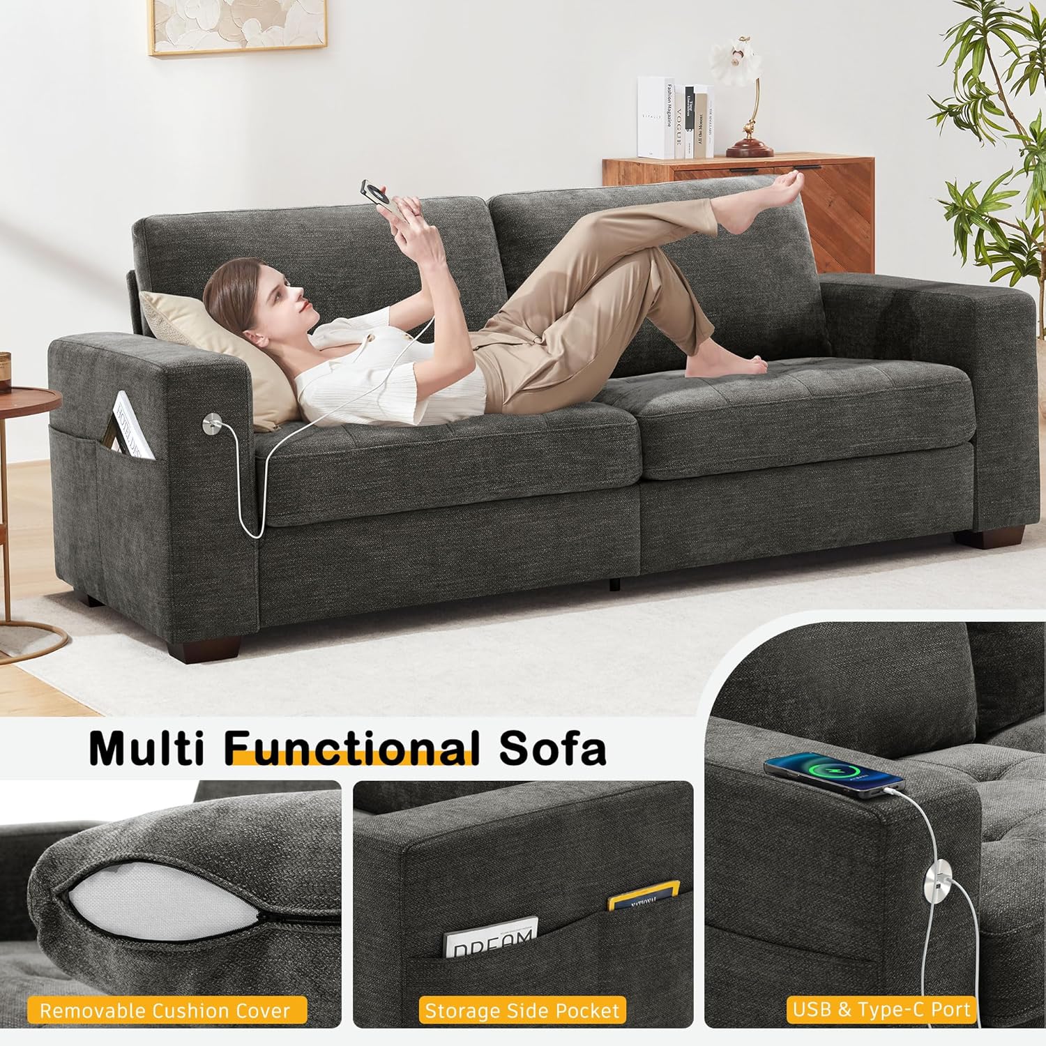 Hanherry 89" Sofa for Living Room, Modern Comfy Sofa with Medium Firm Seat Cushion, Removable Cover,Wide Armrest,USB/Type-C Port,Chenille Fabric Couches for Small Space,Apartment