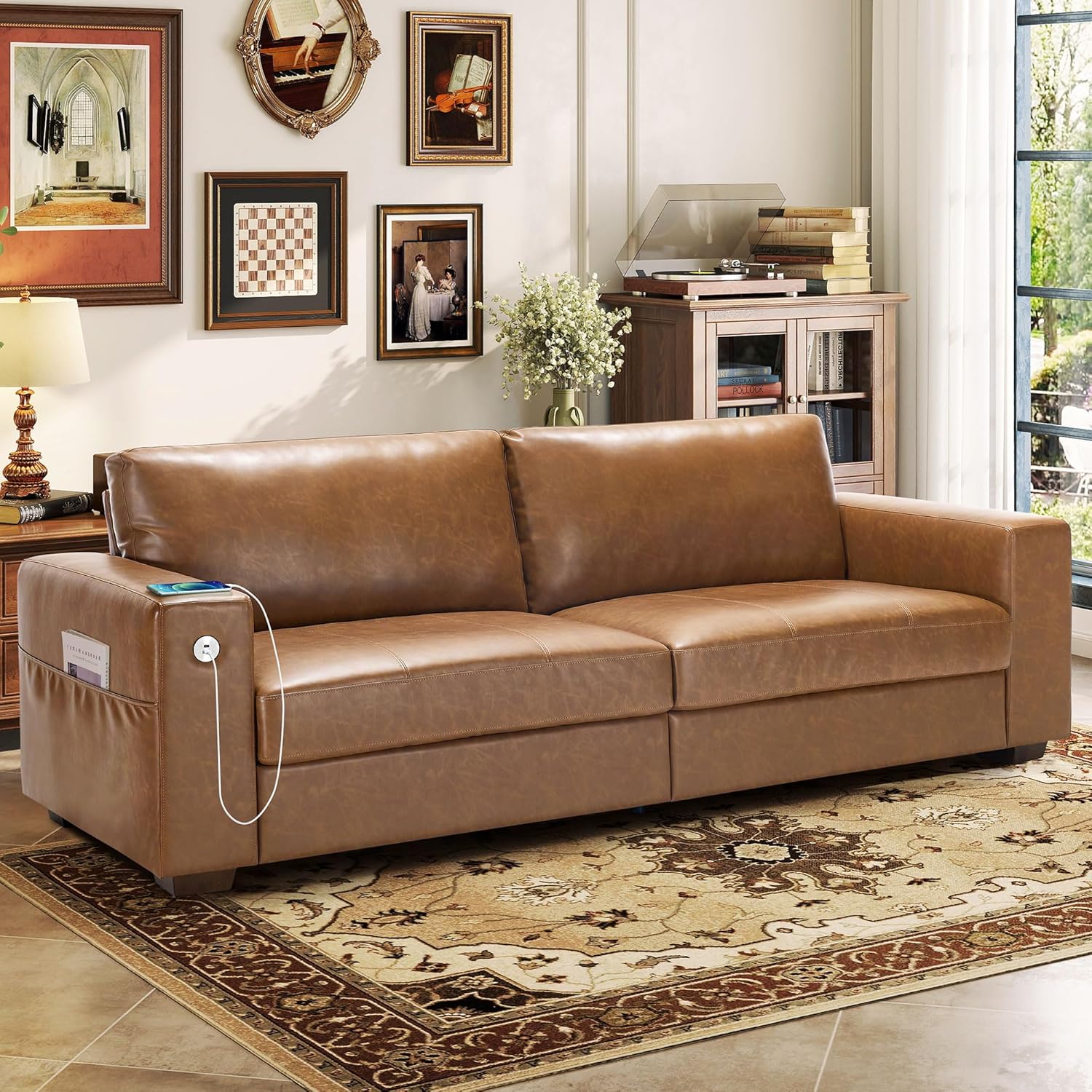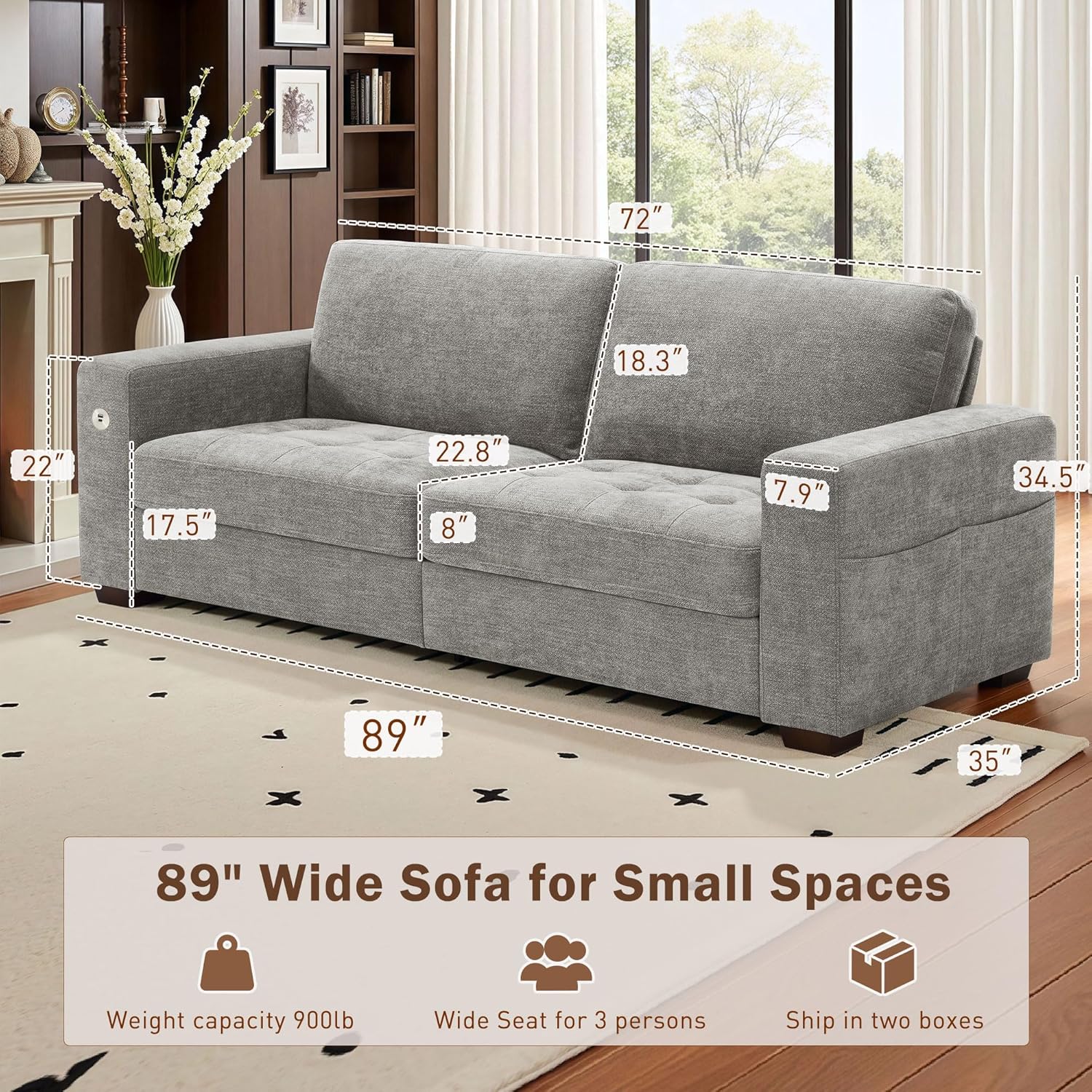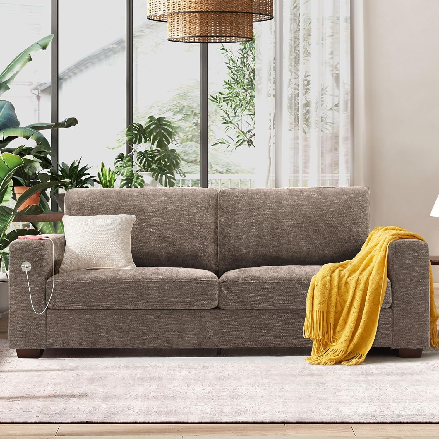 Hanherry 89" Sofa for Living Room, Modern Comfy Sofa with Medium Firm Seat Cushion, Removable Cover,Wide Armrest,USB/Type-C Port,Chenille Fabric Couches for Small Space,Apartment