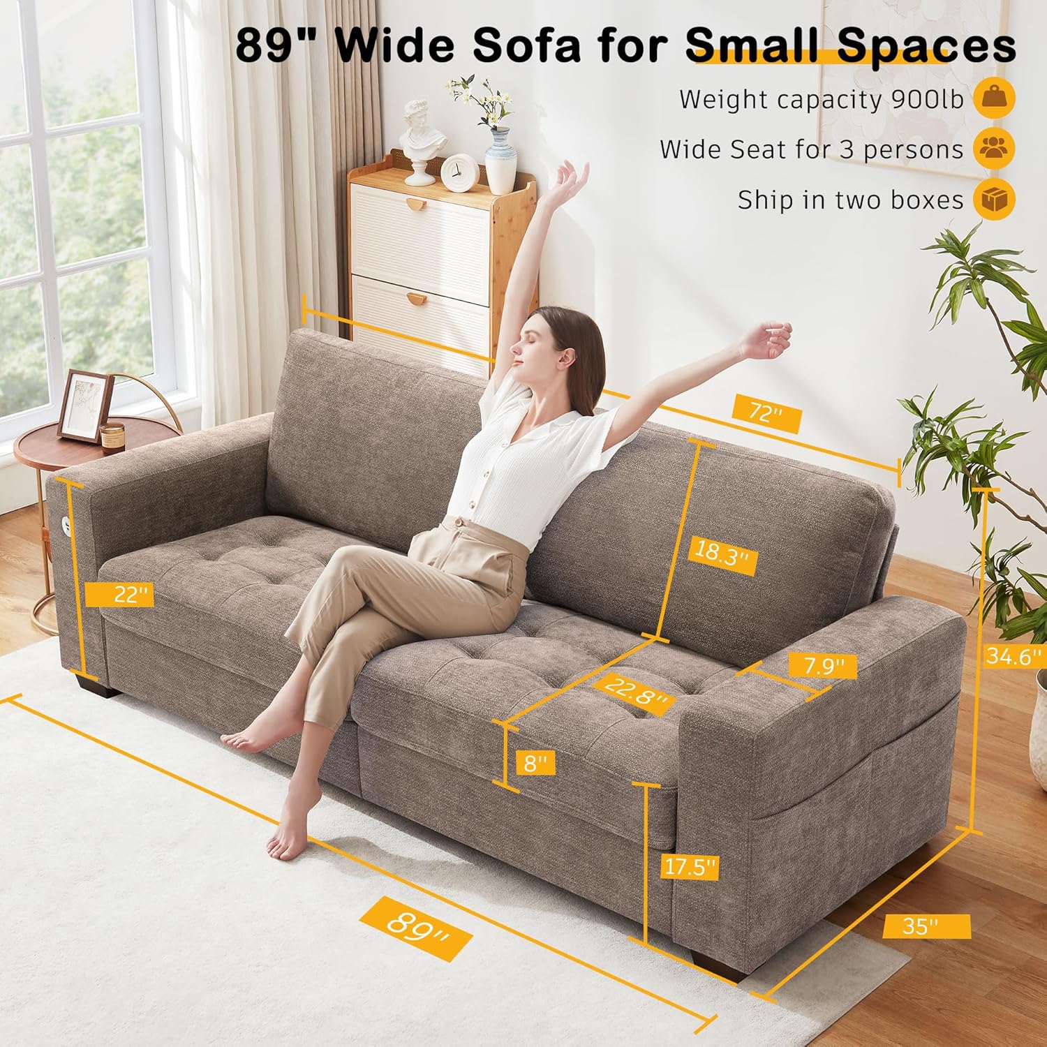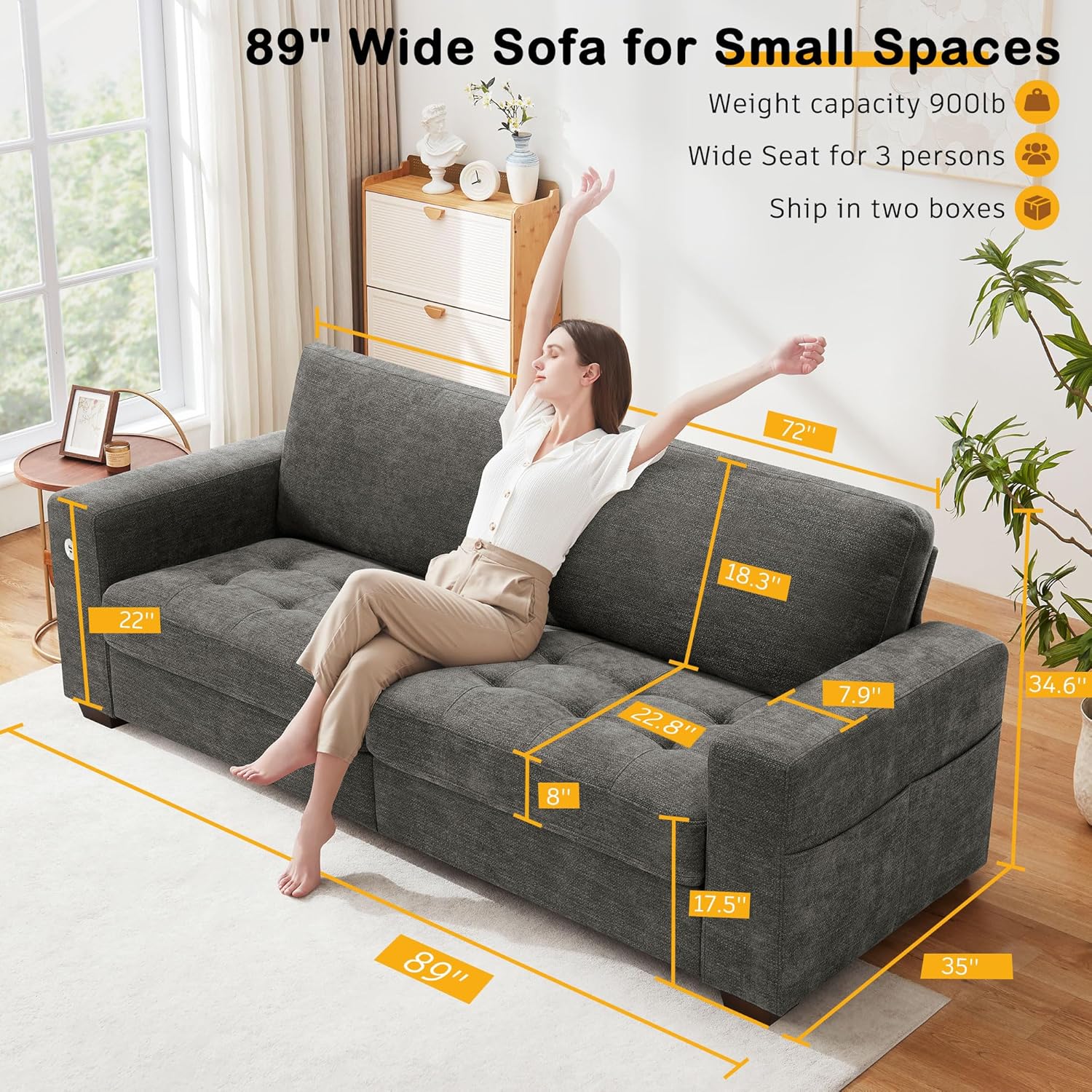 • Hanherry 89" Sofa for Living Room, Modern Comfy Sofa with Medium Firm Seat Cushion, Removable Cover,Wide Armrest,USB/Type-C Port,Chenille Fabric Couches for Small Space,Apartment
