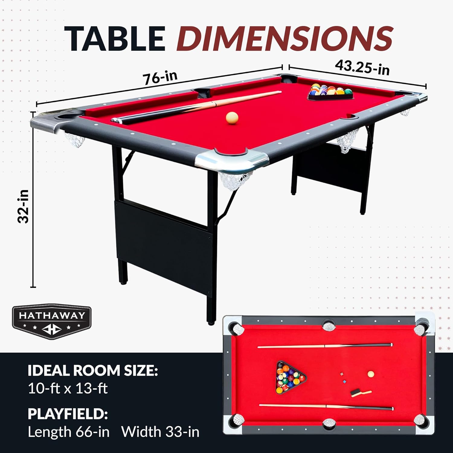- 6-FT PORTABLE POOL TABLE - Table measures 76-in L x 43.25-in W x 32-in H; Full set includes two 48-in cues. a set of 2.25-in balls. two pieces of chalk. an ABS plastic triangle. an ABS plastic brush. and a nylon cover.