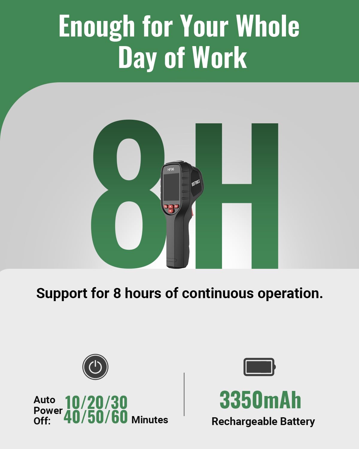• 【Durable and Sturdy】 (1) Built-in rechargeable battery provides up to 8 hours of continuous operation. (2) Built-in flash memory can store approximately 30.000 standard thermal images. (3) The 6.6ft drop test and IP54 protection rating allow you to work with confidence in most different work scenarios and even harsh environments. (4) Designed with a standard tripod hole. HF96 thermographic camera supports using a tripod to assist inspection works.
