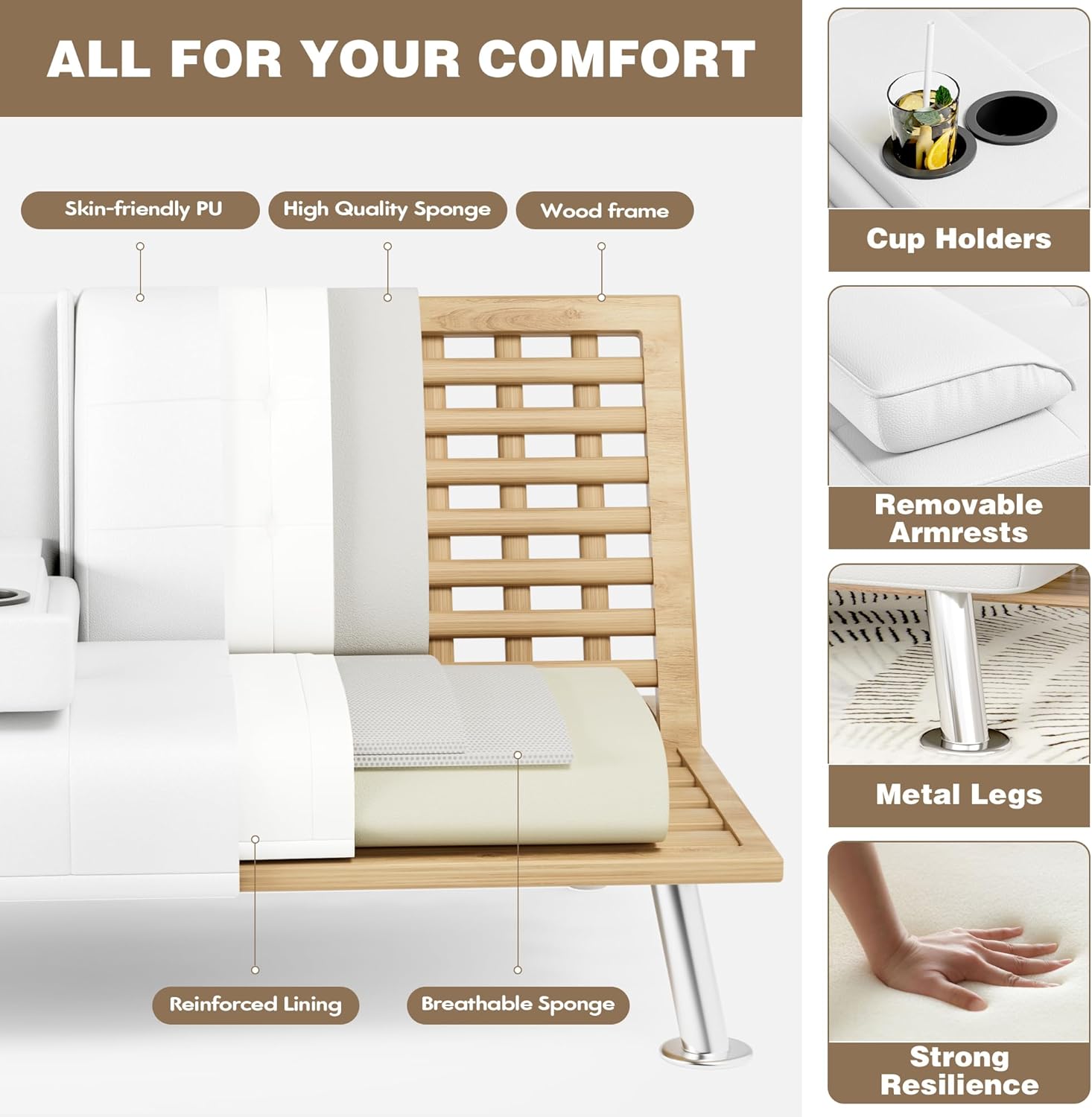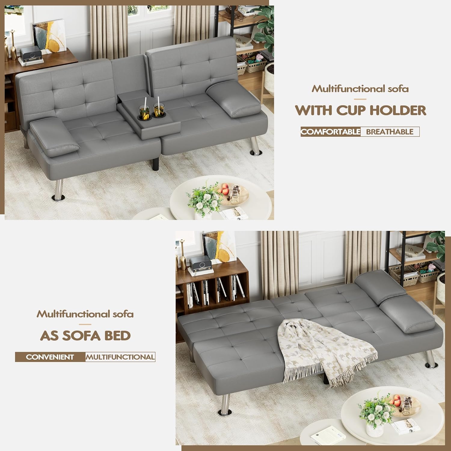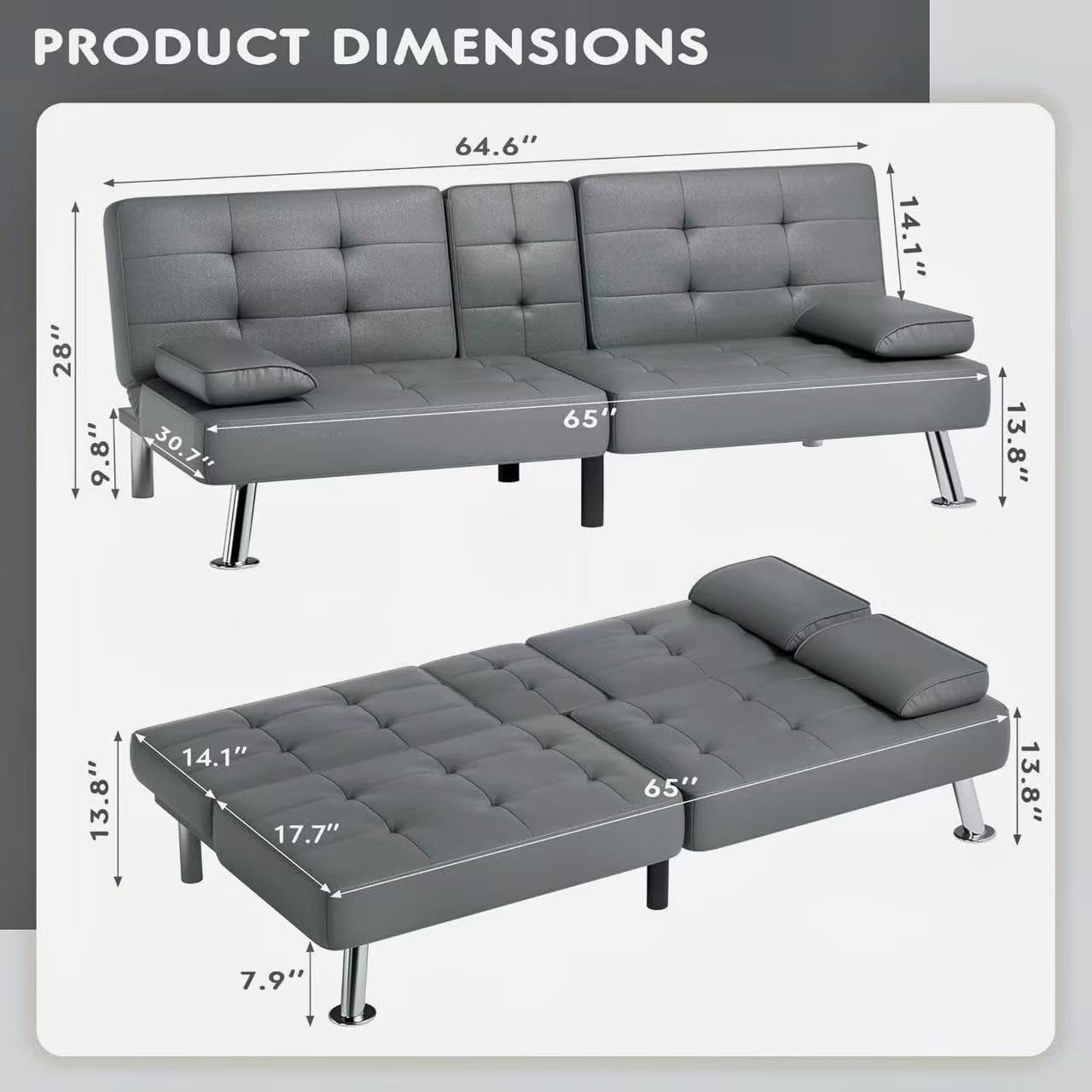 • Dual cup holders: The leather futon sofa is conveniently positioned cup holders ensure that your drink is within easy reach. perfect for leisurely enjoying your favorite beverage. It can also be hidden away when not in use. keeping the sofa neat and beautiful.