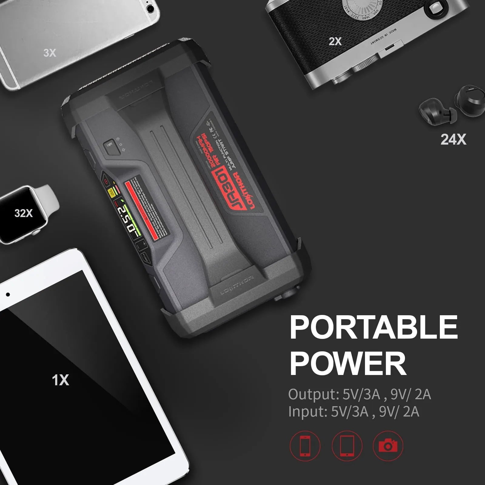 A portable emergency power solution brand designed and manufactured by GREPOW Battery Company (sub-brands: Tattu. Gens Ace). just released the JA301 industry-leading multi-purpose portable device. containing a jump starter. air inflator. LED light as well as power bank function. With a capacity of 74Wh. 20000mAh. 2000A peak current. LOKITHOR JA301 is always your reliable backup. We keep our focus on providing convenient solutions for automotive emergencies. and LOKITHOR JA301 is always your reliable backup.