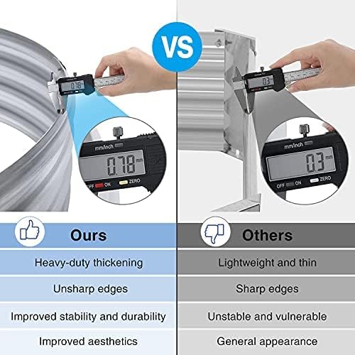 Material: THIS galvanized raised garden bed is made of Q195 galvanized metal sheet. wave structure and oval shape. withstand greater pressure. should not be loose. the interface will not be deformed. and can be reused for many years. The upgraded arc-shaped design makes the interface smoother. double the thickness. and the thickness of the galvanized sheet is up to you. You do not have to worry about the sharp flakes cutting you and your family. Comparing this product with ordinary rectangular elevated garden beds with a thickness of 0.012 inch