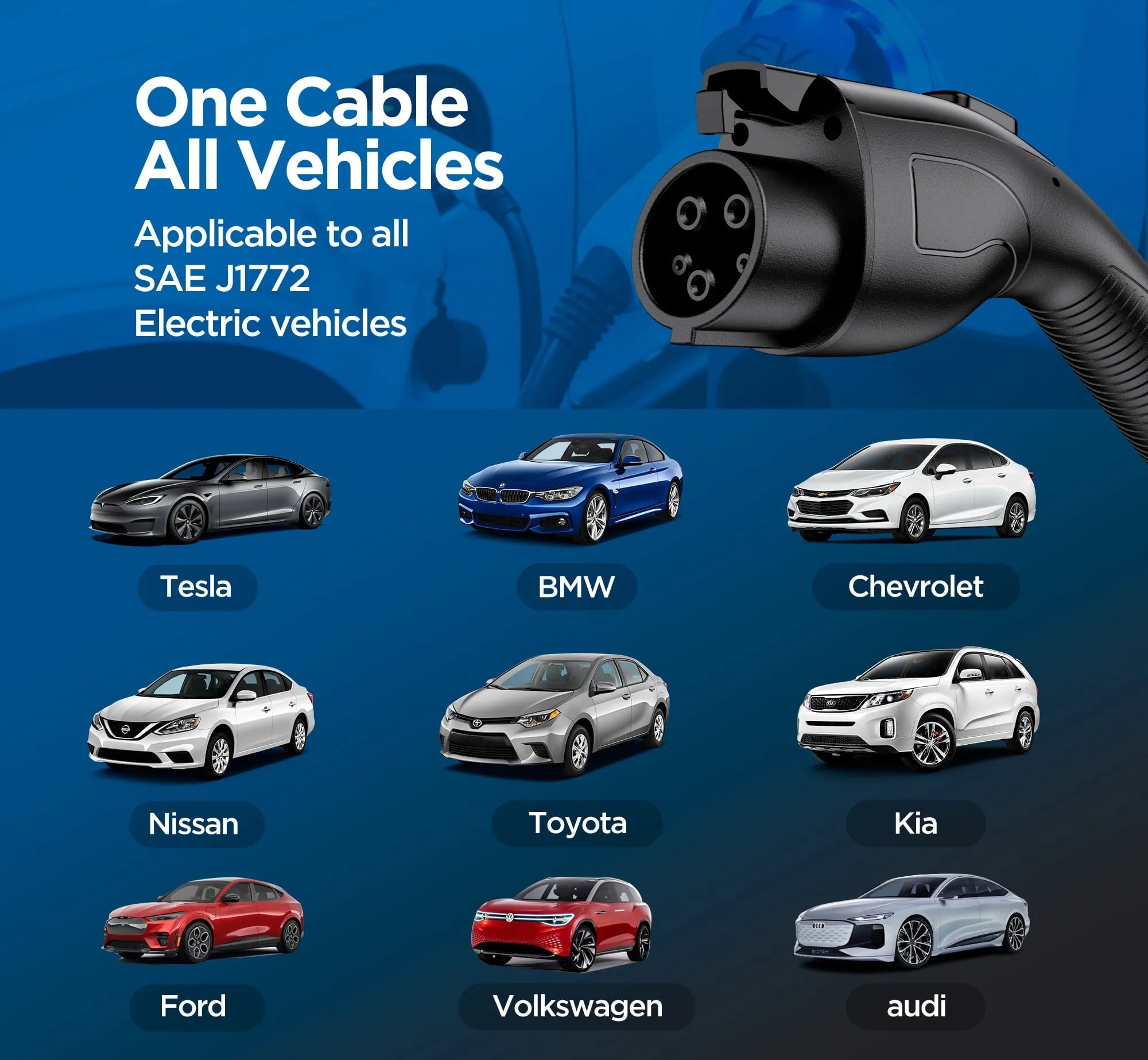 Note 1. The electric car charger can charge all J1772 electric cars and Tesla. but a J1772 to Tesla adapter is needed for Tesla charging(The adapter is not included).
