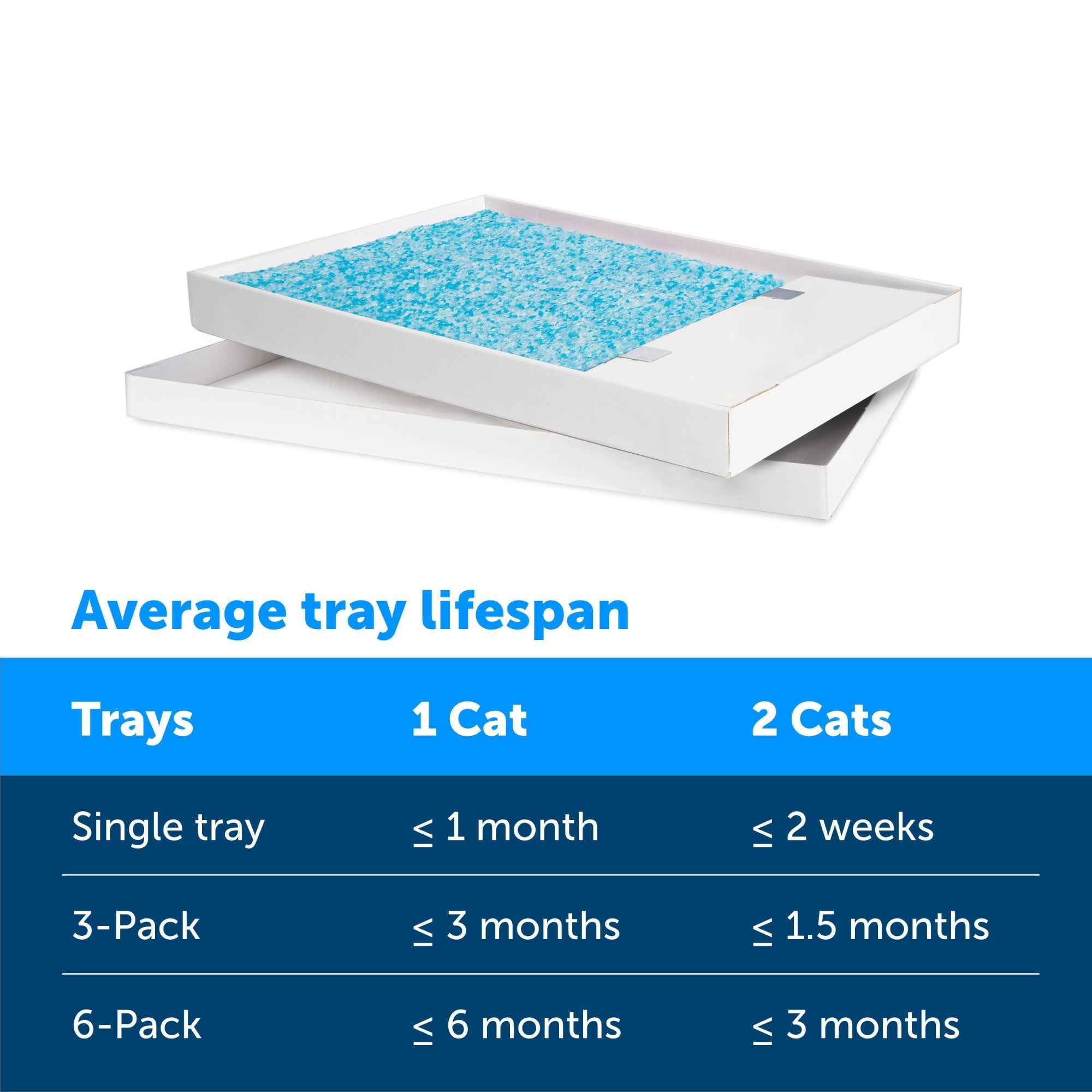 Each ScoopFree Complete Disposable Crystal Litter Tray is pre-filled with premium blue crystal cat litter so all you have to do is load the tray in the litter box with no scooping cleaning or refilling for weeks! Crystal litter absorbs urine and dries solid waste to quickly remove odors 5 times faster than clumping clay litter. Low-tracking crystals dont stick to your cats feet and are 99% dust-freedesigned for all the days you dont want to sweep the floor (again). And the plastic tray lining creates a powerful extra barrier to protect your floors against leaks. When its time to clean up just remove the disposable litter tray and throw it away. It doesnt get much easier than that! Your pet deserves the best. Trust PetSafe to help keep your pet healthy safe and happy.