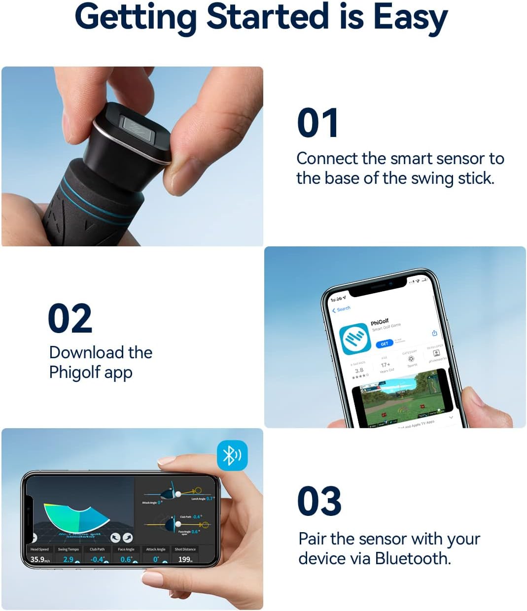 • GOLF FOR EVERYONE: Experience the excitement of golf with Phigolf! Our lightweight 9.8g USB-C motion sensor offers a realistic feel. Simply pair it via Bluetooth. attach it to a swing stick or your golf club. and start playing. Phigolf is user-friendly. making it accessible for all golfers. including beginners. Enjoy multiplayer sessions for up to 4 players and practice swings anytime. anywhere!
