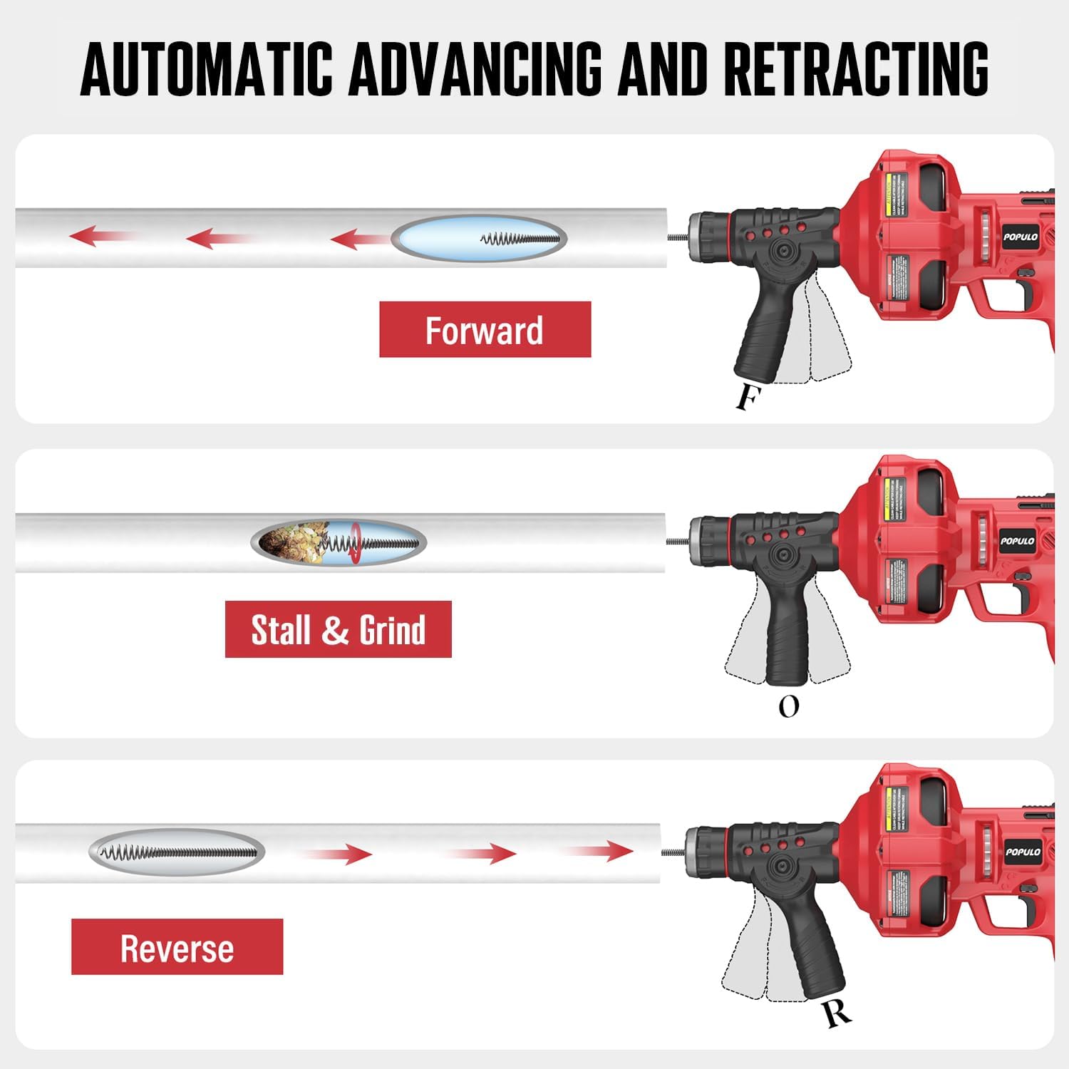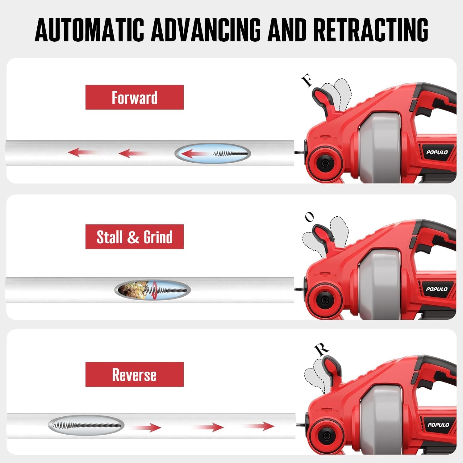 - All-in-One Plumbing Solution:25 Ft(1/4”) flexible cable is replaceable !Clears clogs with ease from drains from ¾ up to 2 in diameter including sinks. bathtubs.Drainage pipes and showers. Powered forward and reverse feeding mechanism make the cable down or back drains automatically and cable lock setting holds cable in place while tackling tough clogs.