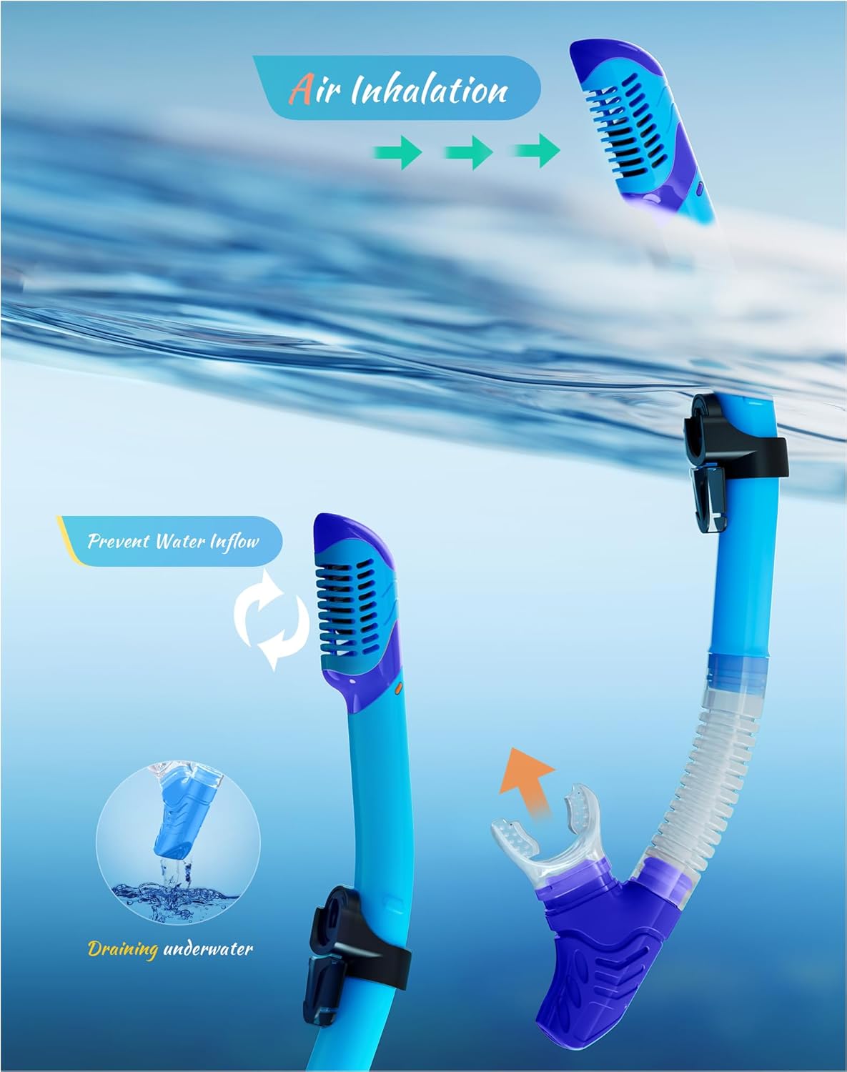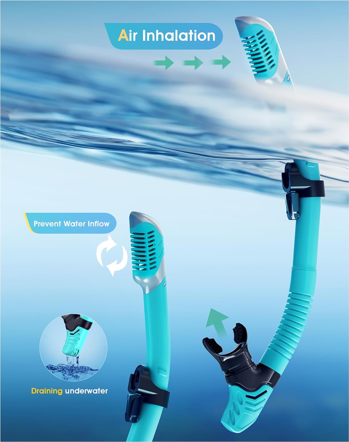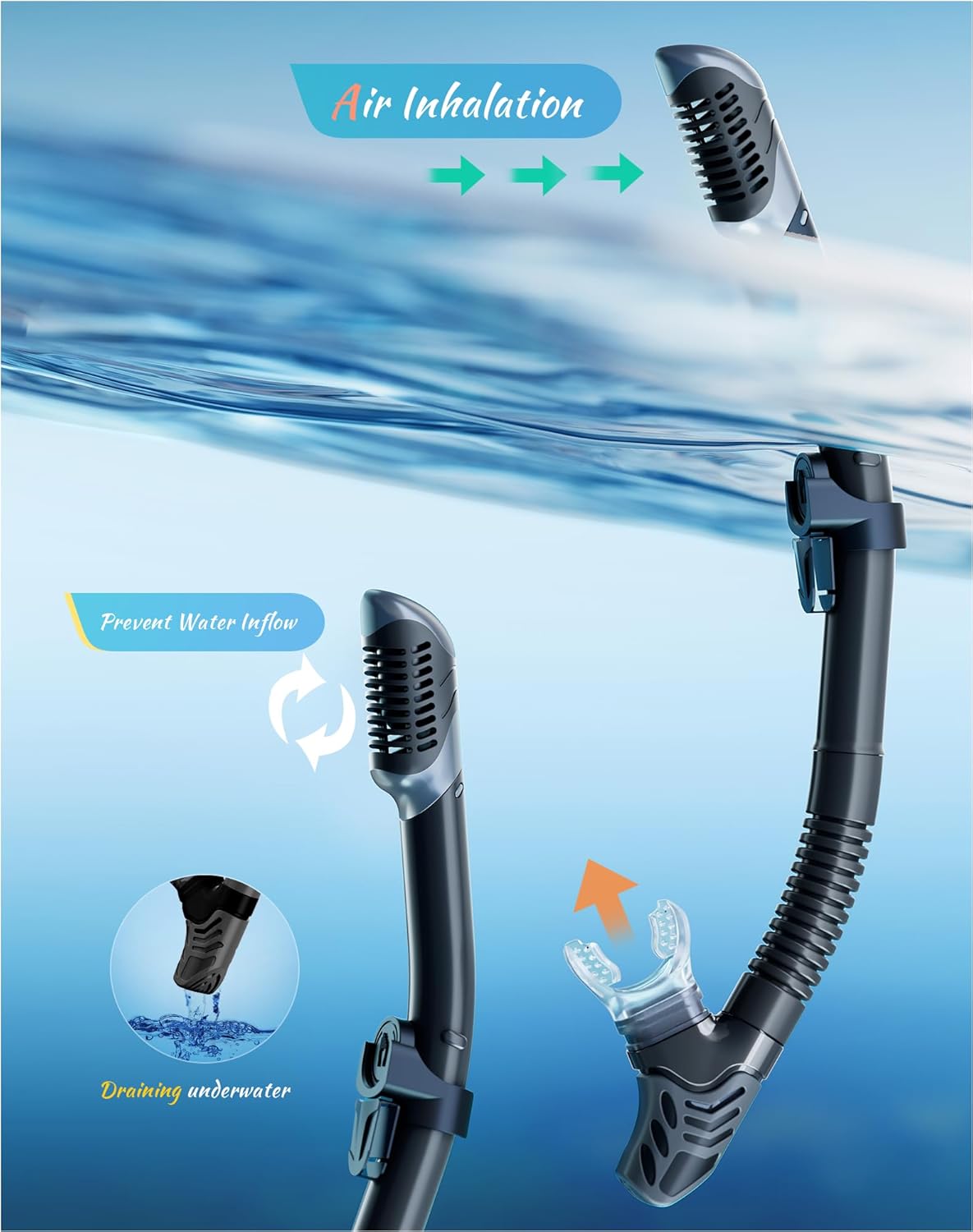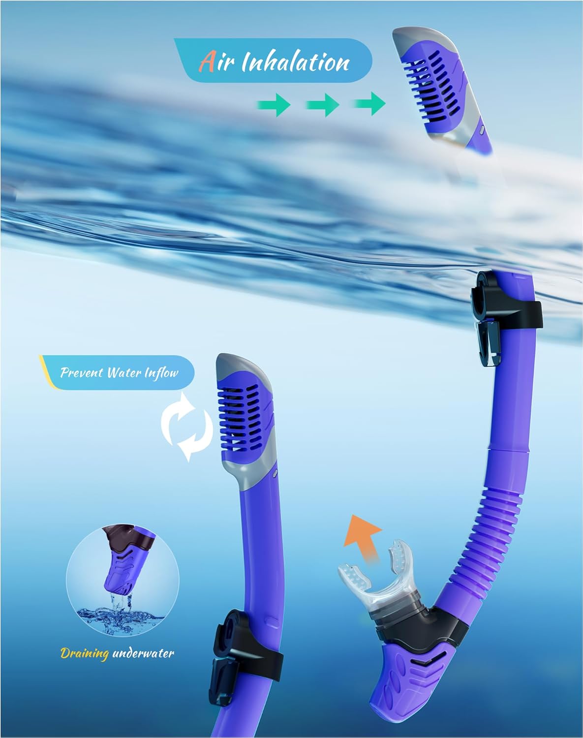 - ��Dry Top Anti-Splash Design��Snorkel set adult installs an one-way inhalation valve and has a mobile floating ball on the top of it. Once the tube is underwater. the tube entrance will be closed by the floating ball.Whether you are swimming or diving. you can easily handle it.