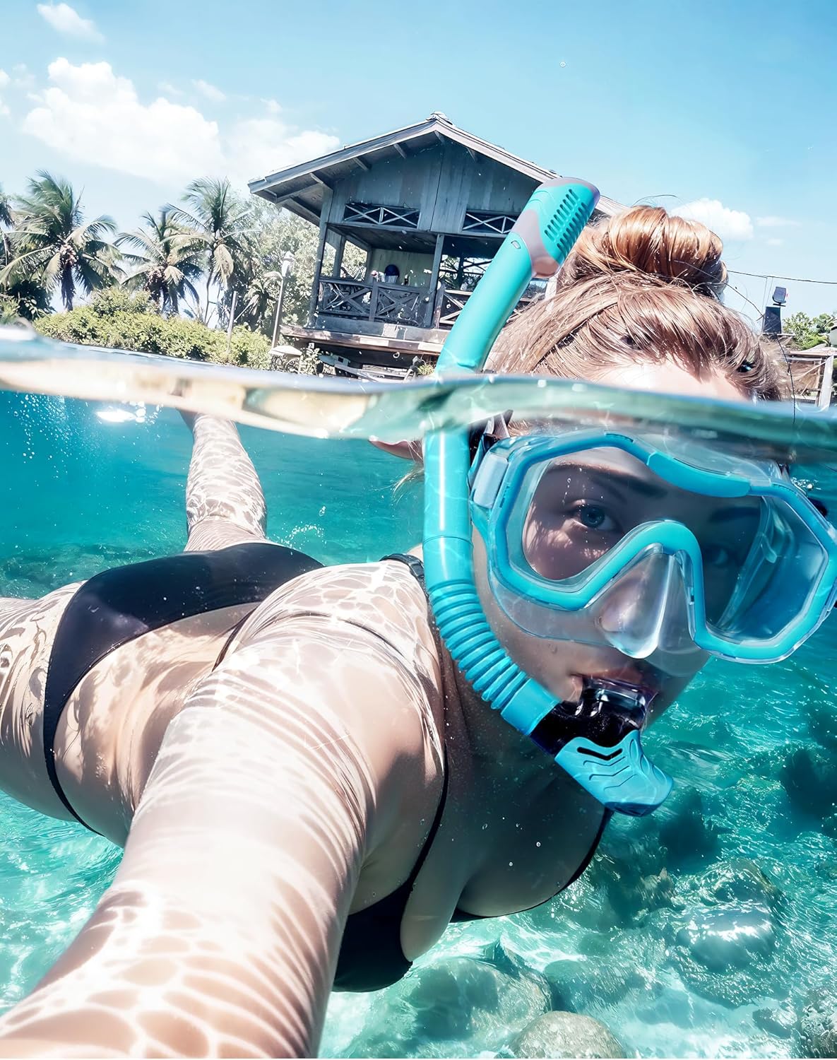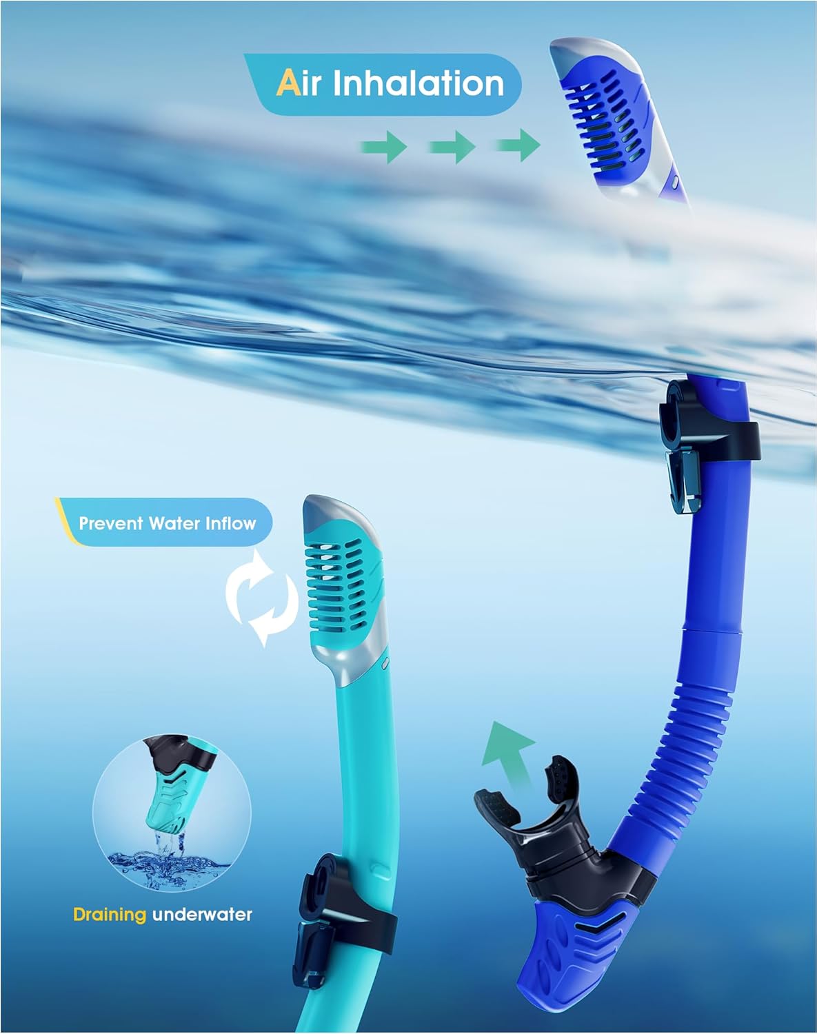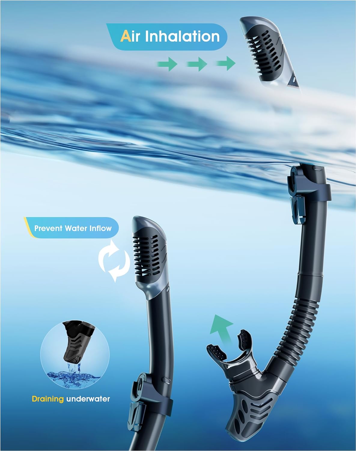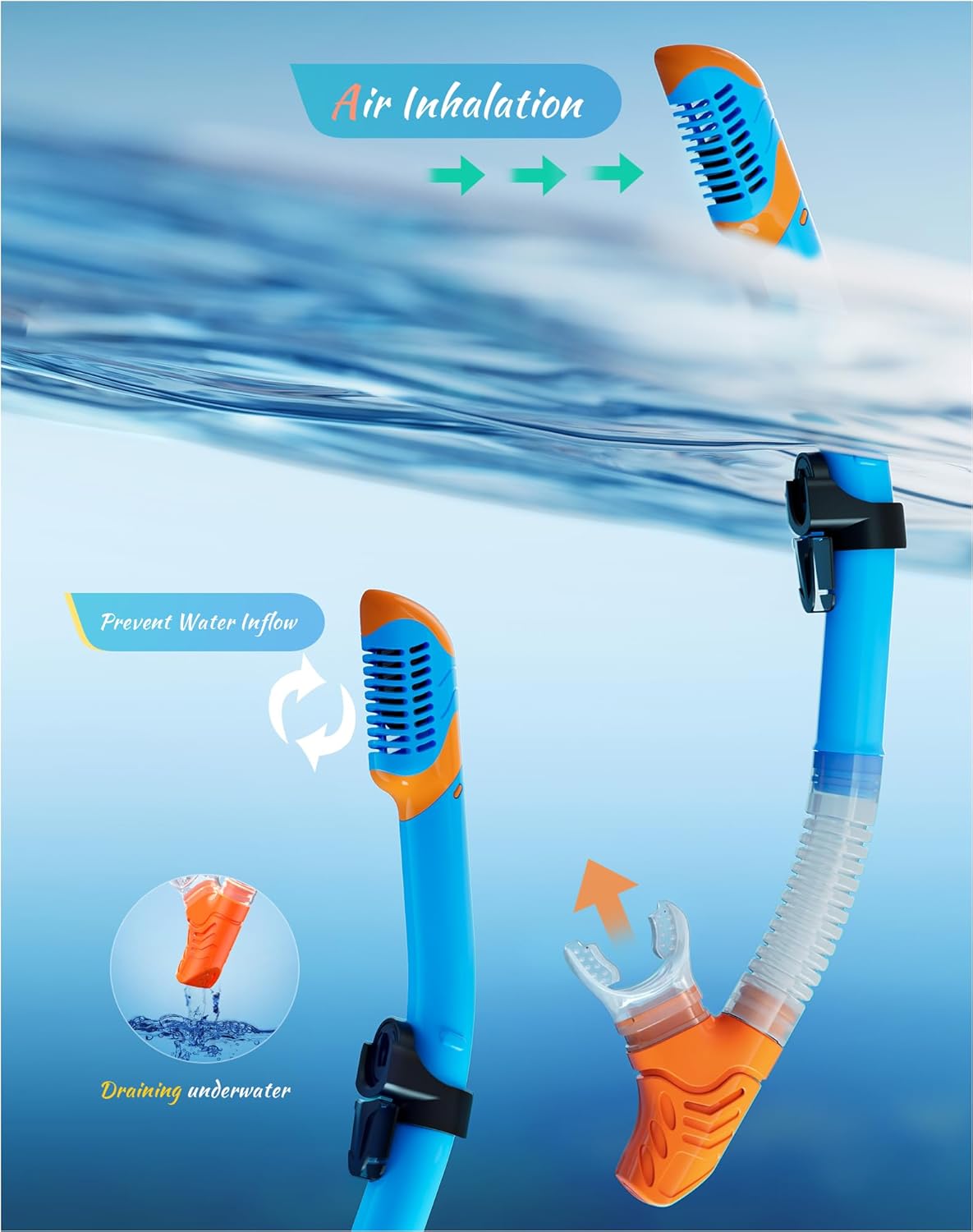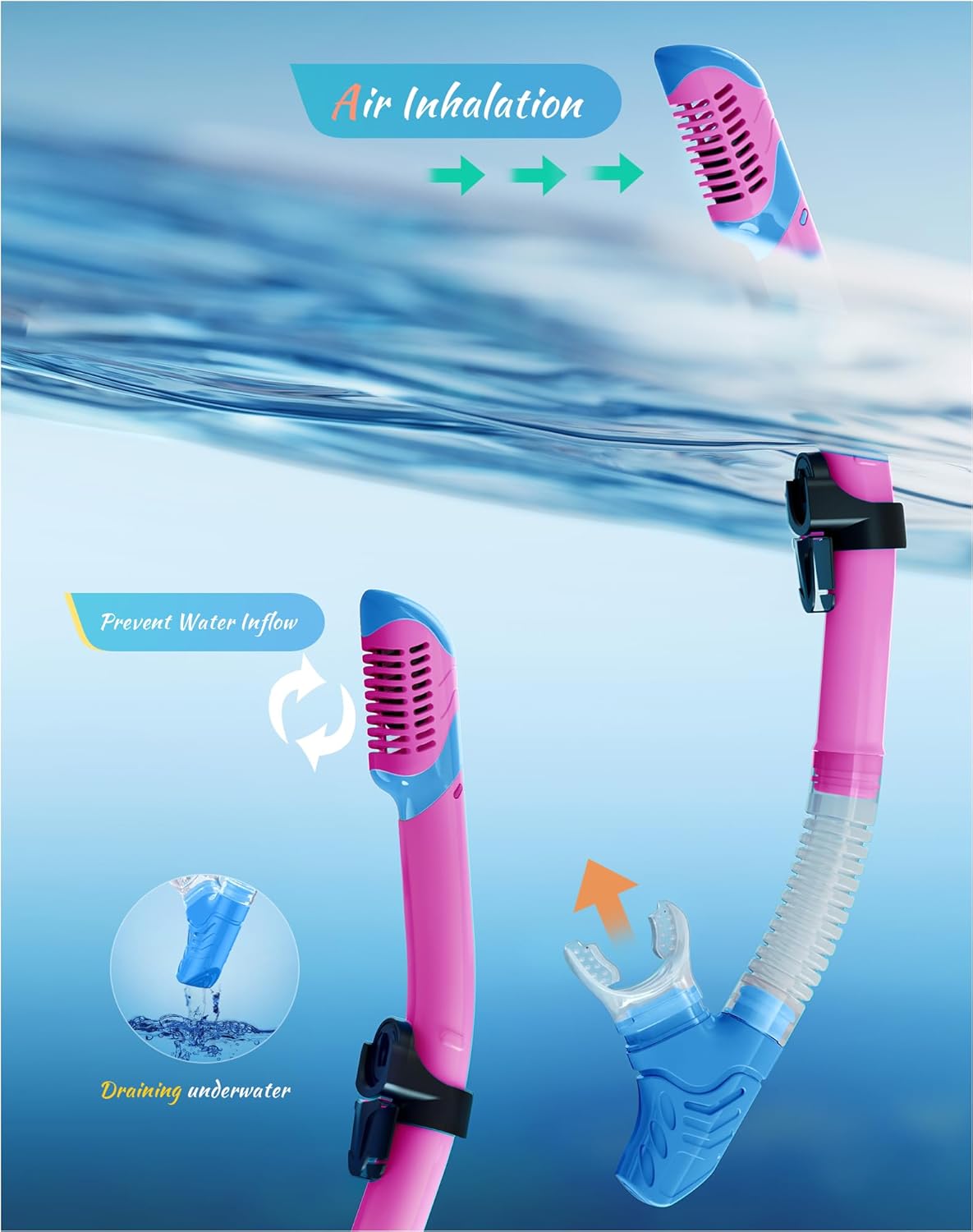 - ��Dry Top Anti-Splash Design��Snorkel set adult installs an one-way inhalation valve and has a mobile floating ball on the top of it. Once the tube is underwater. the tube entrance will be closed by the floating ball.Whether you are swimming or diving. you can easily handle it.